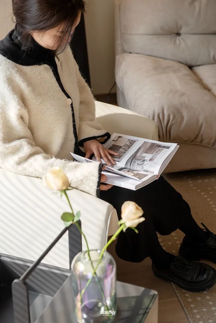设计选材:在用材方面设计师大量的选择、反复的对比。踩着柔和的旋律,迎着和煦的暖阳,会客厅因光影、色彩、纹理的交融充满生机,软糯的配色拂去过量的焦虑,春日微风徐徐,卷动了纱幔,也恬淡了心境,阳光倾洒,坐在螃蟹椅上翻书,感受时间的游走,肌理、质感、韵律,一切都抒写在沉默的留白里。