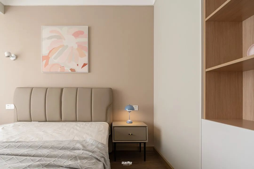 4、轻轻拨开岁月的面纱,指尖触动幸福的遗珠。设计师在主卧进门处化零为整,在保证主卧衣帽间有足够的使用空间时“让”出一隅给到隔壁的儿童房,这样不仅能优化主卧的空间功能及私密性,也为隔壁儿童房“补给”收纳。