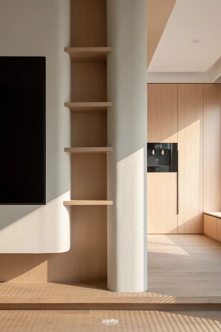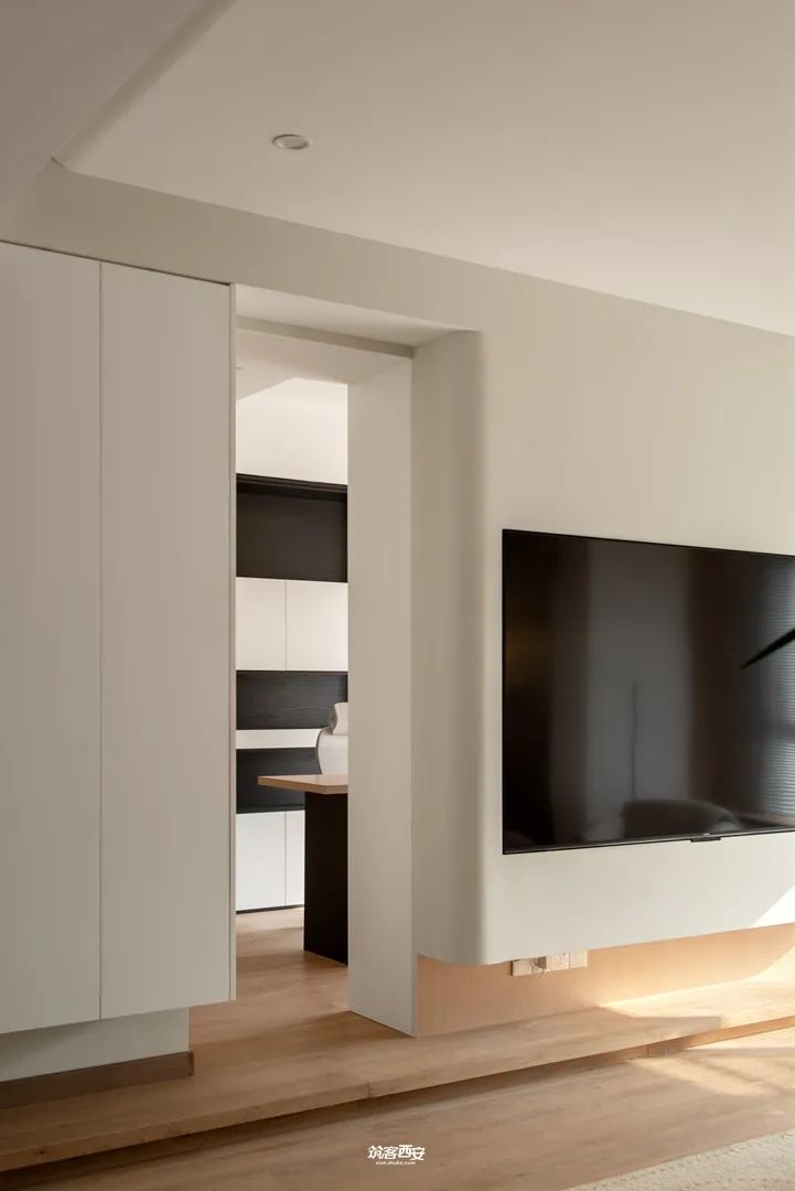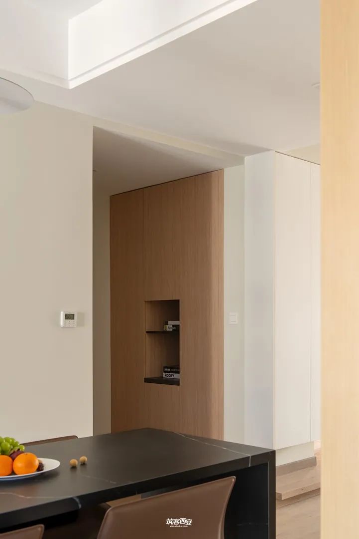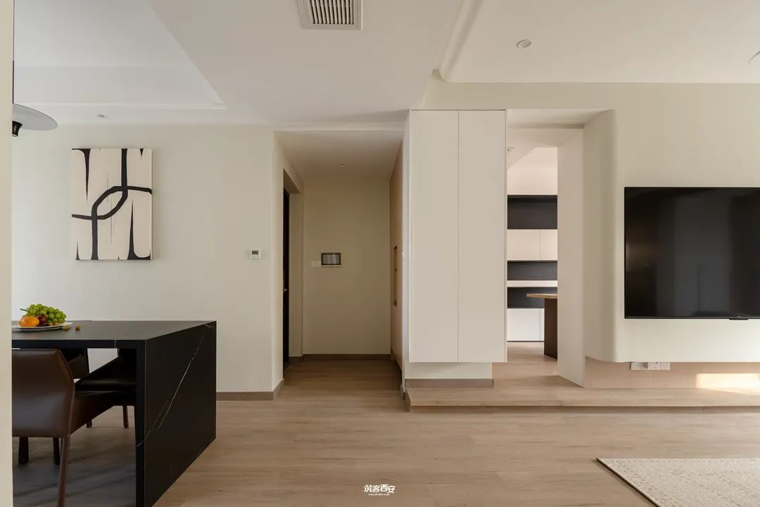 2、设计师利用入口处的柜体对原本突兀的墙体进行一种“包裹”,没有削弱面积给视觉的延伸感的同时挺拔了整个空间,分割形成动线,衍生新的路径使空间愈发多了些行走的趣味。
