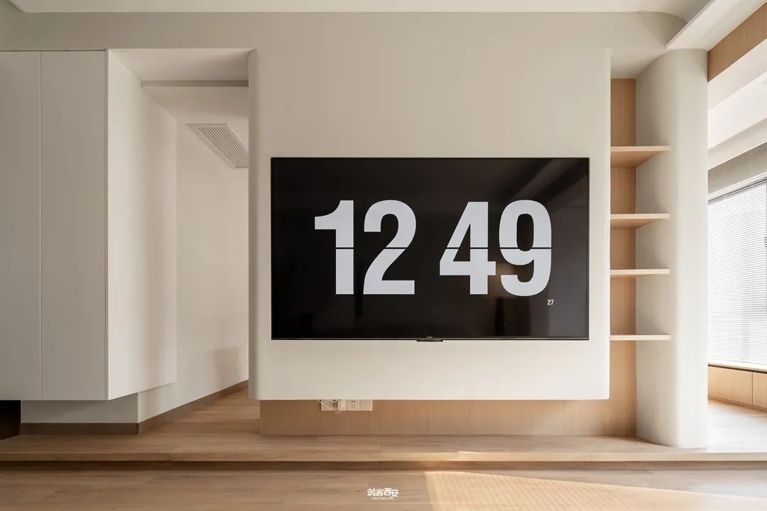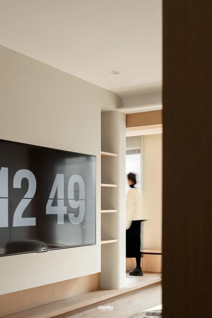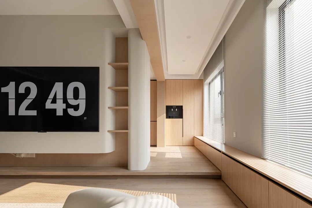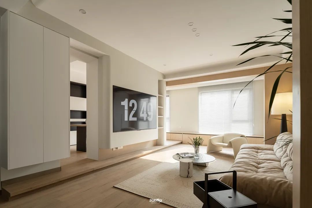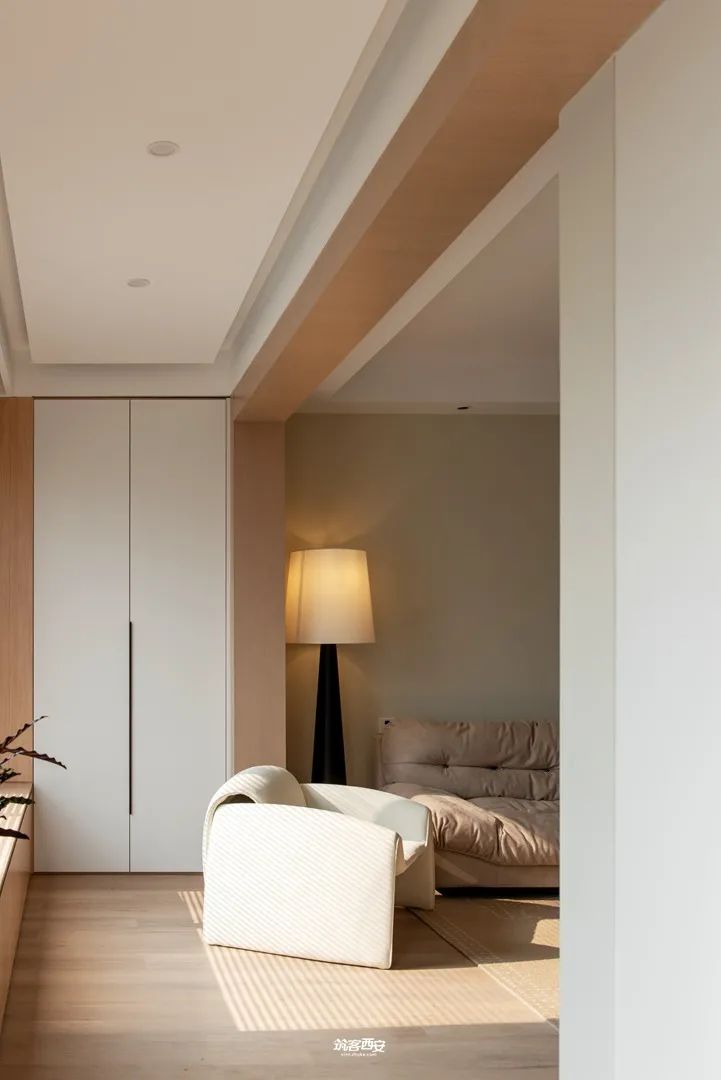 2、设计师利用入口处的柜体对原本突兀的墙体进行一种“包裹”,没有削弱面积给视觉的延伸感的同时挺拔了整个空间,分割形成动线,衍生新的路径使空间愈发多了些行走的趣味。