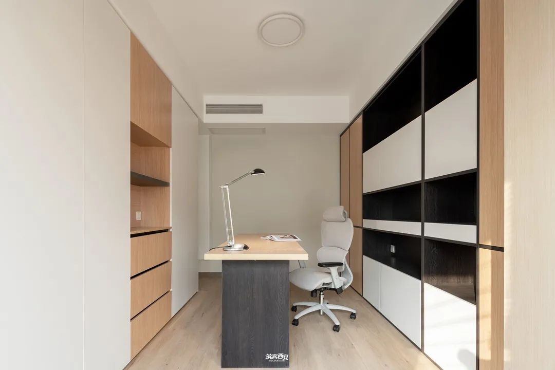 空间意境:设计师借由光引导空间和情绪转折,通过隔断、错落等手法,演绎动与静,将原本的卧室空间与客厅打通,被抬高的空间,设计师打造成男主人待客谈心的书房,实现了书房与客厅空间的互动与串联;侧面打通的设计,出其不意,既保留了客厅天际线的完整,又增加了空间的灵动轻巧。