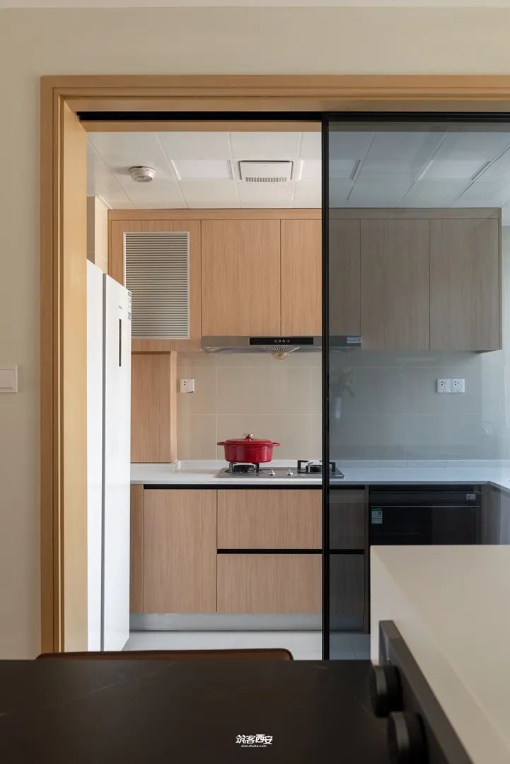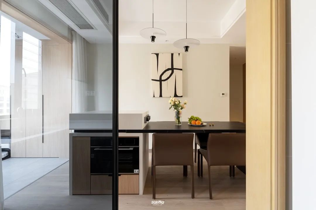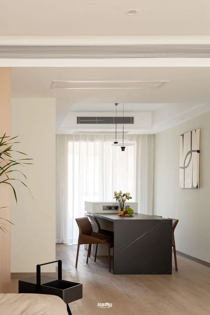 3、延展至餐厅的木地板,将餐厅与客厅相连到一起,消除了空间区域性的阻隔,将美食与生活串联。岩板岛台和桌面的组合,在满足一家人用餐需求的同时,女主人的烘焙能力也尽可展示,非用餐时段,餐厅随时能够承载聚会的功能。三五好友小聚,喝茶、游戏、聊天,也具备了更灵活的互动空间。
