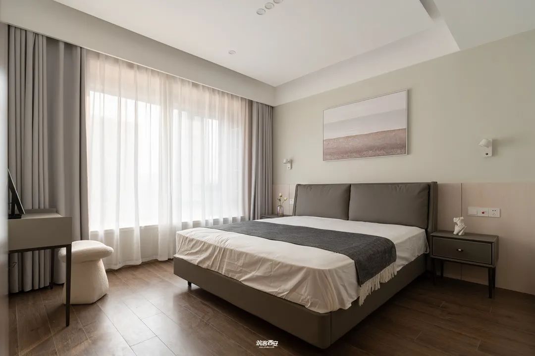落地窗总是有方法将空间与心境变得明亮起来,向阳一侧的联通收纳脚柜,既可小憩休息也足以收纳日常用品,空间的质感外表平静,却承载了生活里的丰富,对于空间来说,感觉对了,一切都是礼物。