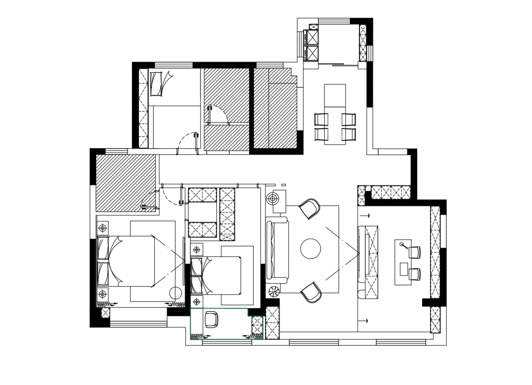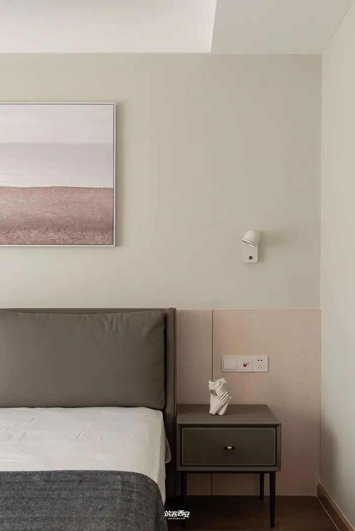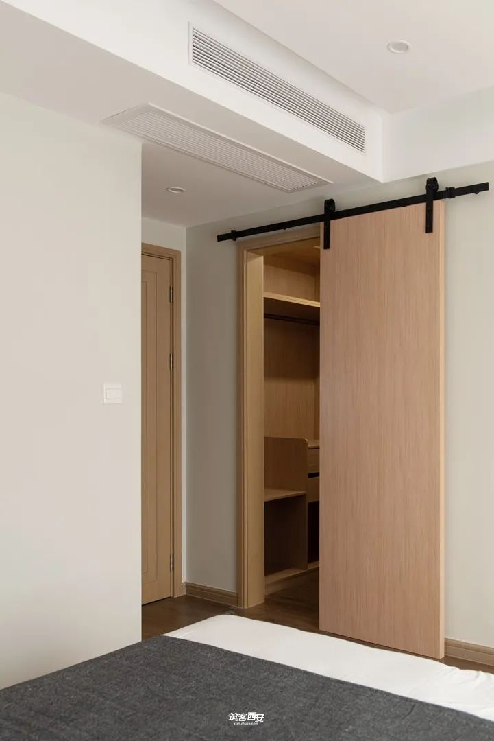 5、卧室的设计以简洁、柔软为基调,朴质的玉簪绿背景墙泛起淡淡的优雅与宁静。衣帽间采用定制谷仓门,通过上方的滑轨和滑轮来将门板与墙面连接,既无卫生死角,也让衣帽间与主卧基调高度融合,最日常的空间,放弃神性,回归私宅属性,才能让居住者获得归属。