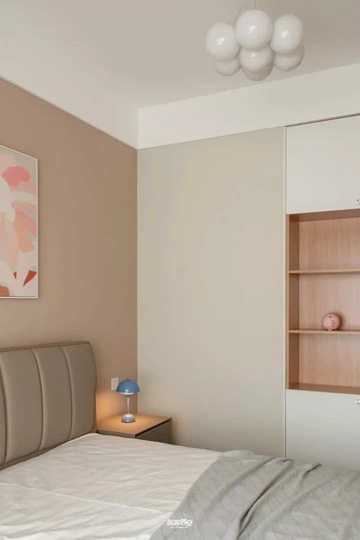 6、只有一次的童年,不能马虎将就,小公主的房间总是那么的香甜,从色彩中丰盈理想的生活图景,将原本联通客厅阳台的通道转而做成一个双面柜,私密性得到很好的保护的同时也补充了整个空间的收纳,这一方属于她的天地,承载着最纯净梦想。 -