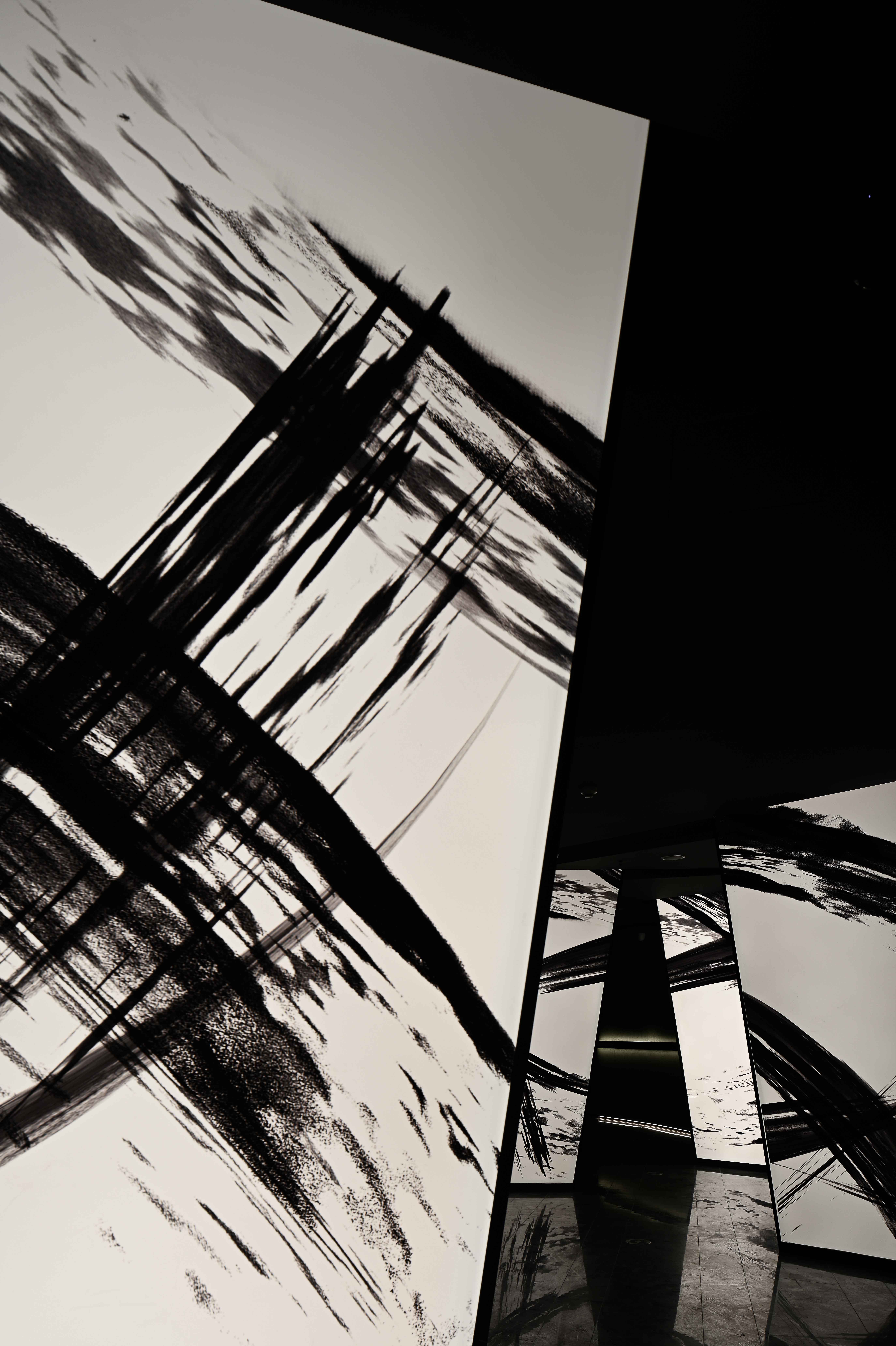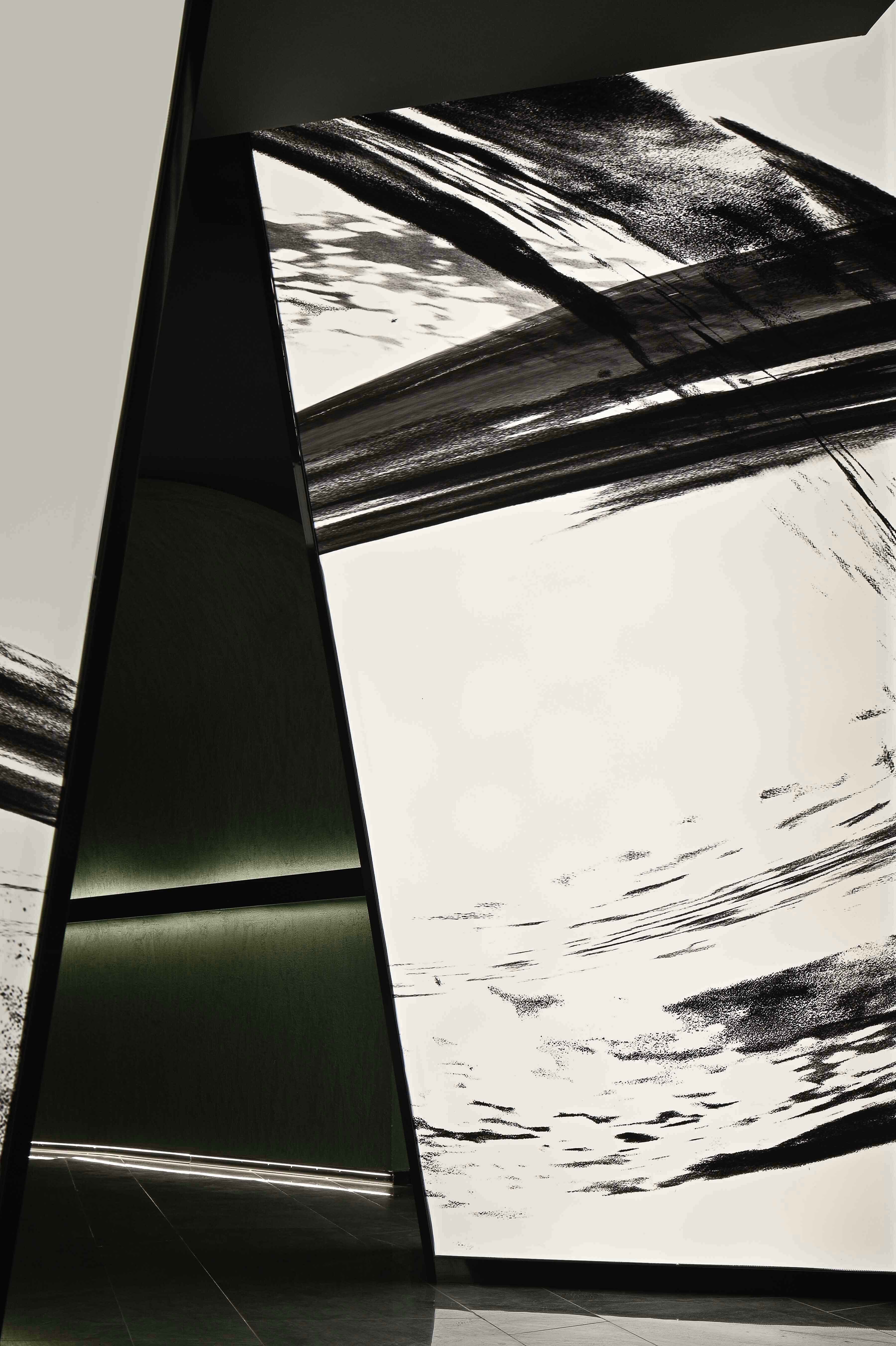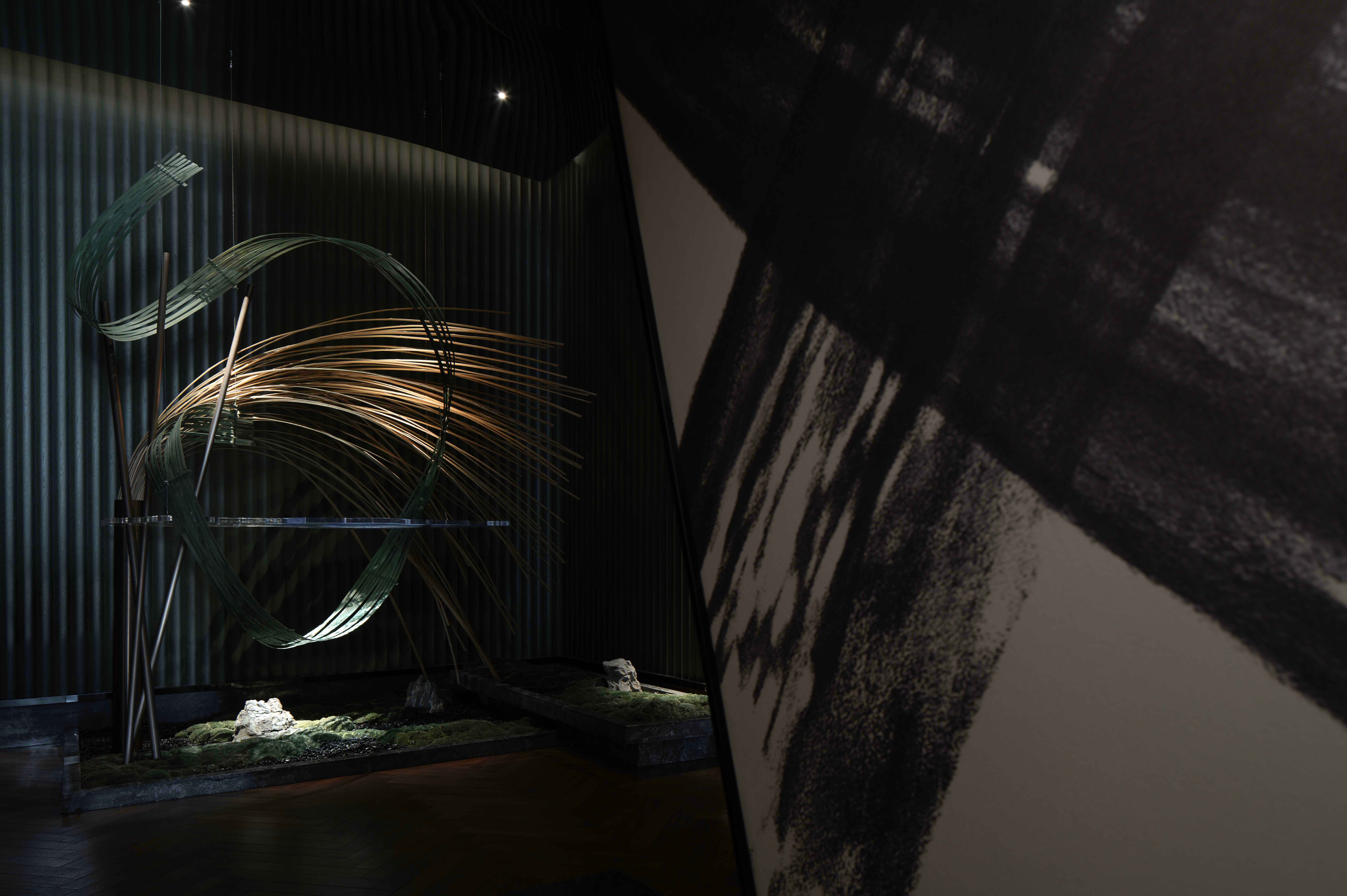 设计选材:空间以“林间侠影”为媒,静态的“竹”在“侠客”的激战中破开、重构。而水墨影像,是辗转腾挪的“侠客”残影。以虚写实,以意化形。