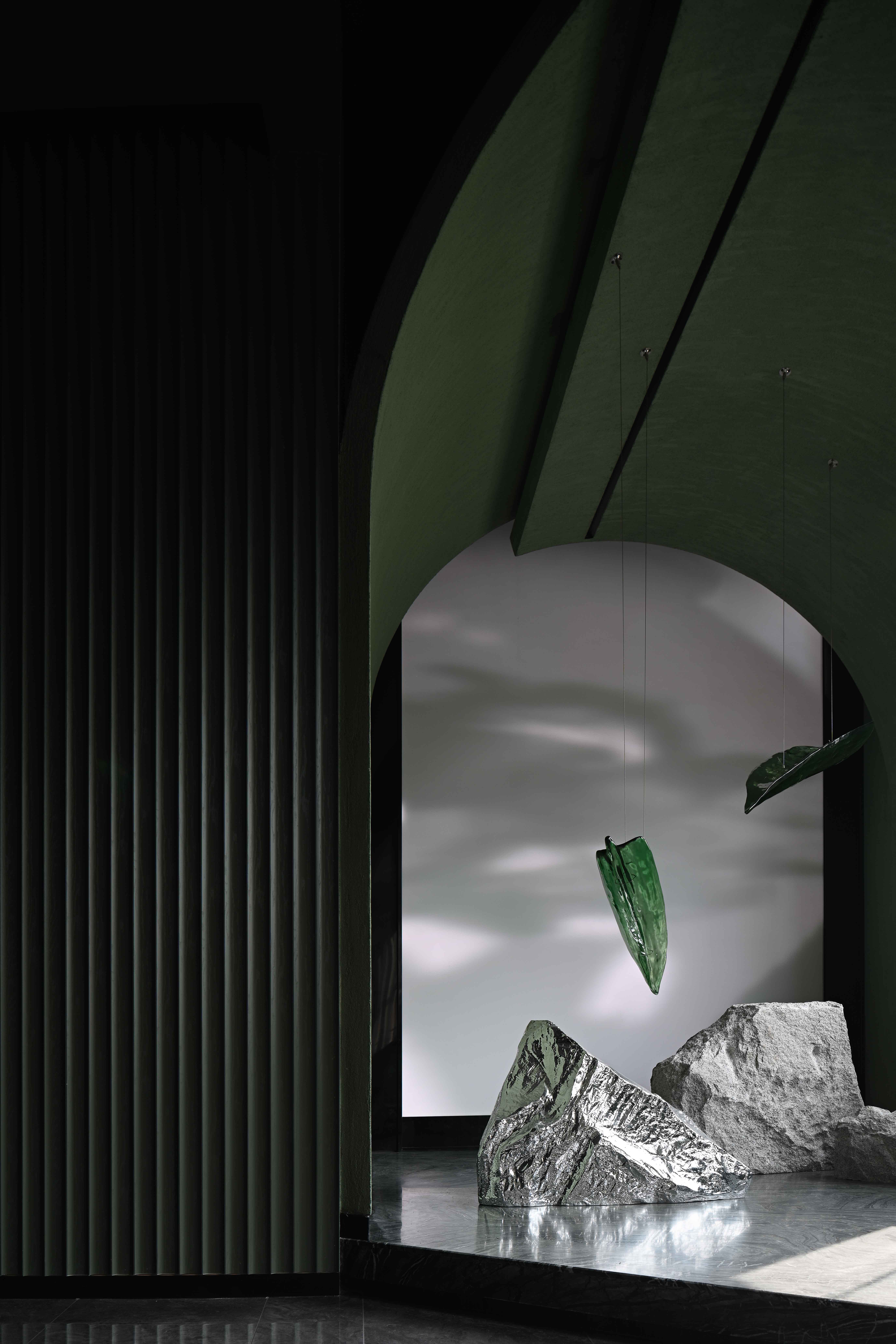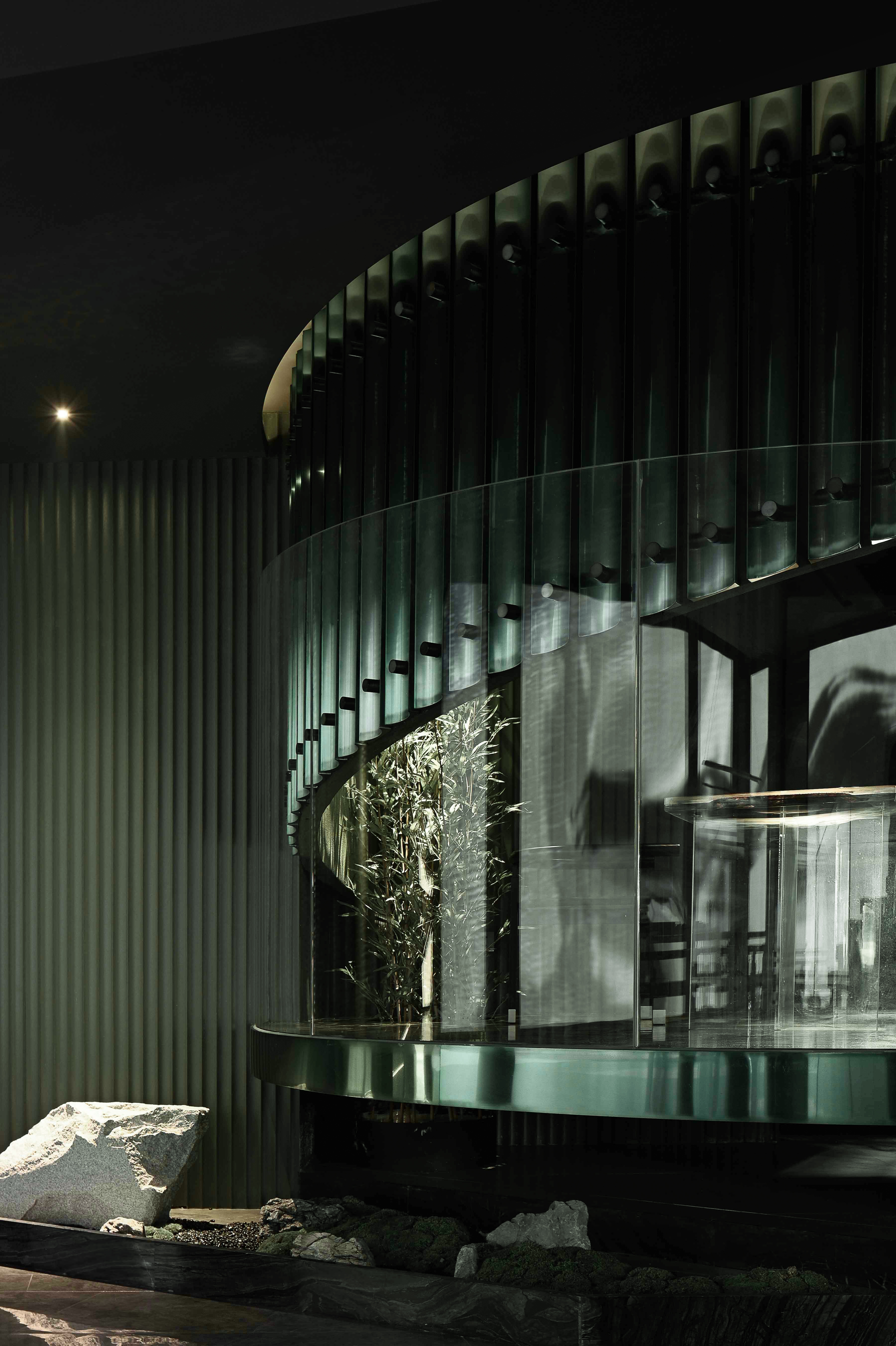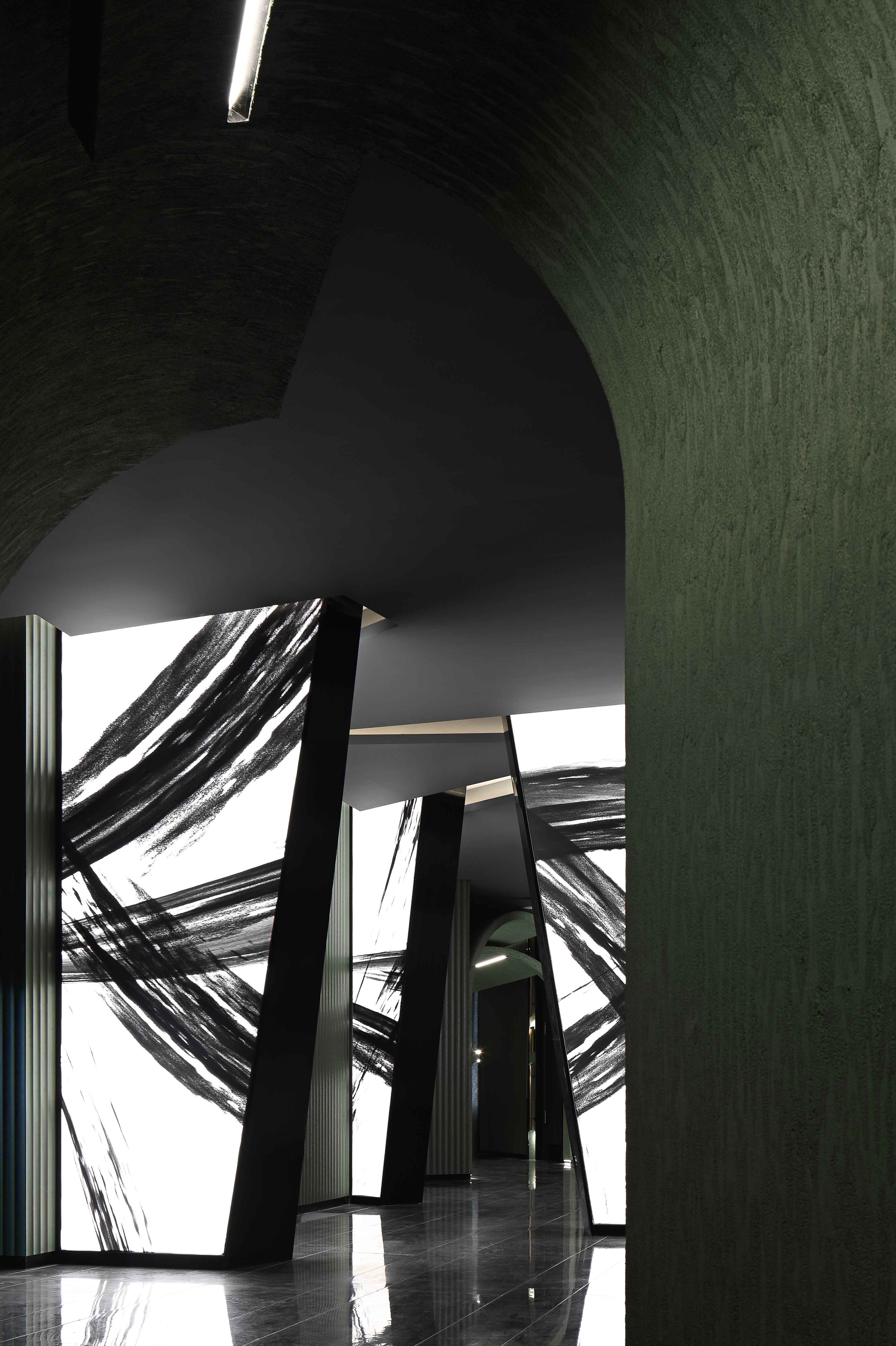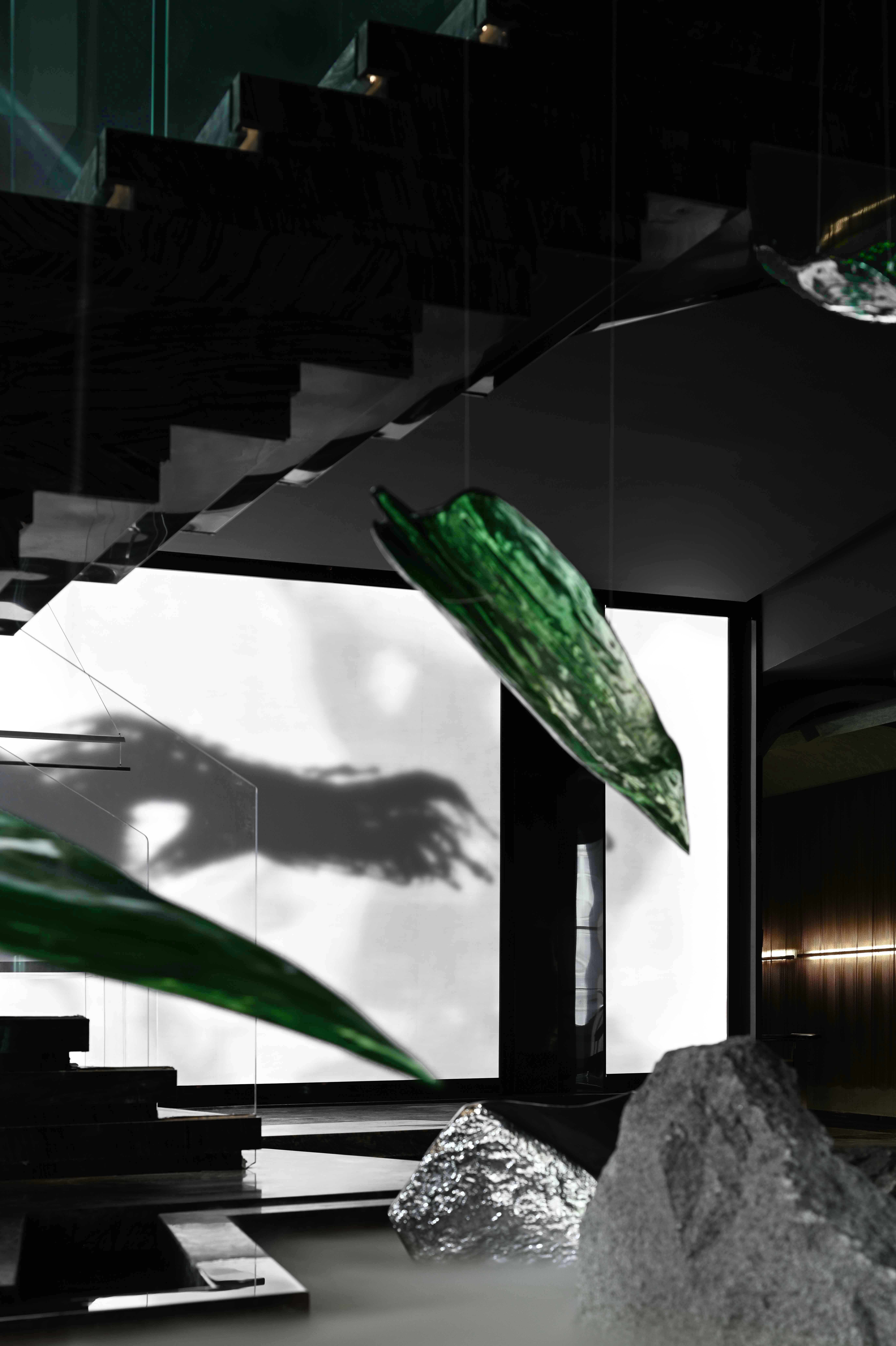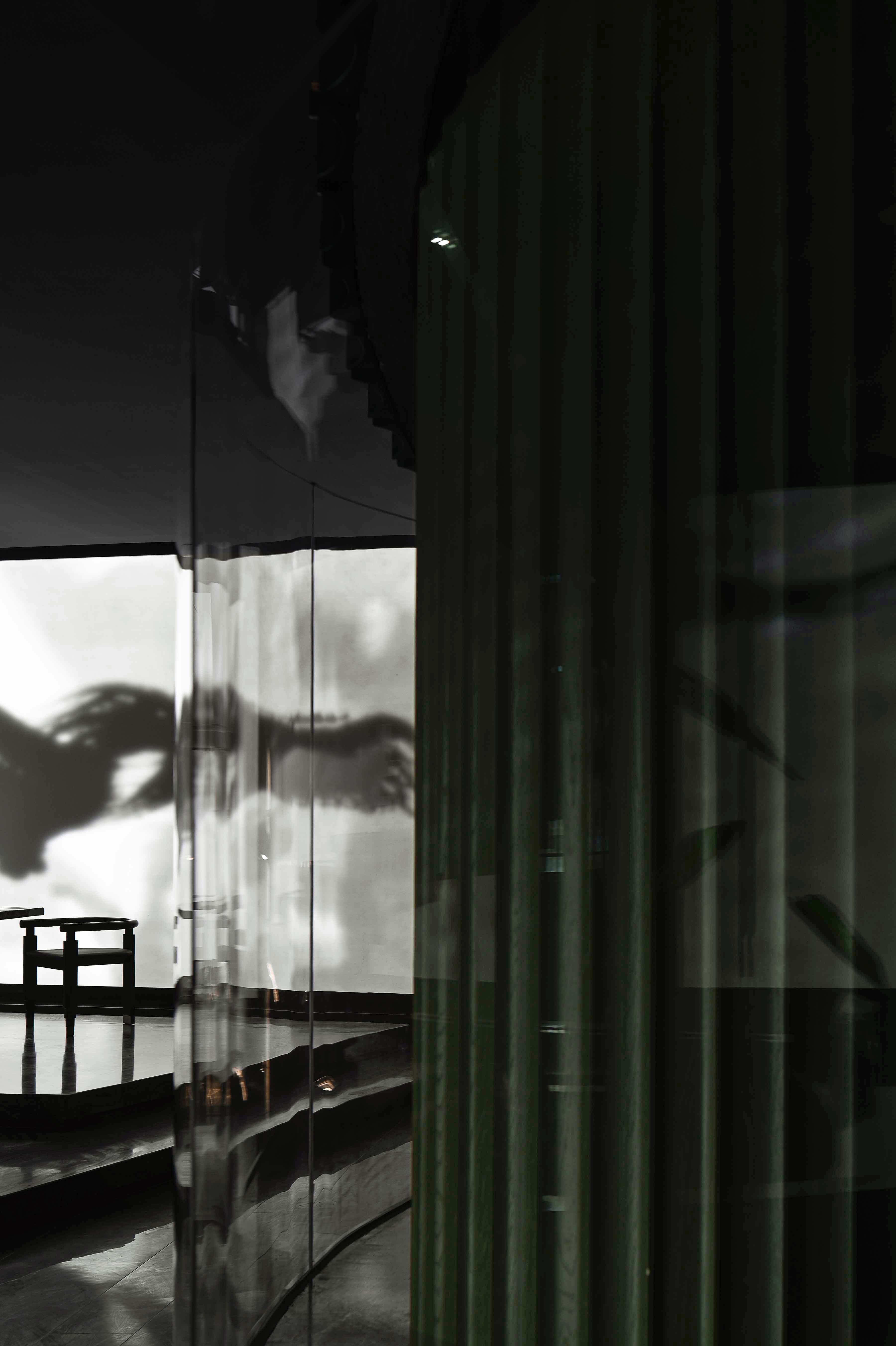 空间布局:入口过道的圆拱形,是交锋时破开的竹节;一根根斩落的竹竿矗立在空间中,形成线与面的对比;散落在空间中的玻璃叶片软装,是争斗时飞舞的竹叶;而大堂里巨大的水墨投屏,以虚写实,写意地描绘了侠客飞动的身影。最终,空间归于宁静的水面,平台上的透明茶桌椅,传递出宁静内敛的情绪,是不打不相识的惺惺相惜之情。