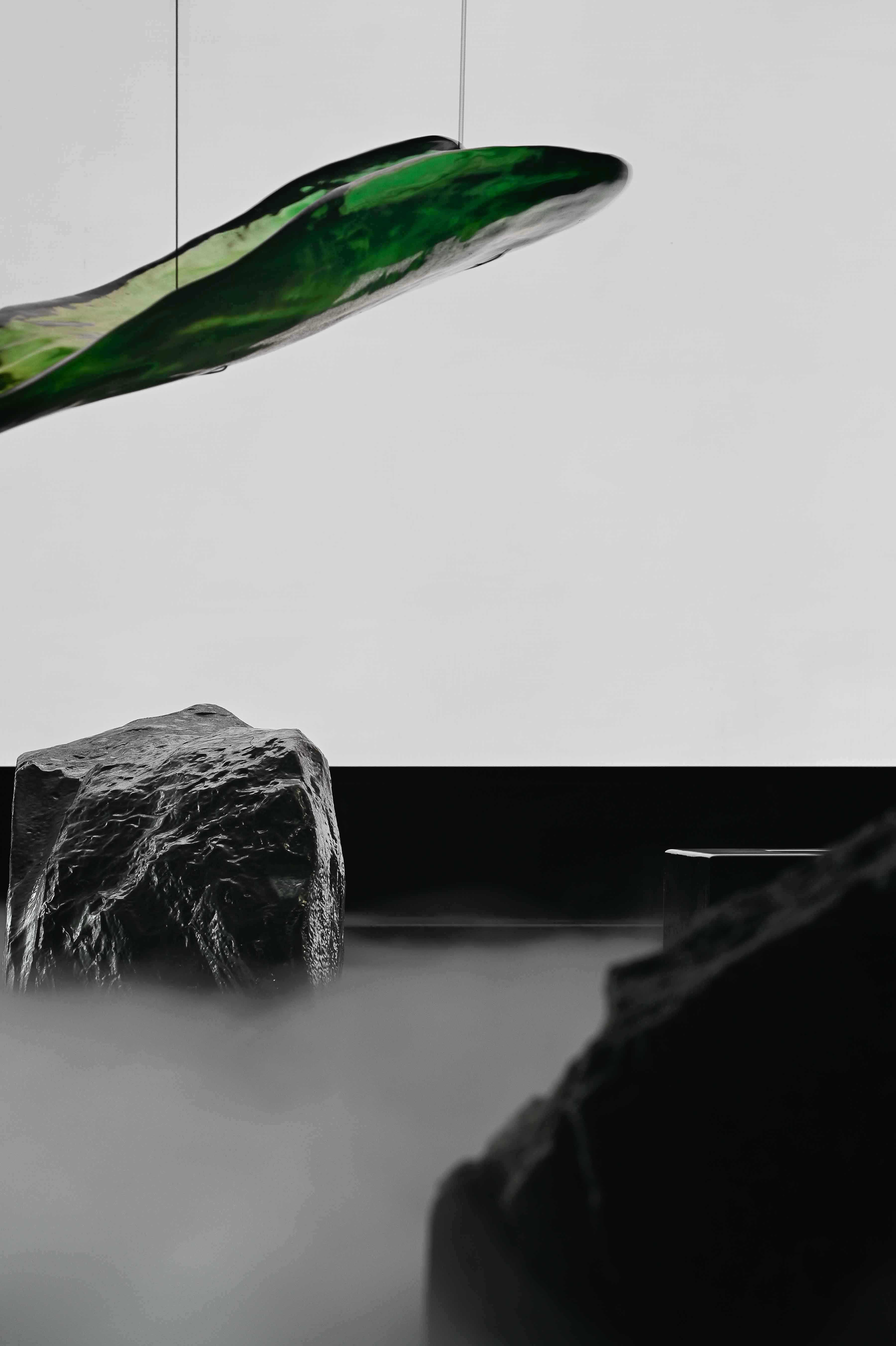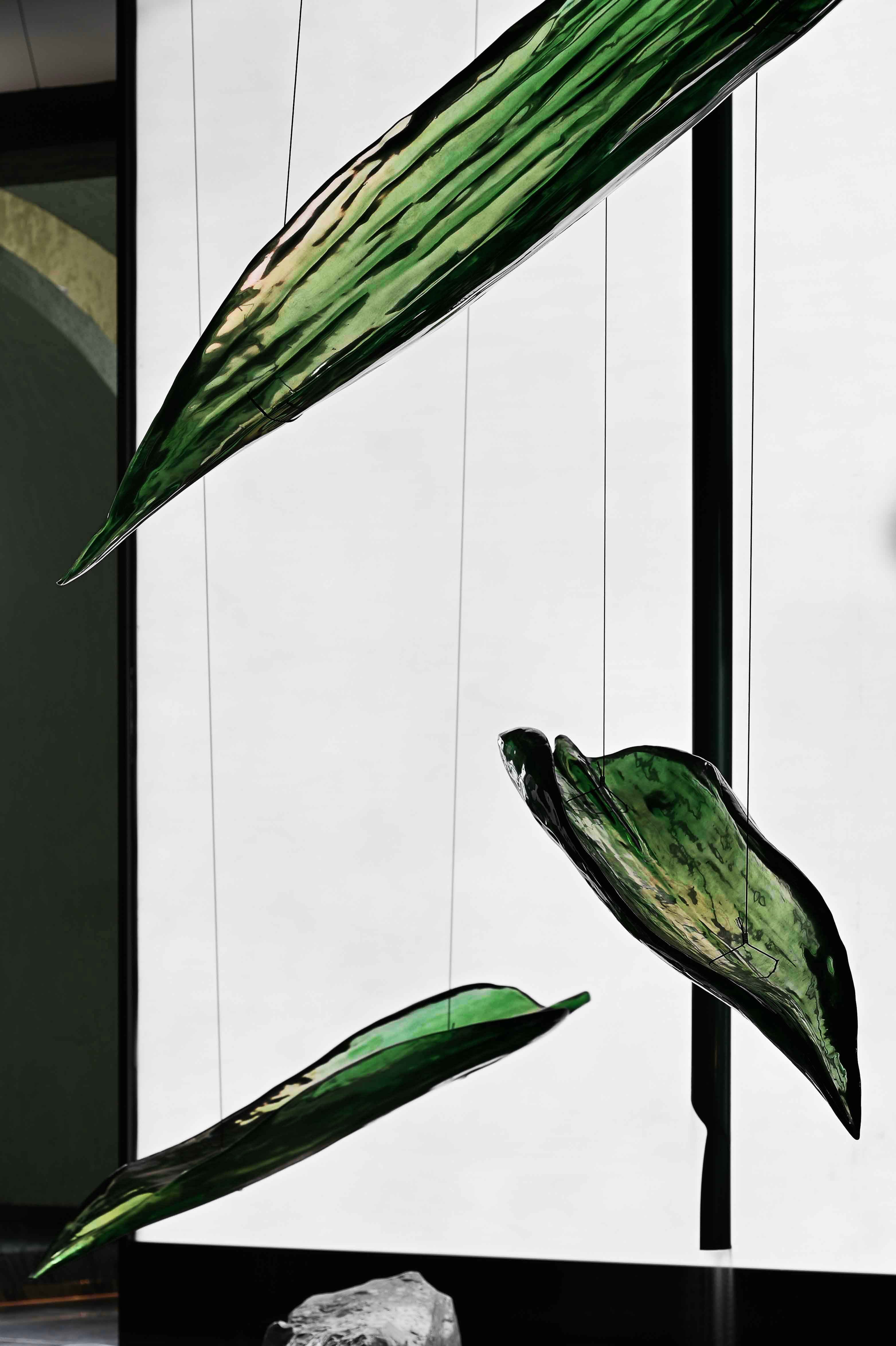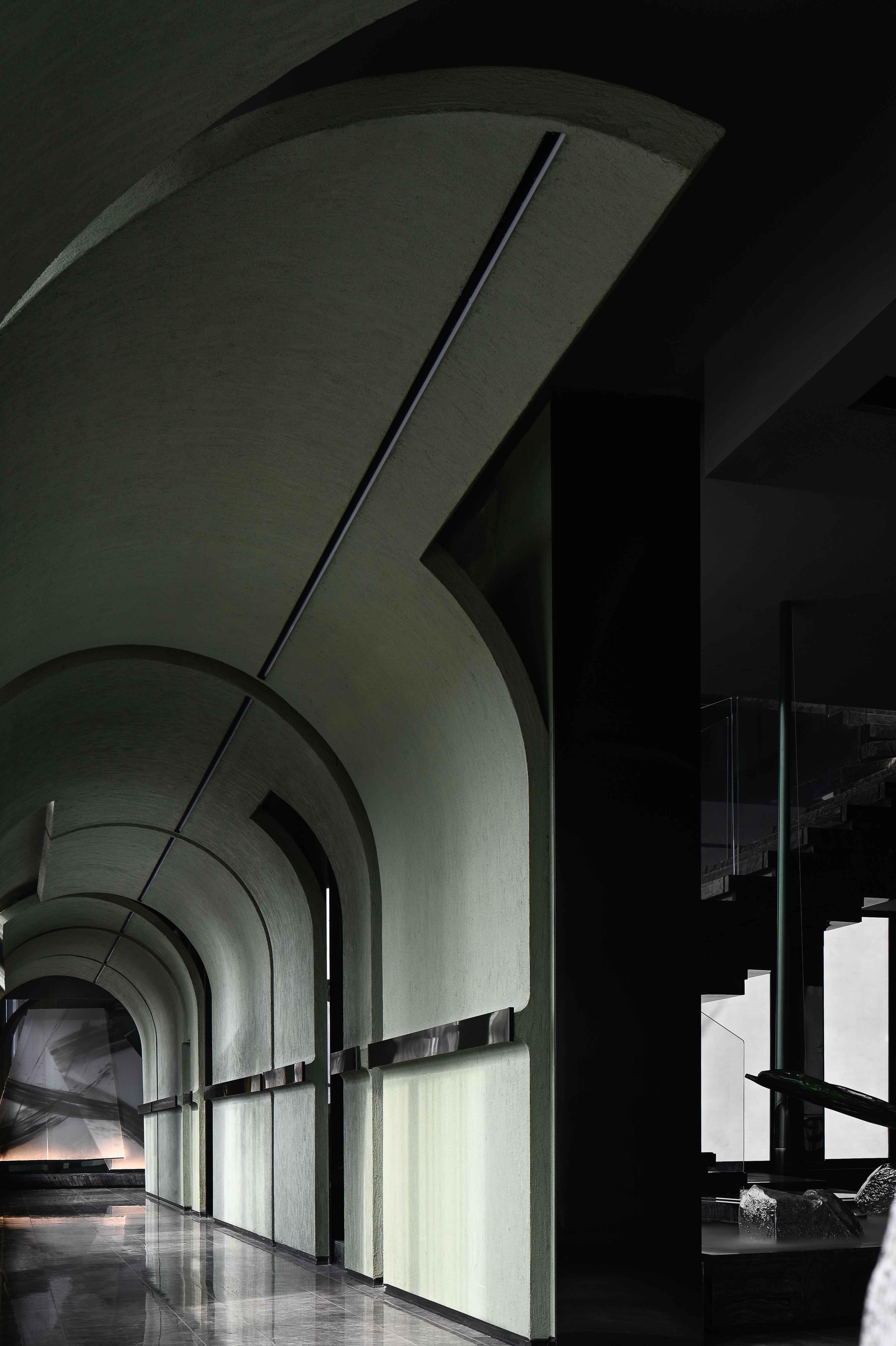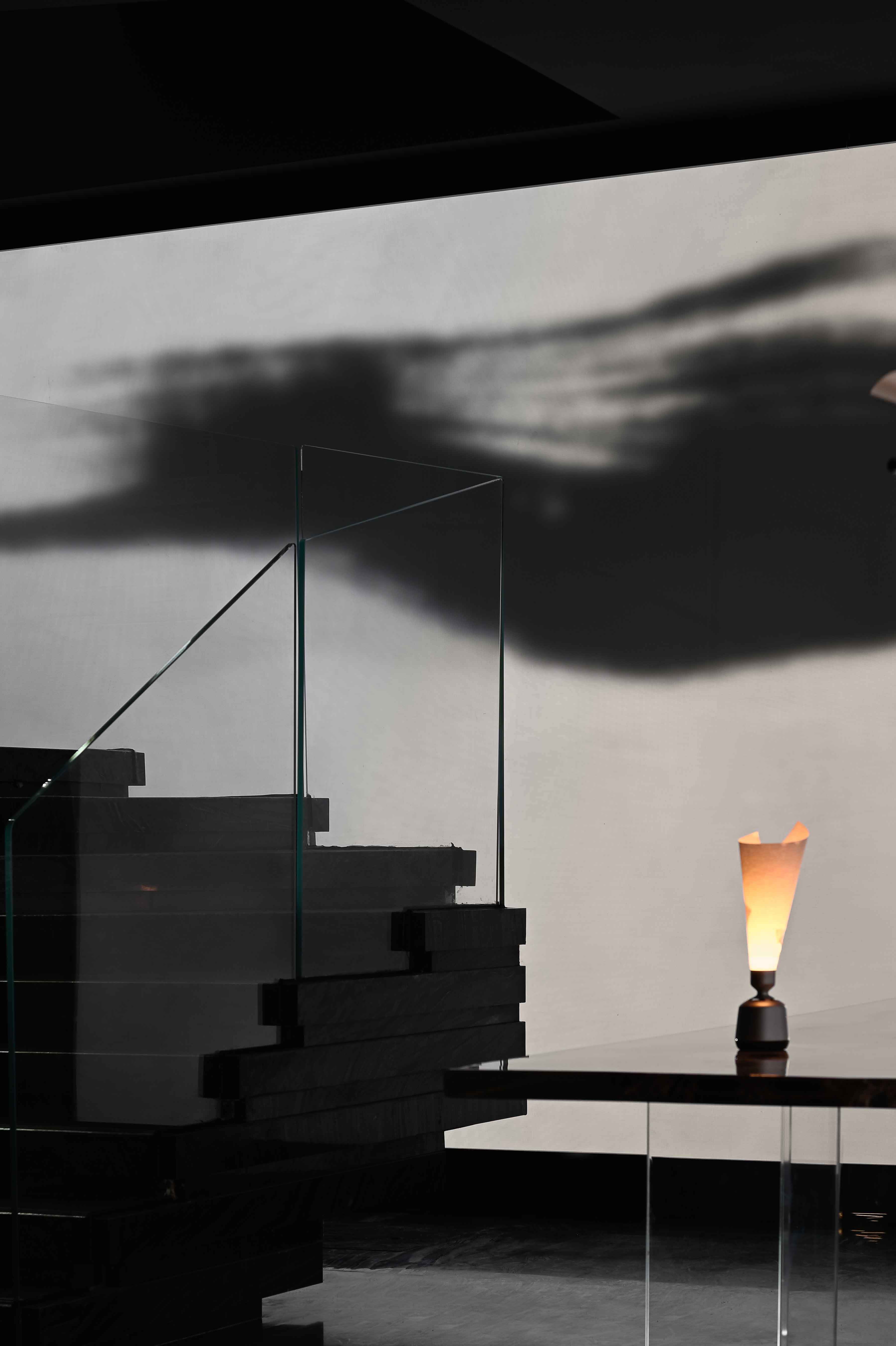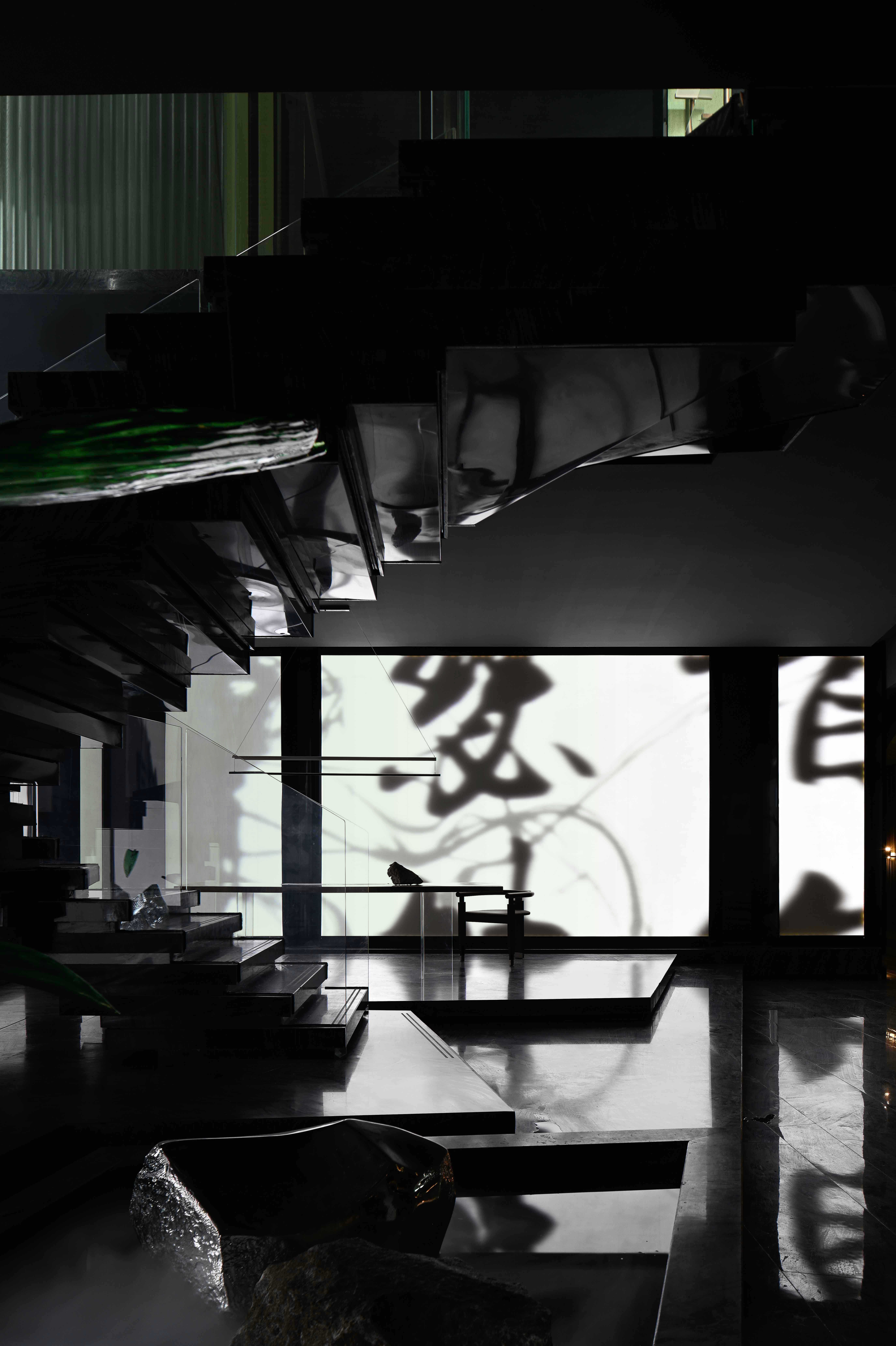 空间布局:入口过道的圆拱形,是交锋时破开的竹节;一根根斩落的竹竿矗立在空间中,形成线与面的对比;散落在空间中的玻璃叶片软装,是争斗时飞舞的竹叶;而大堂里巨大的水墨投屏,以虚写实,写意地描绘了侠客飞动的身影。最终,空间归于宁静的水面,平台上的透明茶桌椅,传递出宁静内敛的情绪,是不打不相识的惺惺相惜之情。