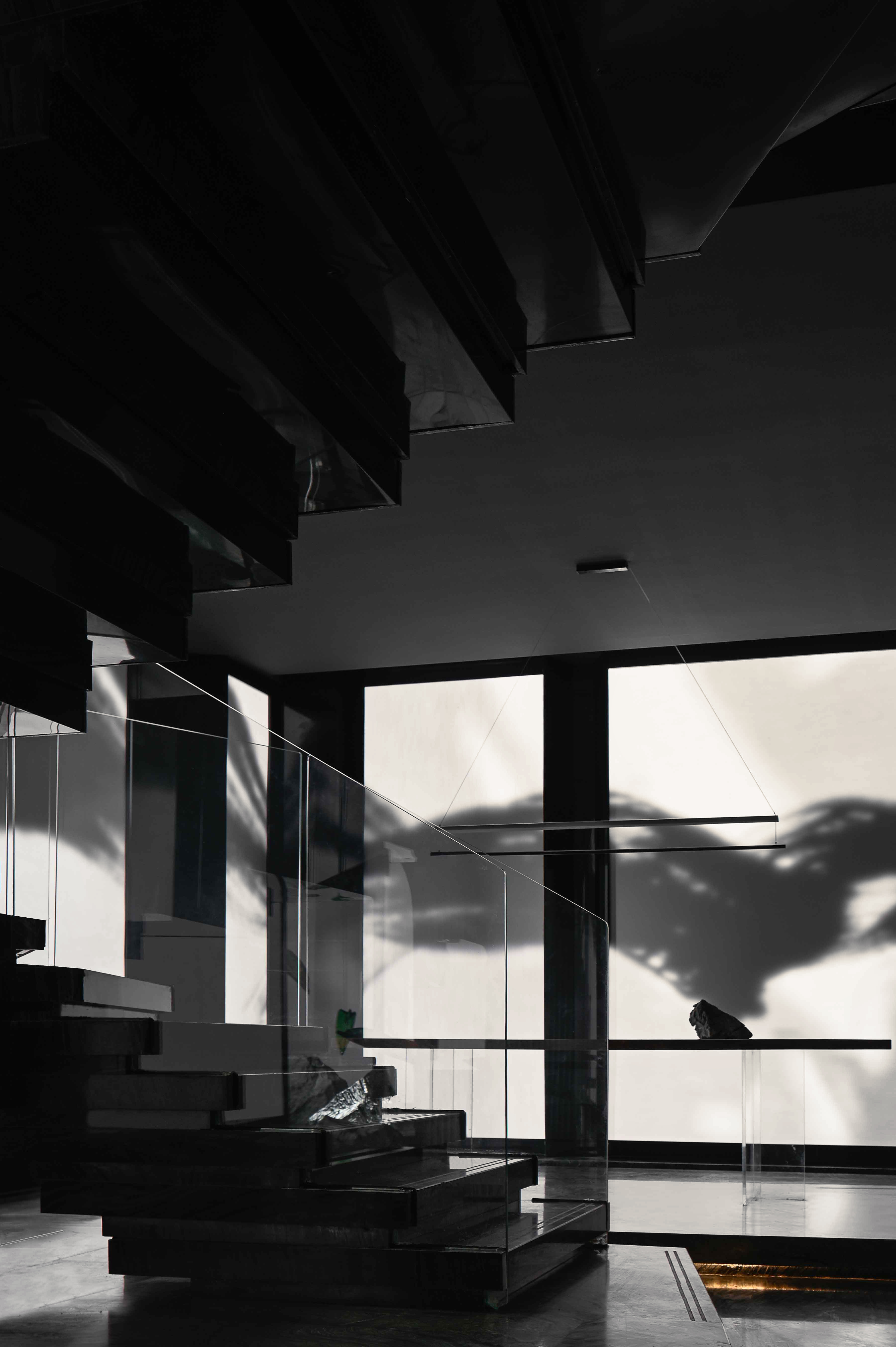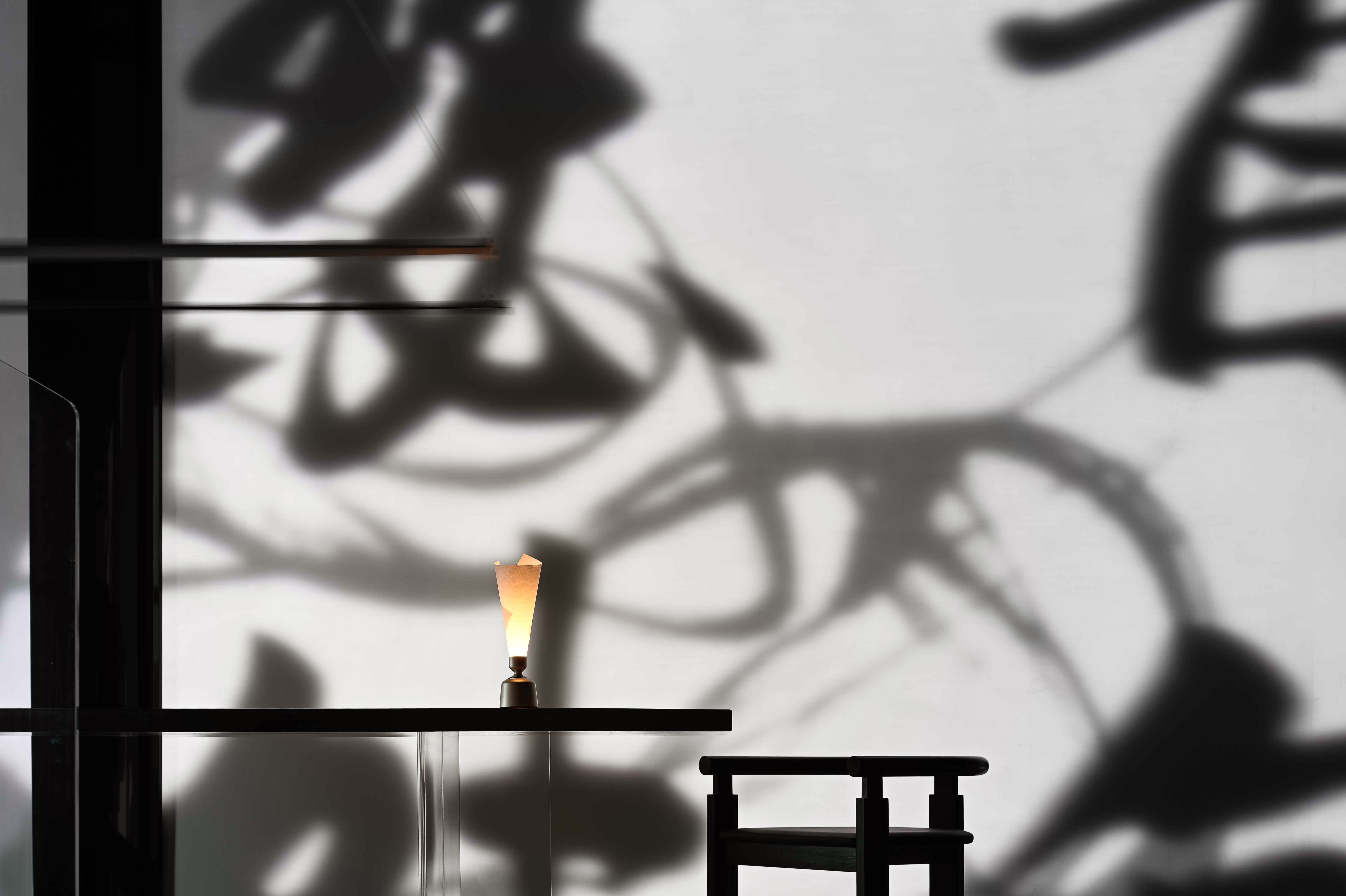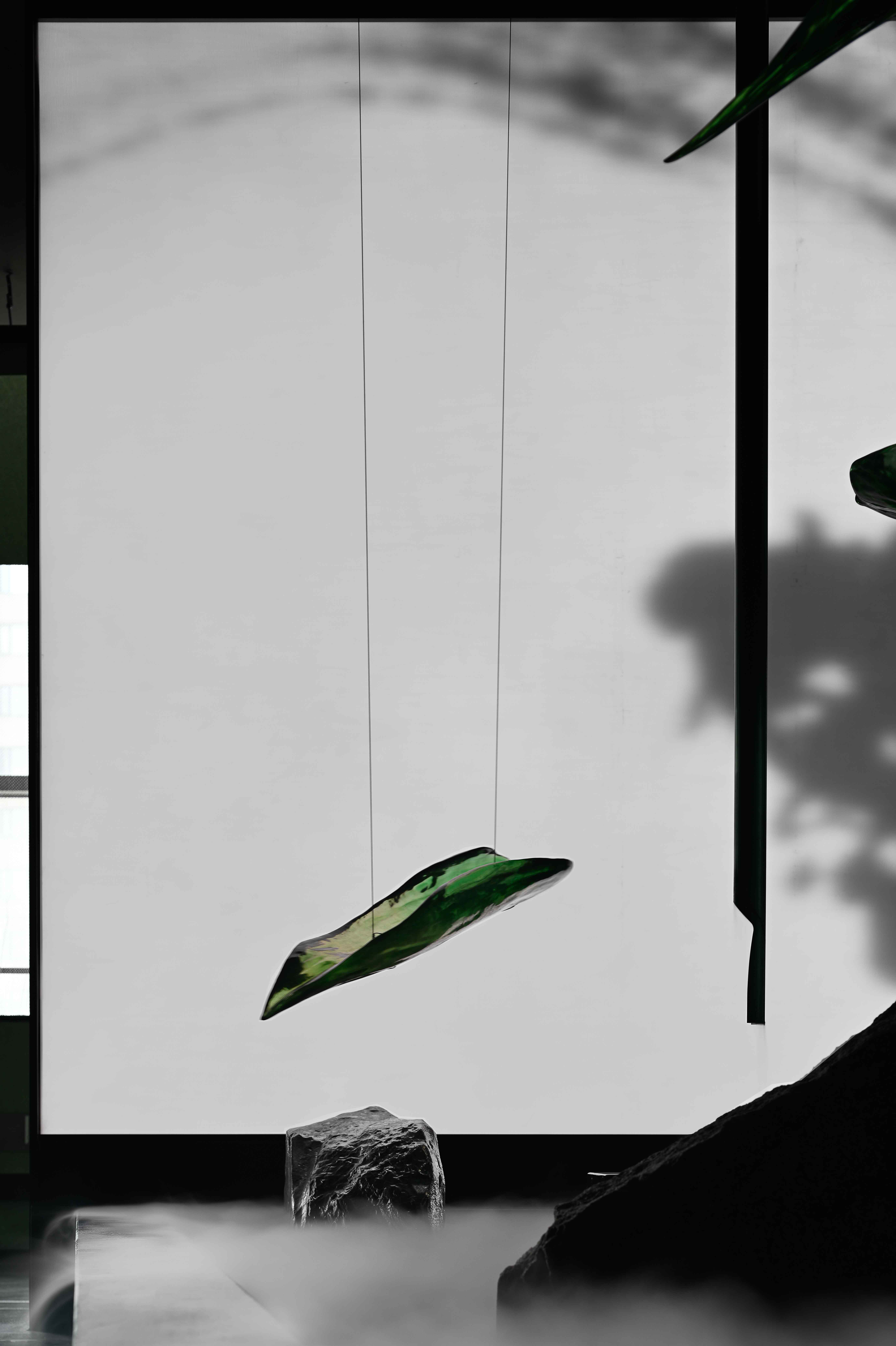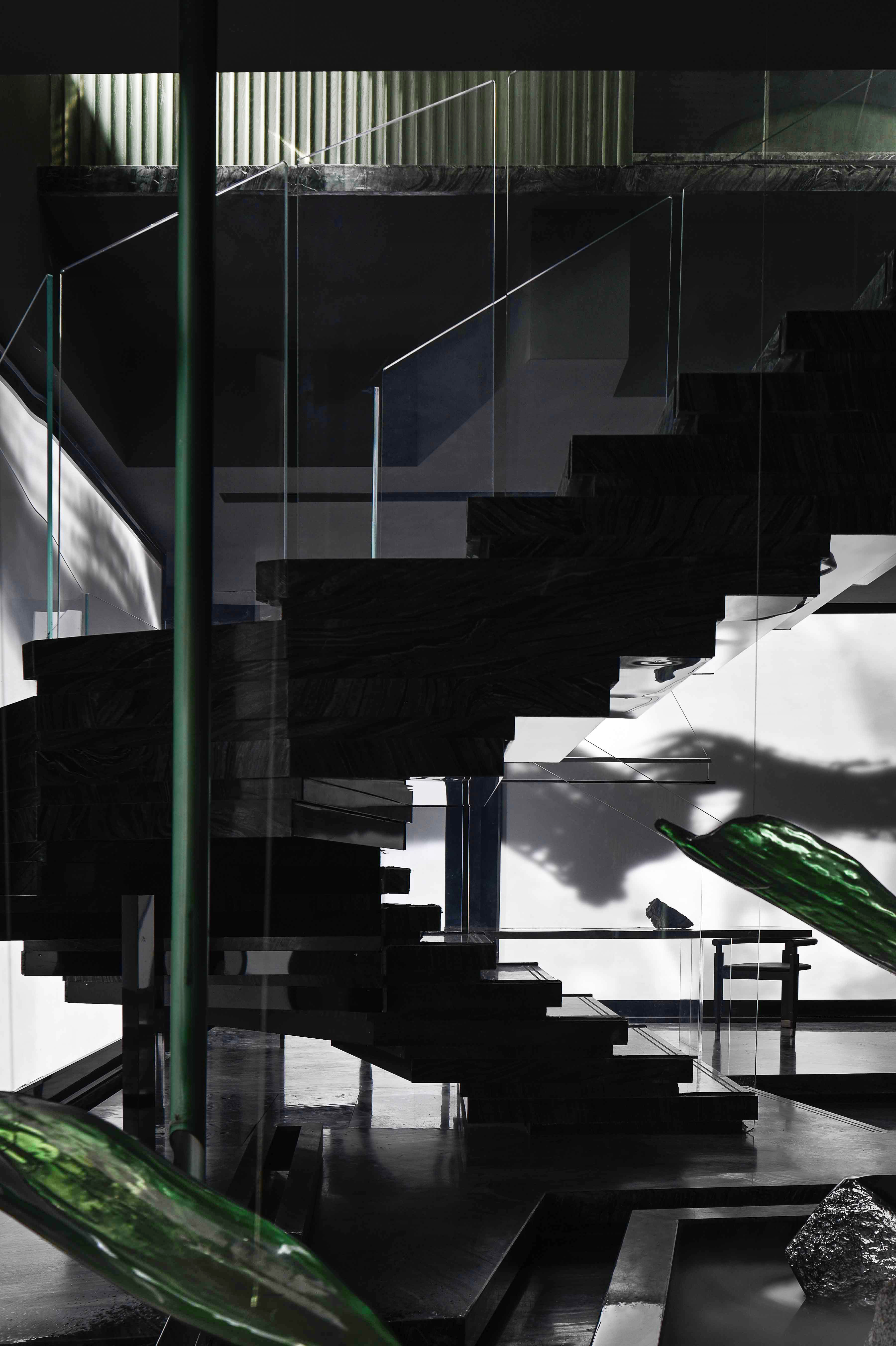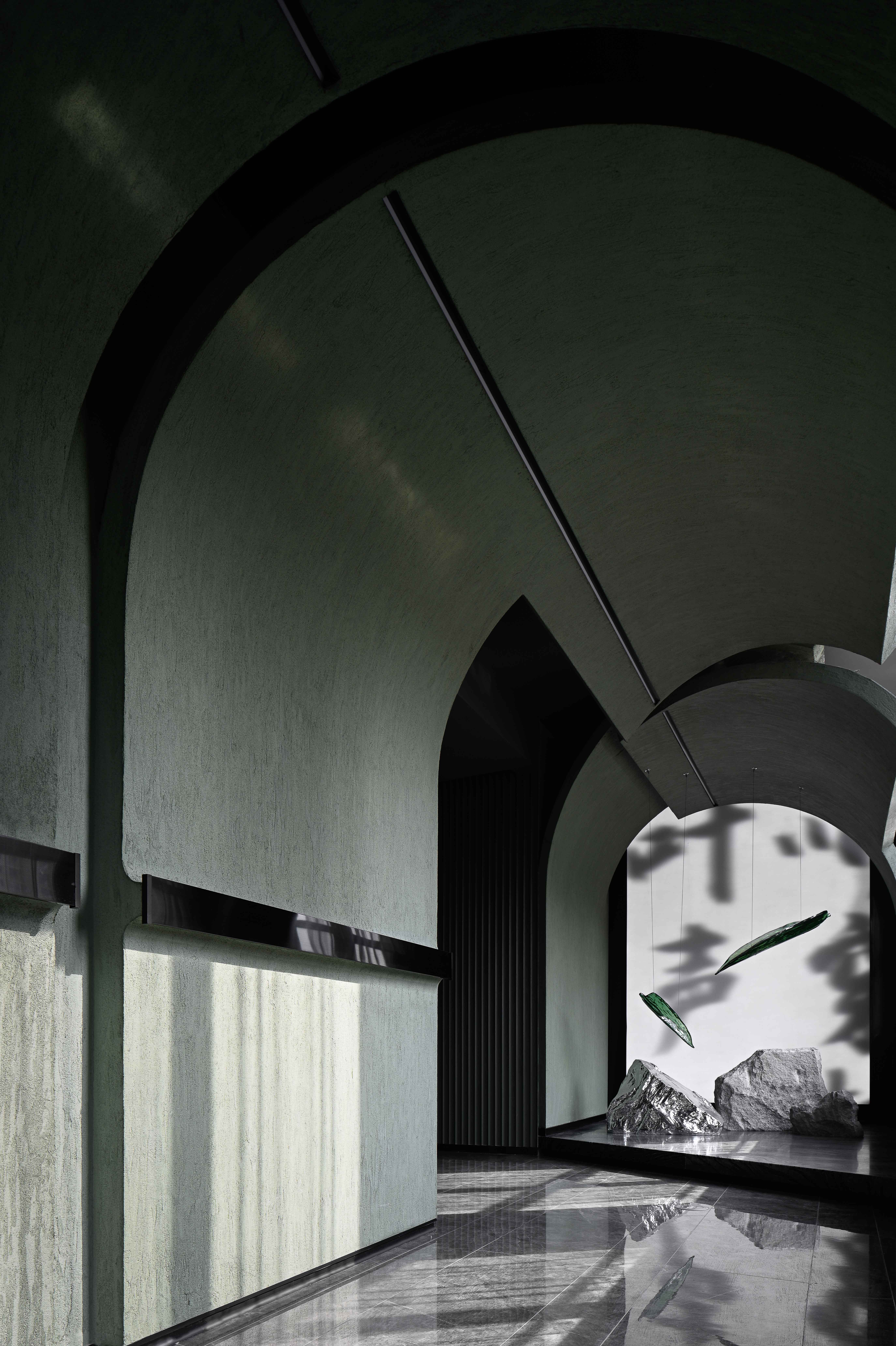 空间布局:入口过道的圆拱形,是交锋时破开的竹节;一根根斩落的竹竿矗立在空间中,形成线与面的对比;散落在空间中的玻璃叶片软装,是争斗时飞舞的竹叶;而大堂里巨大的水墨投屏,以虚写实,写意地描绘了侠客飞动的身影。最终,空间归于宁静的水面,平台上的透明茶桌椅,传递出宁静内敛的情绪,是不打不相识的惺惺相惜之情。