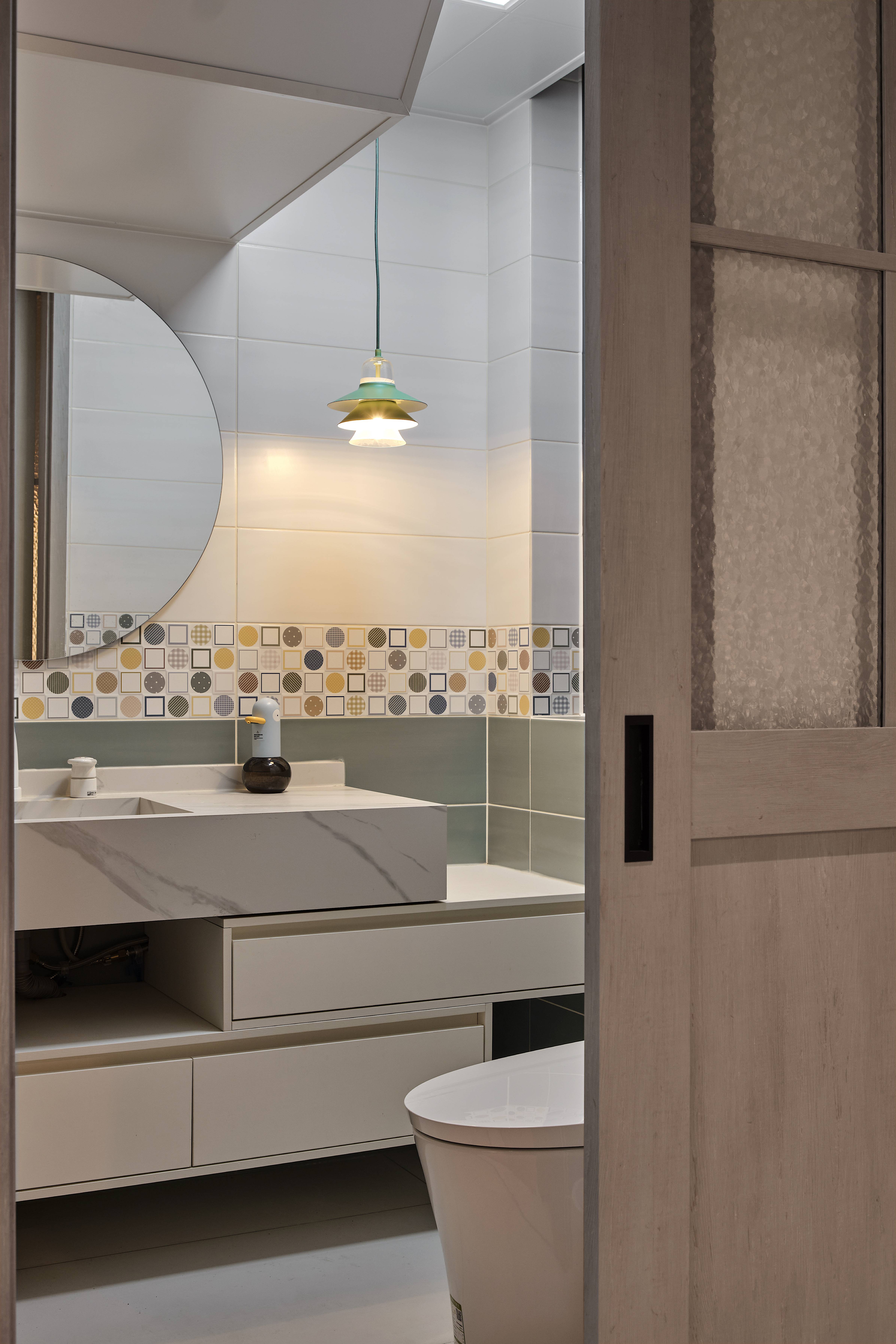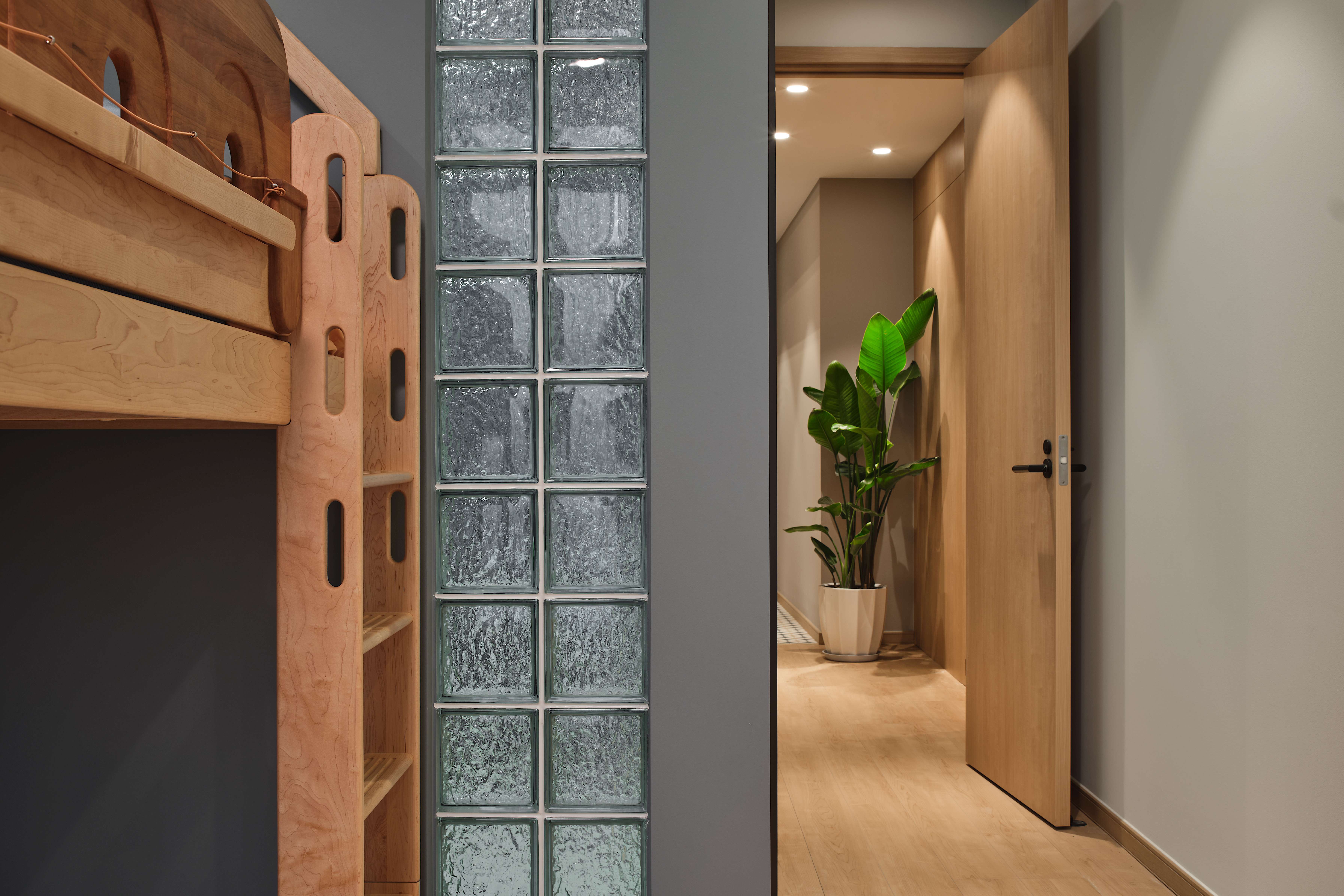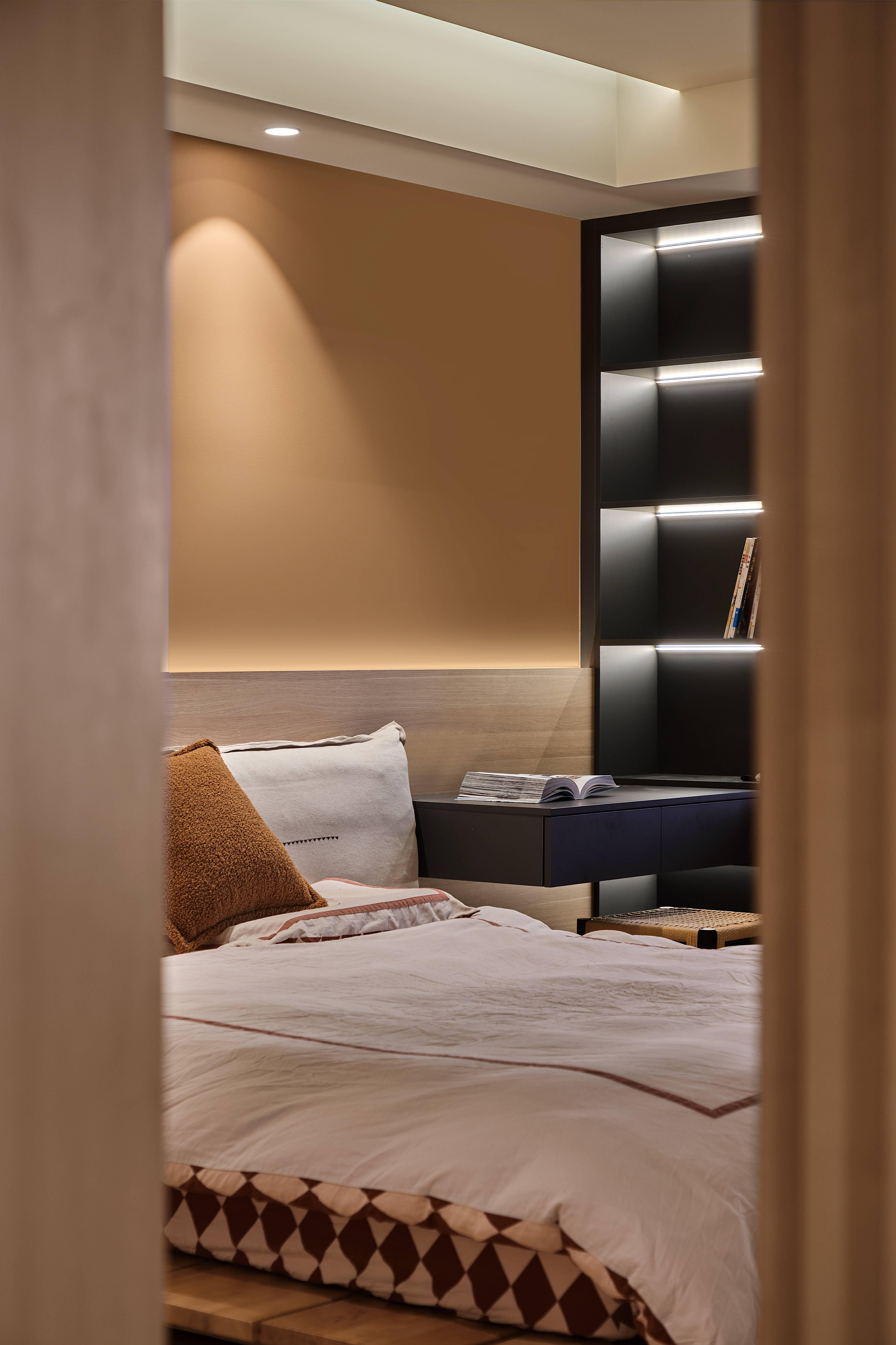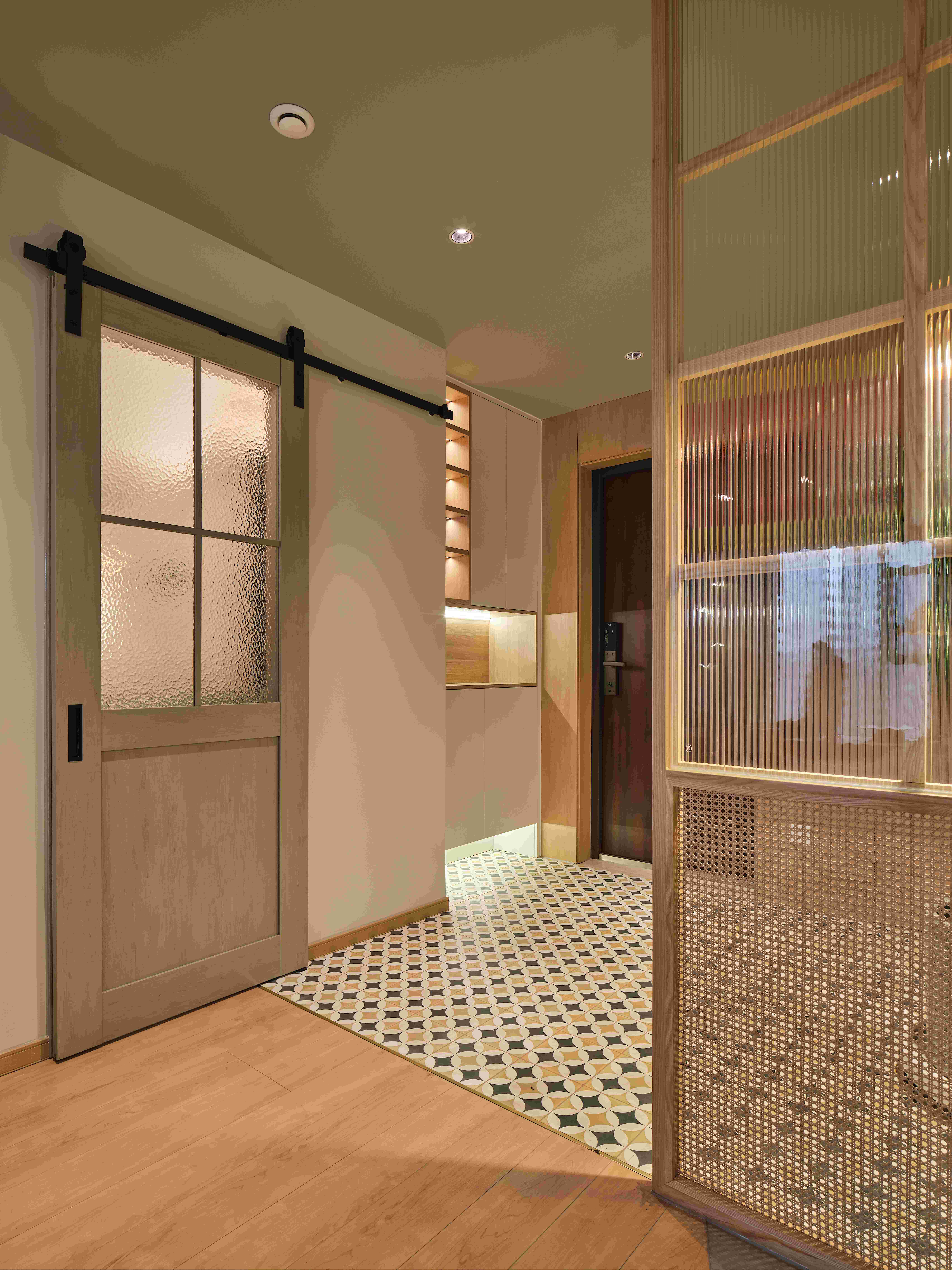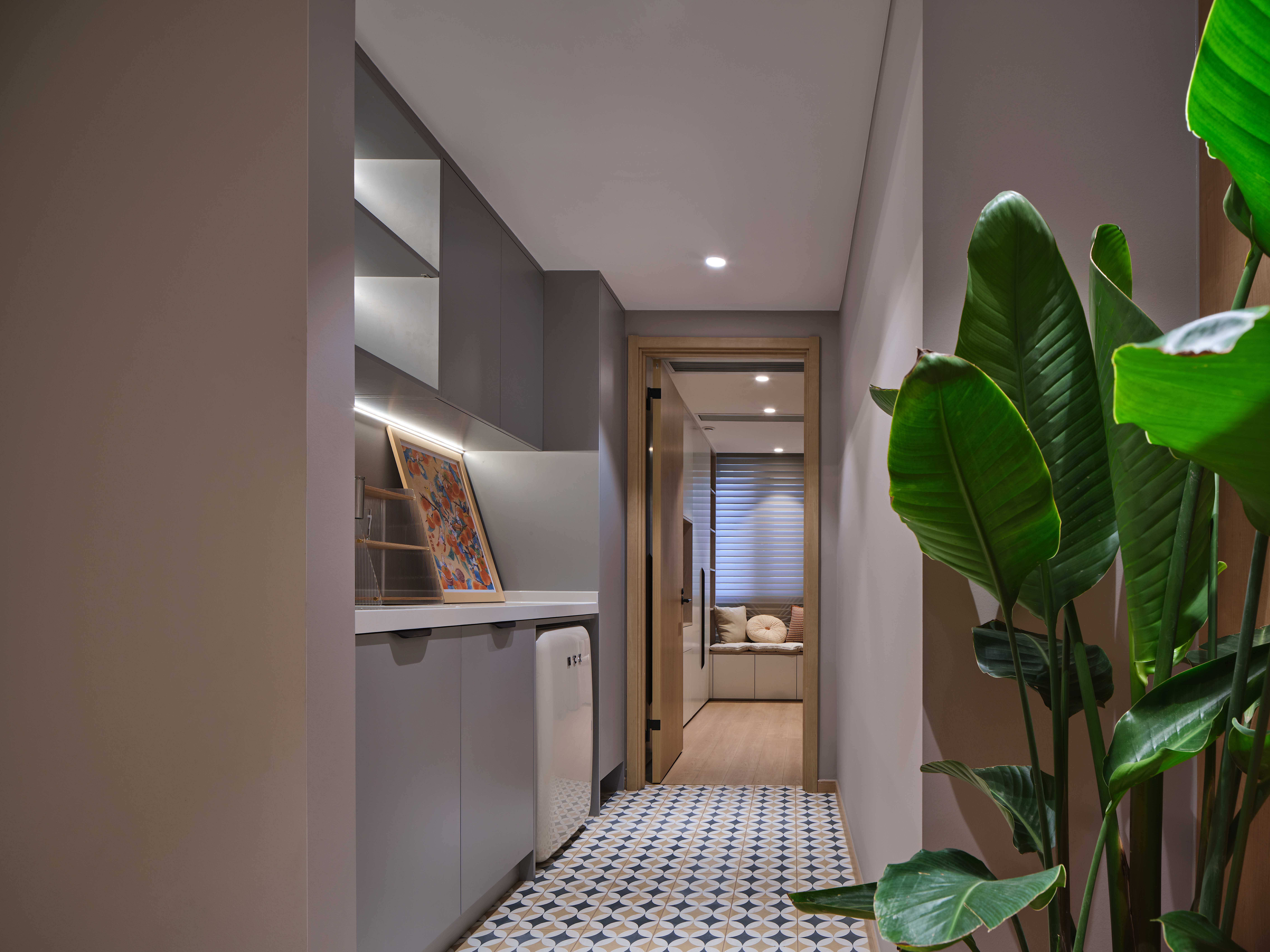 设计选材:纯白玄关柜自带细腻温暖的气质,结合灯光烘托,树立家的亲和感。一侧,同色系隔断既起到分割空间的作用,又为入户区塑造优雅通透的印象。