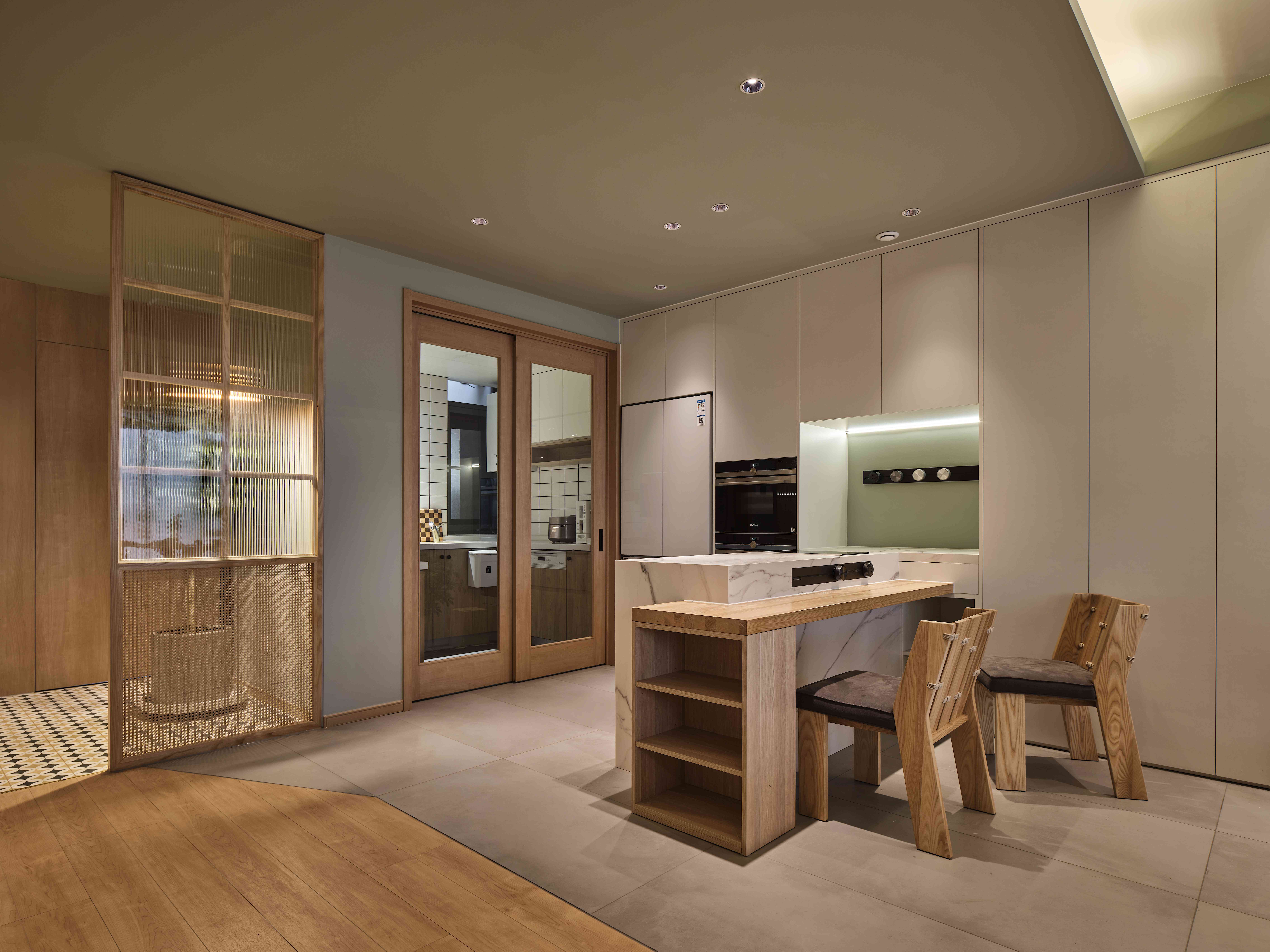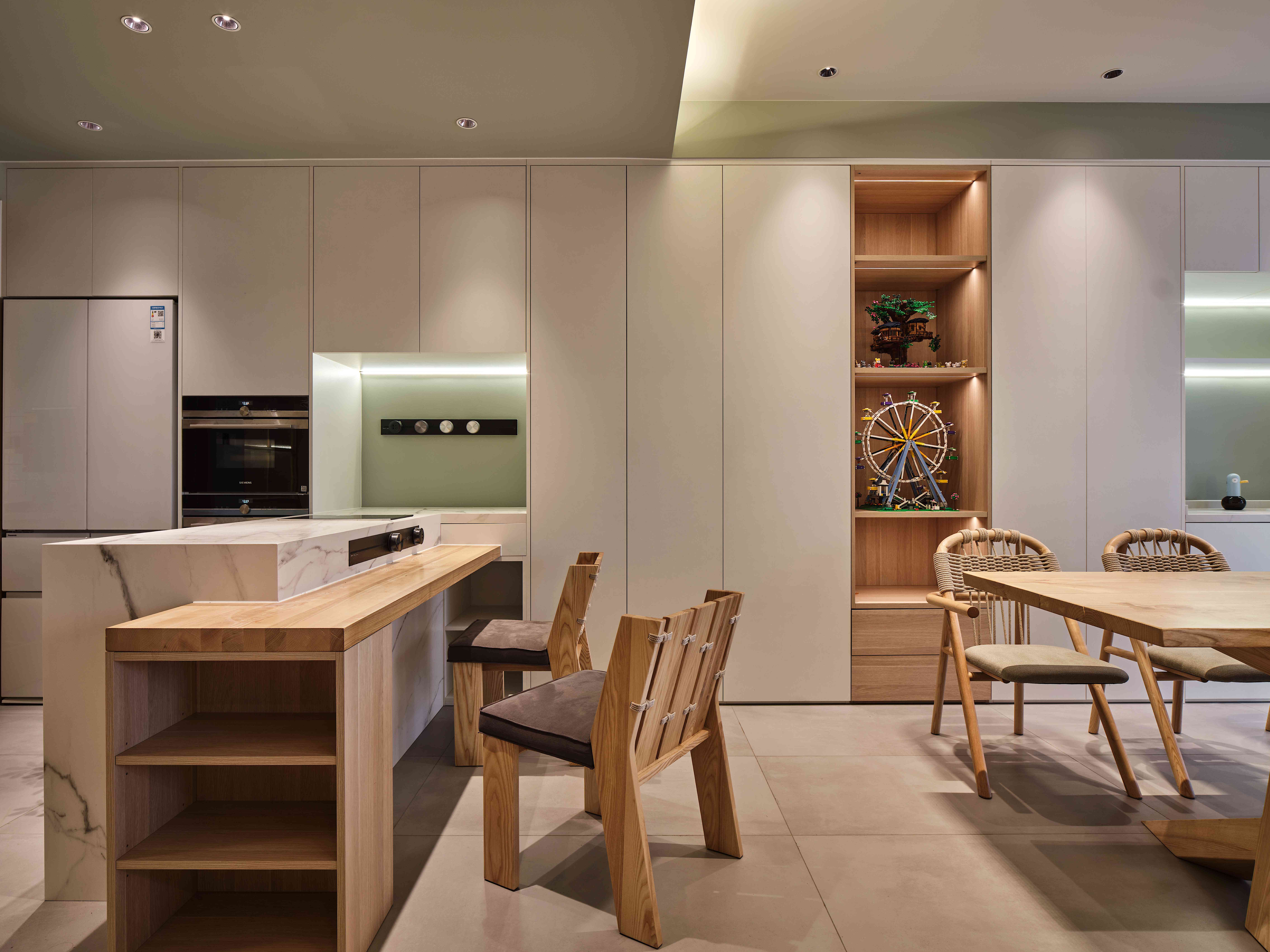 空间意境:设计从定义功能为始,定制的岛台与储物柜相连,结构布局与审美视觉达到完美交融,创造一个承载更多自由生活方式的空间。
