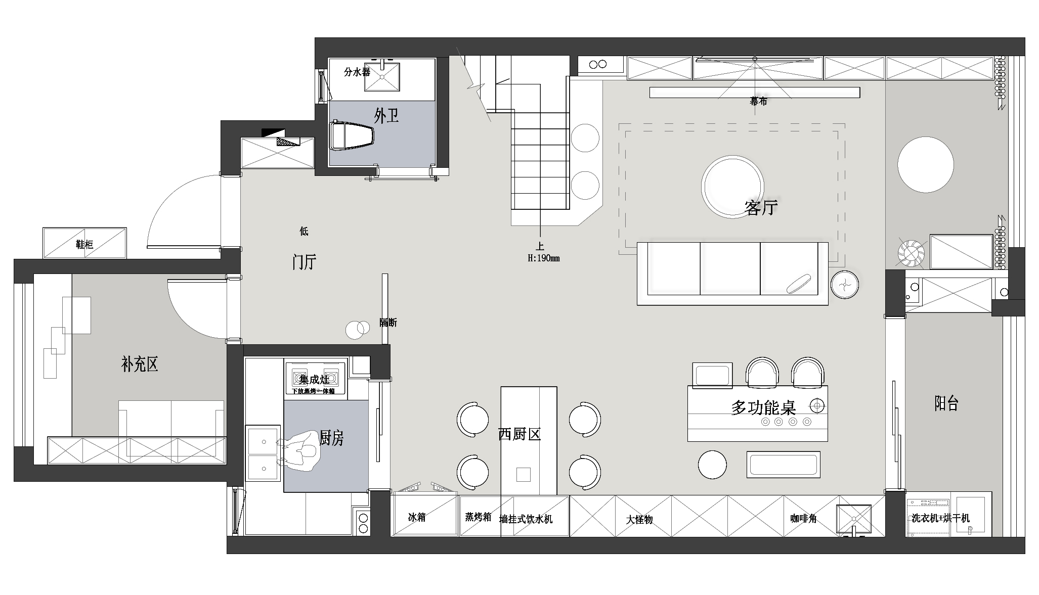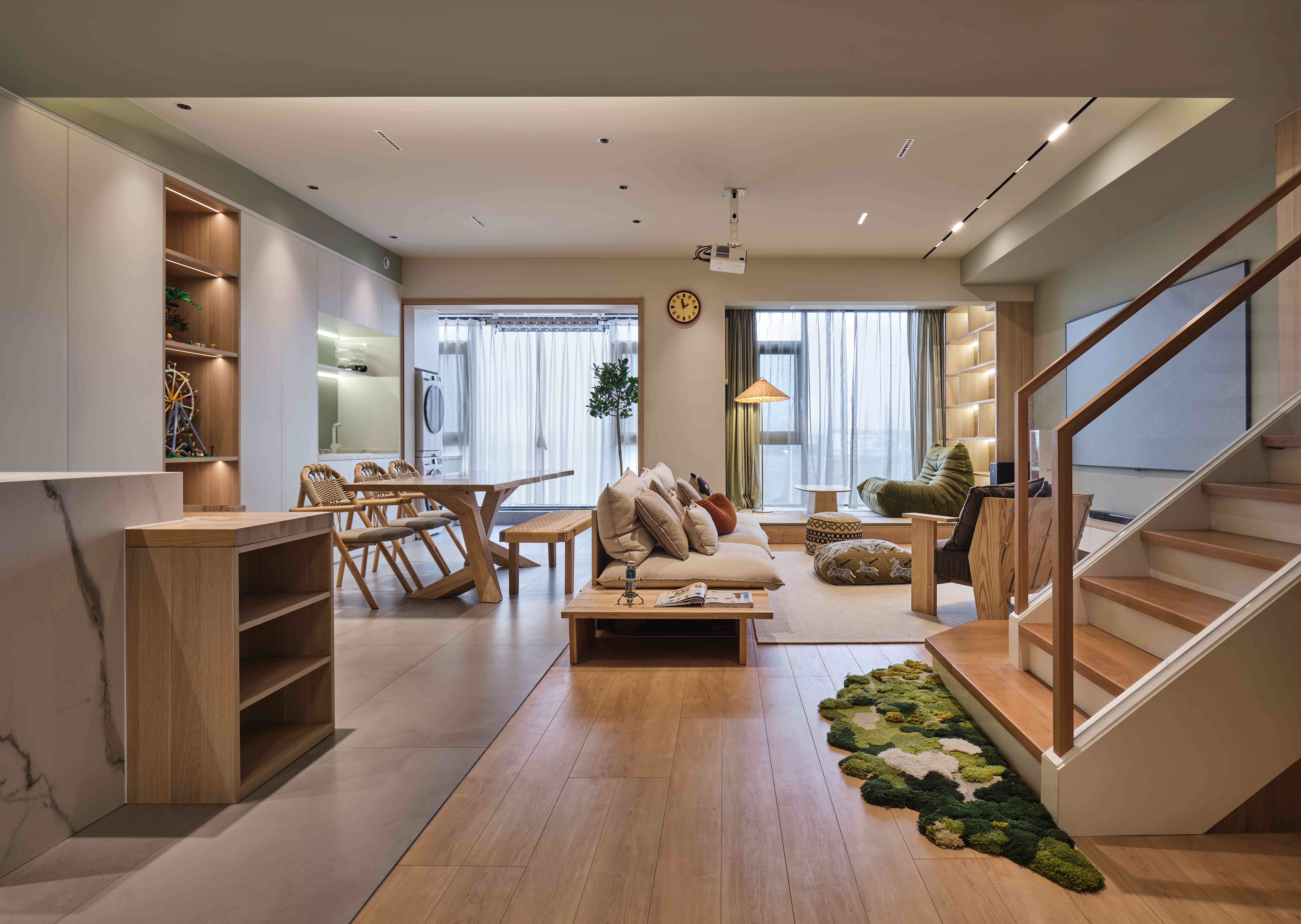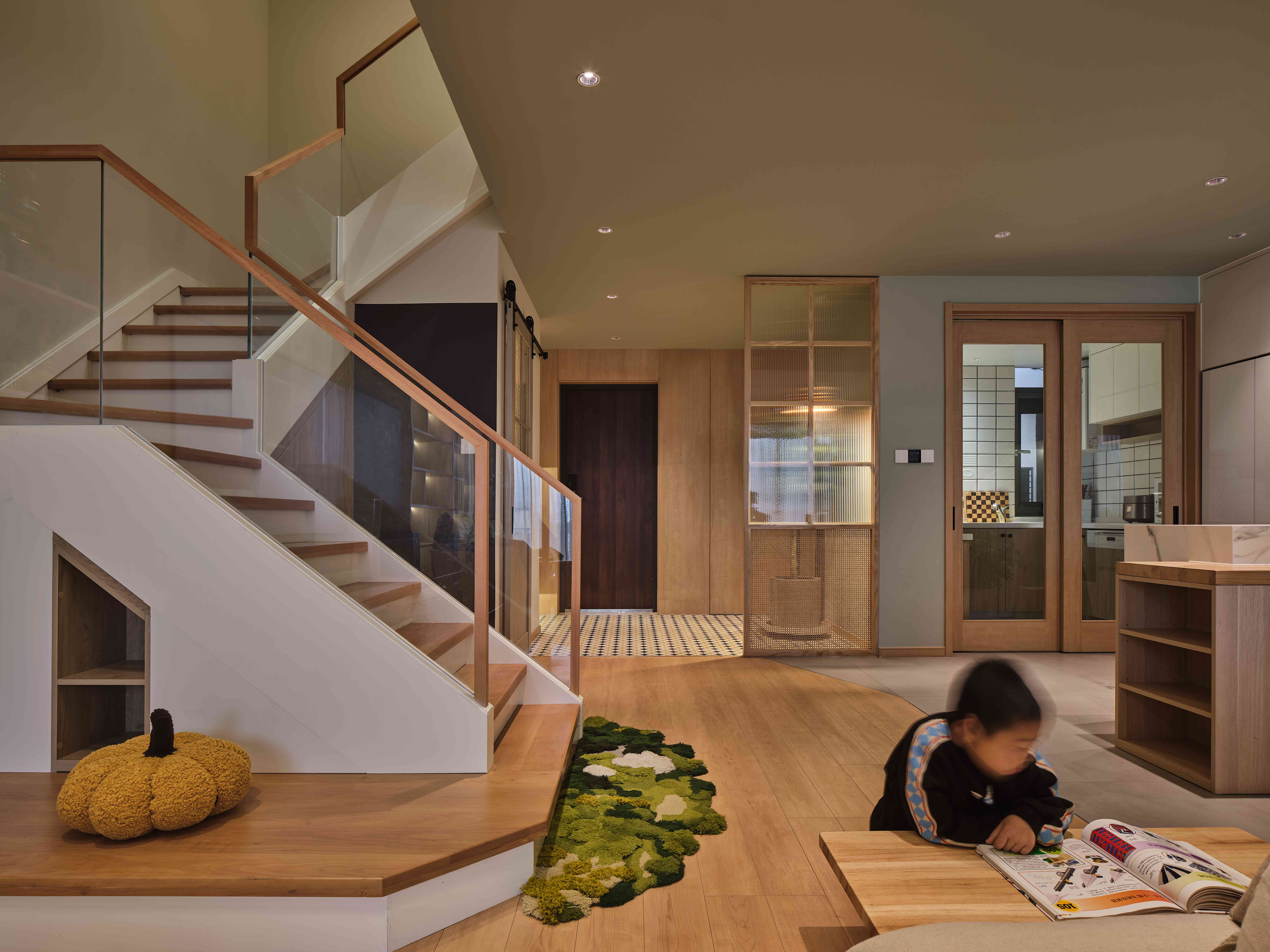 空间布局:设计师根据一家人生活习惯以及功能需求对一层空间进行梳理布局,入目,厨房、岛台、餐厅、客厅、阳台休闲区依次展开,日常使用更加方便流畅。