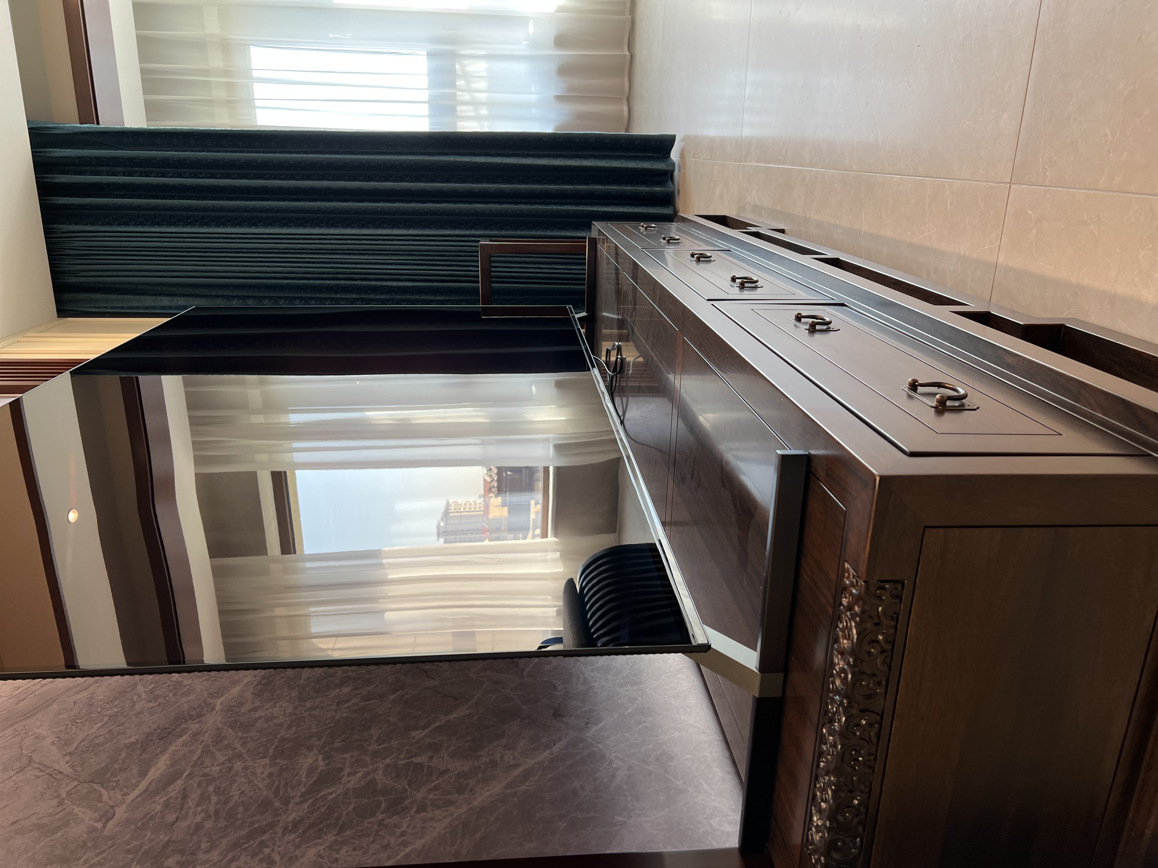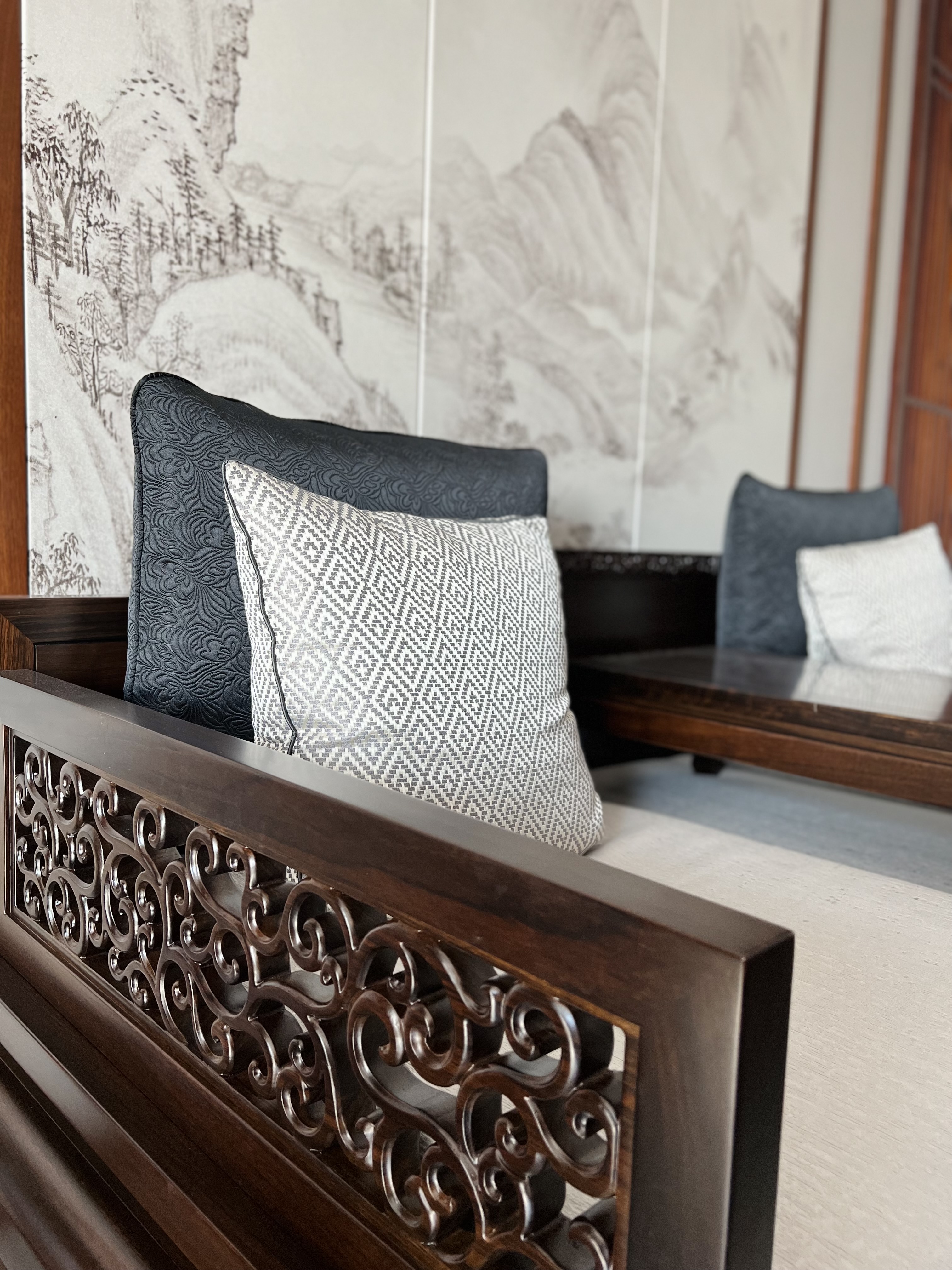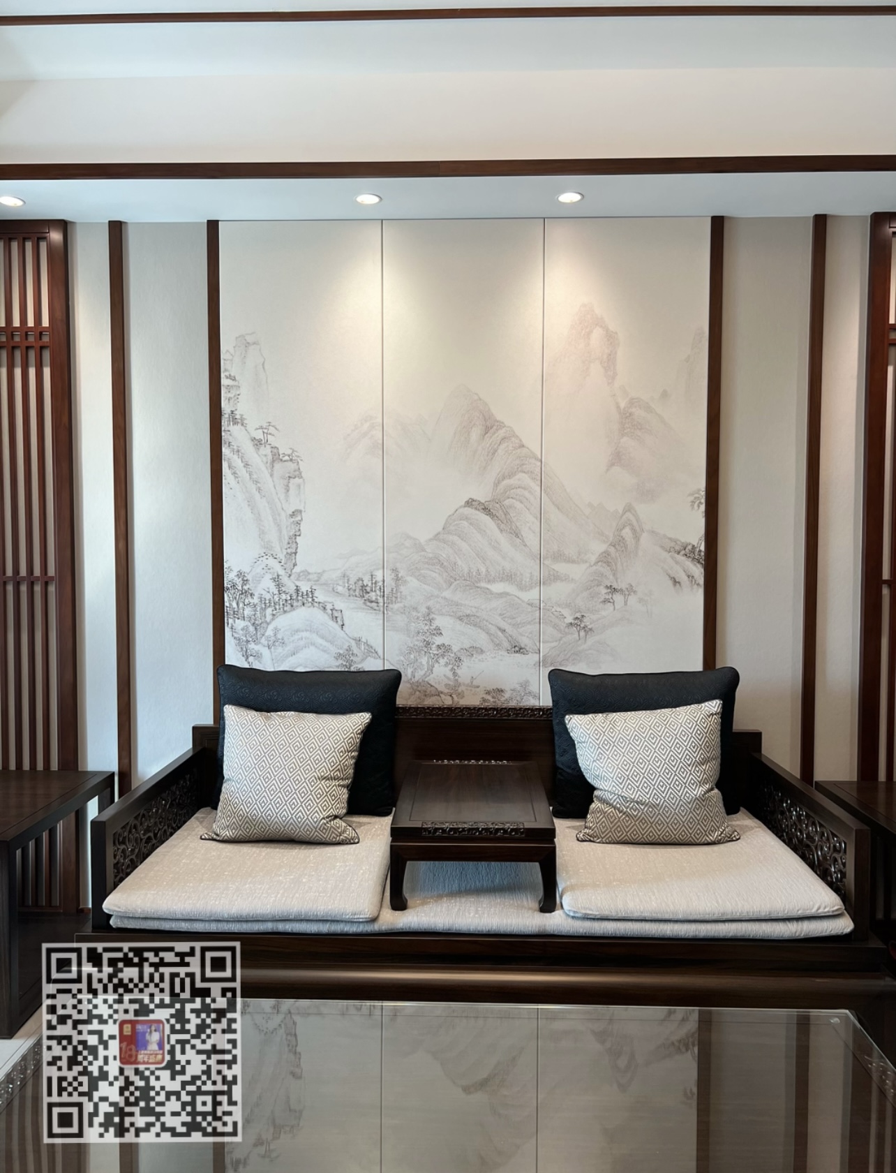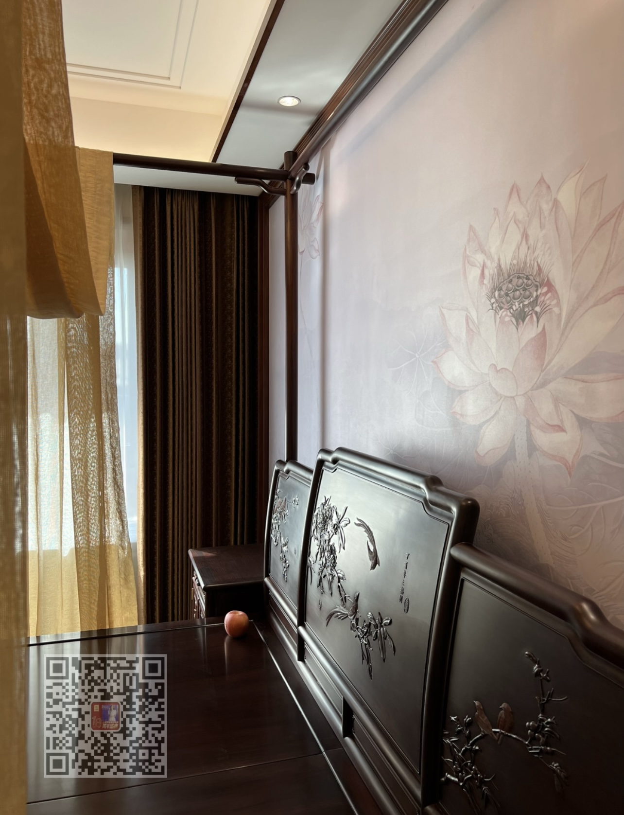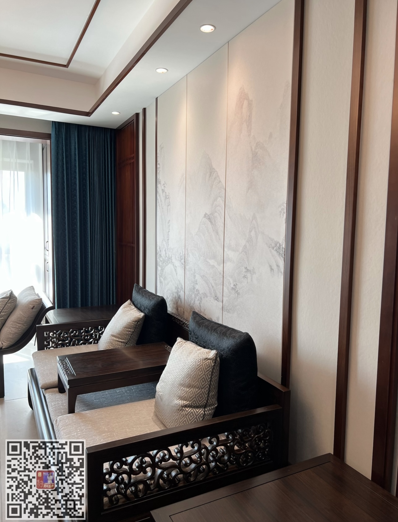 设计选材:定制软装主材,背景融入山水元素,流畅的表达出中式韵味,柔软的软装搭配不经意间透露出整体设计的舒适惬意。整体凝聚中国风之美,温润而有内涵,更加耐人寻味,更符合内敛的国人性格。新中式的意境之美,也是一种低调的中国轻奢。