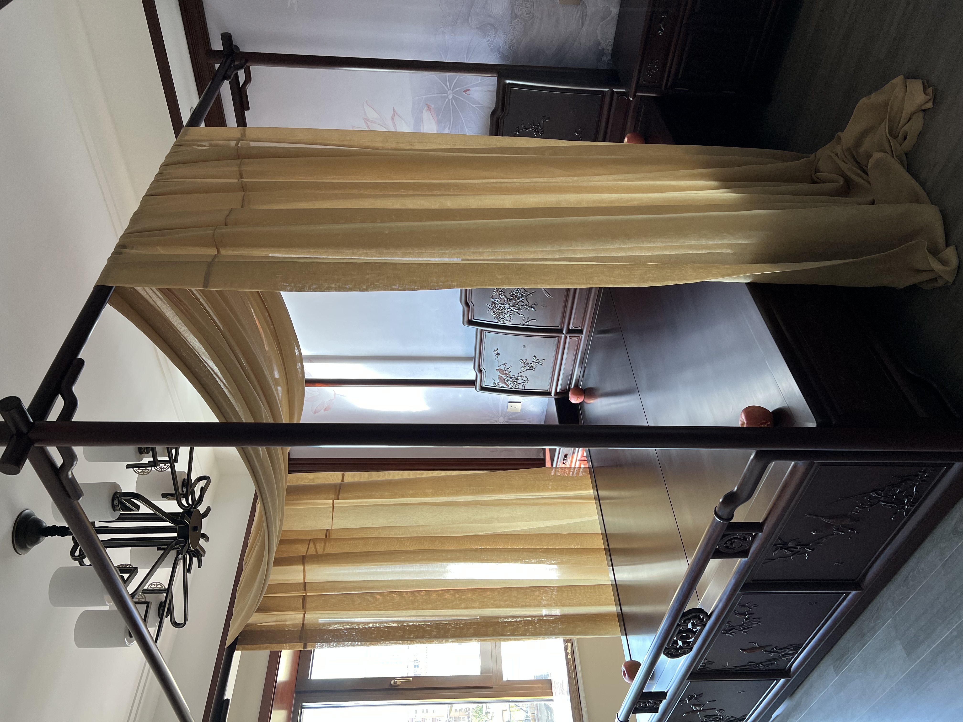 空间布局:中国传统褐红色让整个空间映射出满满的暖意,客厅中运用木质、圆形、中式吊灯等元素突出了中式风格。卧室加入透色纱帘做点缀,带来朦胧的光影洒落在空间里,更能展现古典之美。
