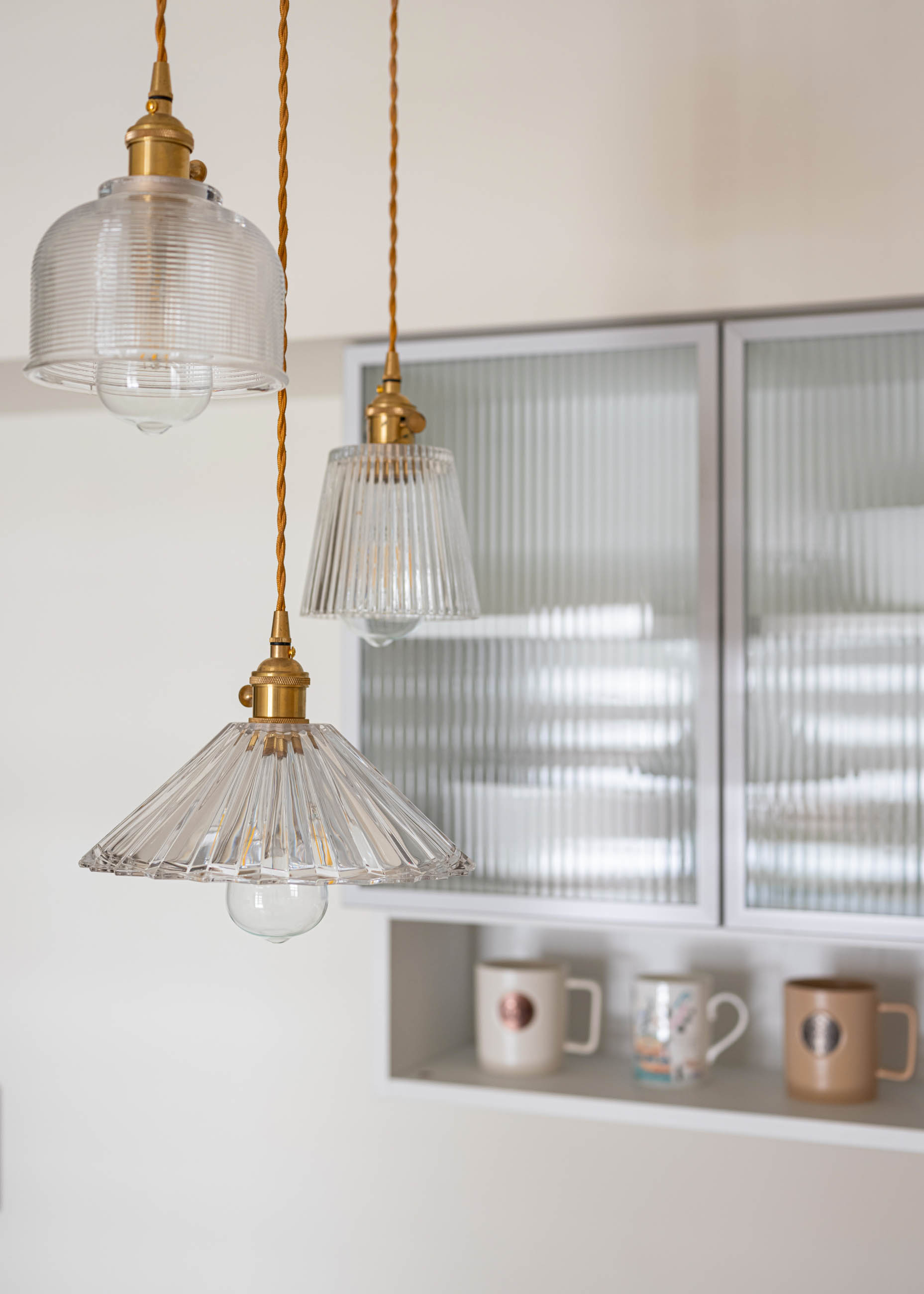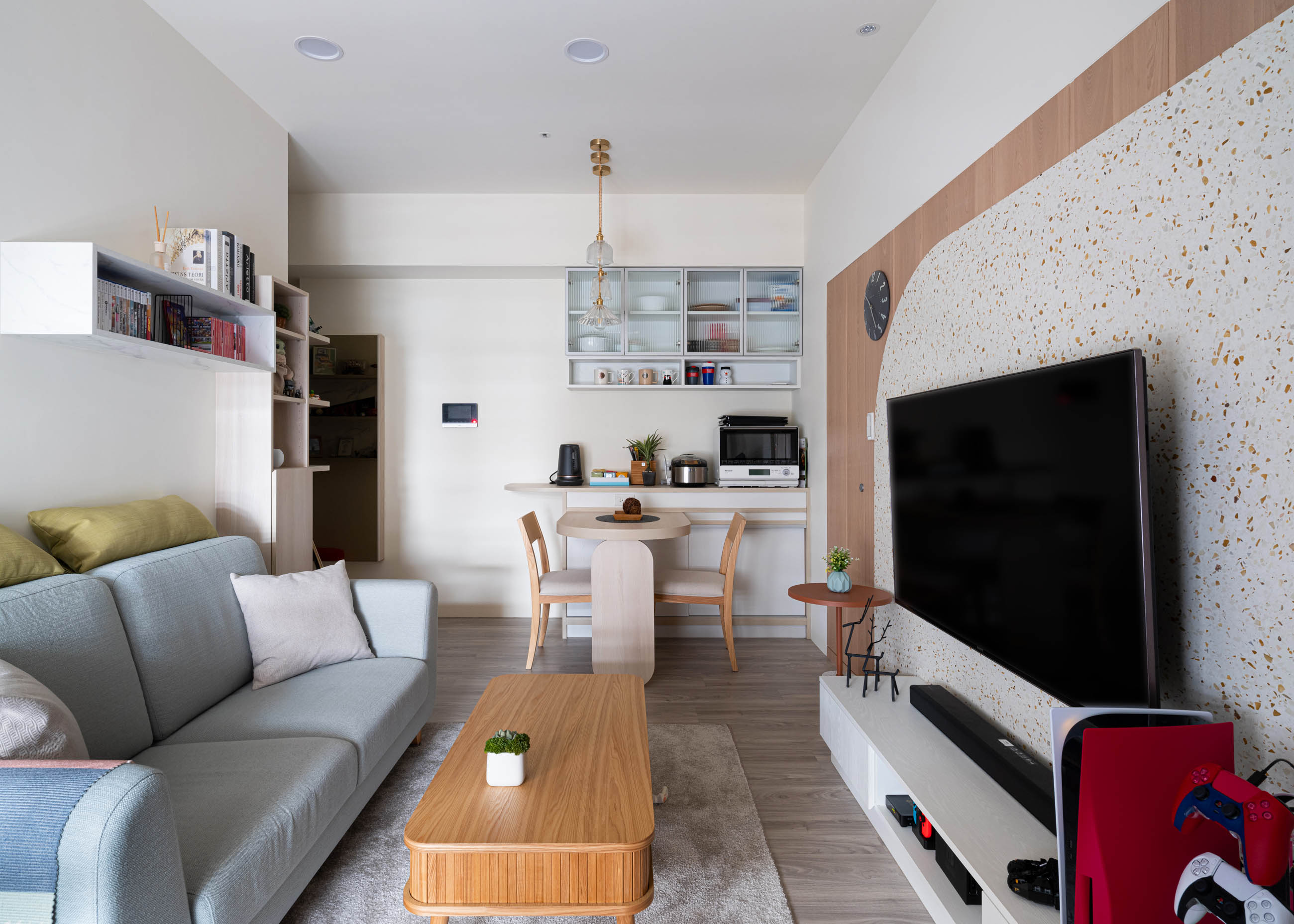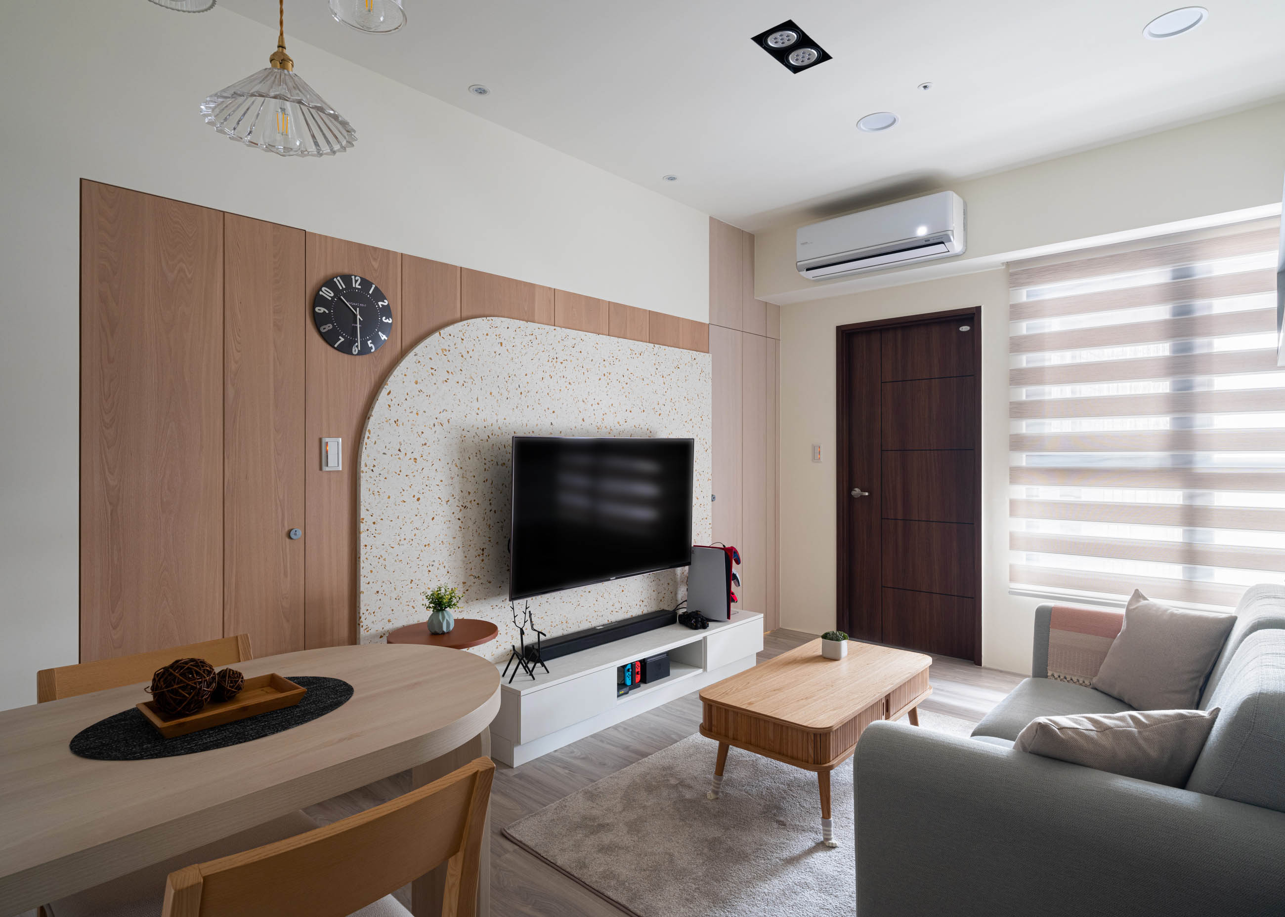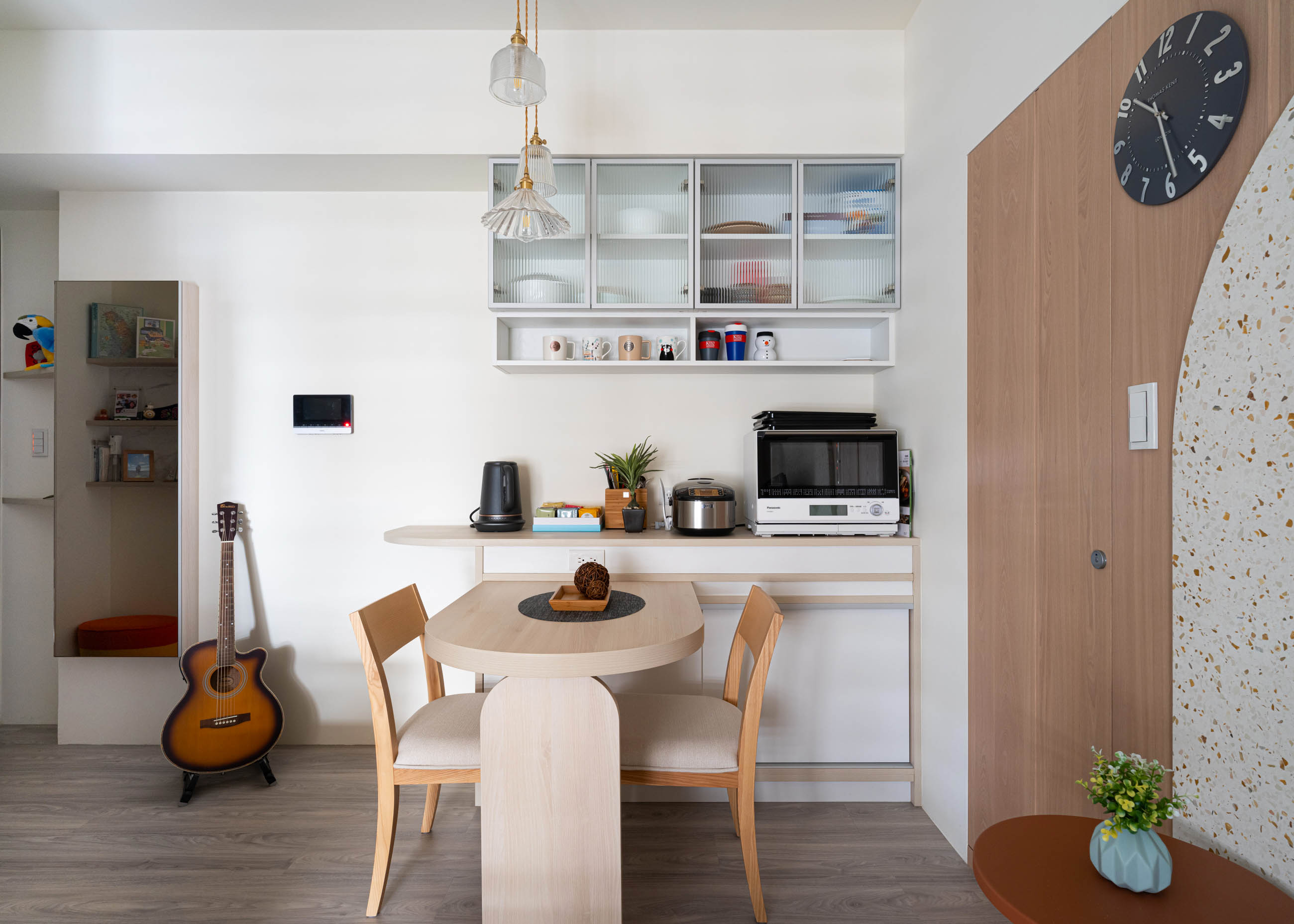 空间布局:原客厅电视墙方向有两扇门,视觉上呈现狭小及违和感,透过设计改变形式与不同材质层次交错让整体视觉上更有空间延展感。餐桌及备餐柜的结合,整体规划充分达到坪效最大化机能完善,在现今快步调的生活中也不失仪式感。