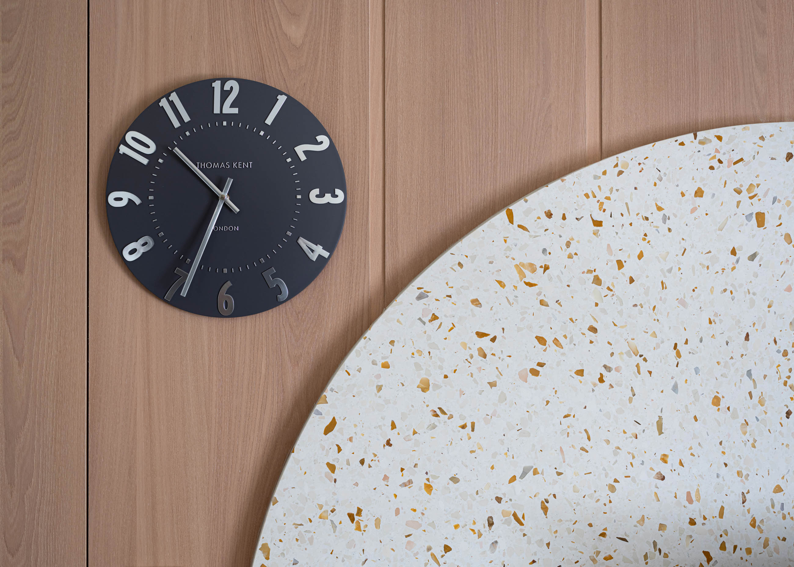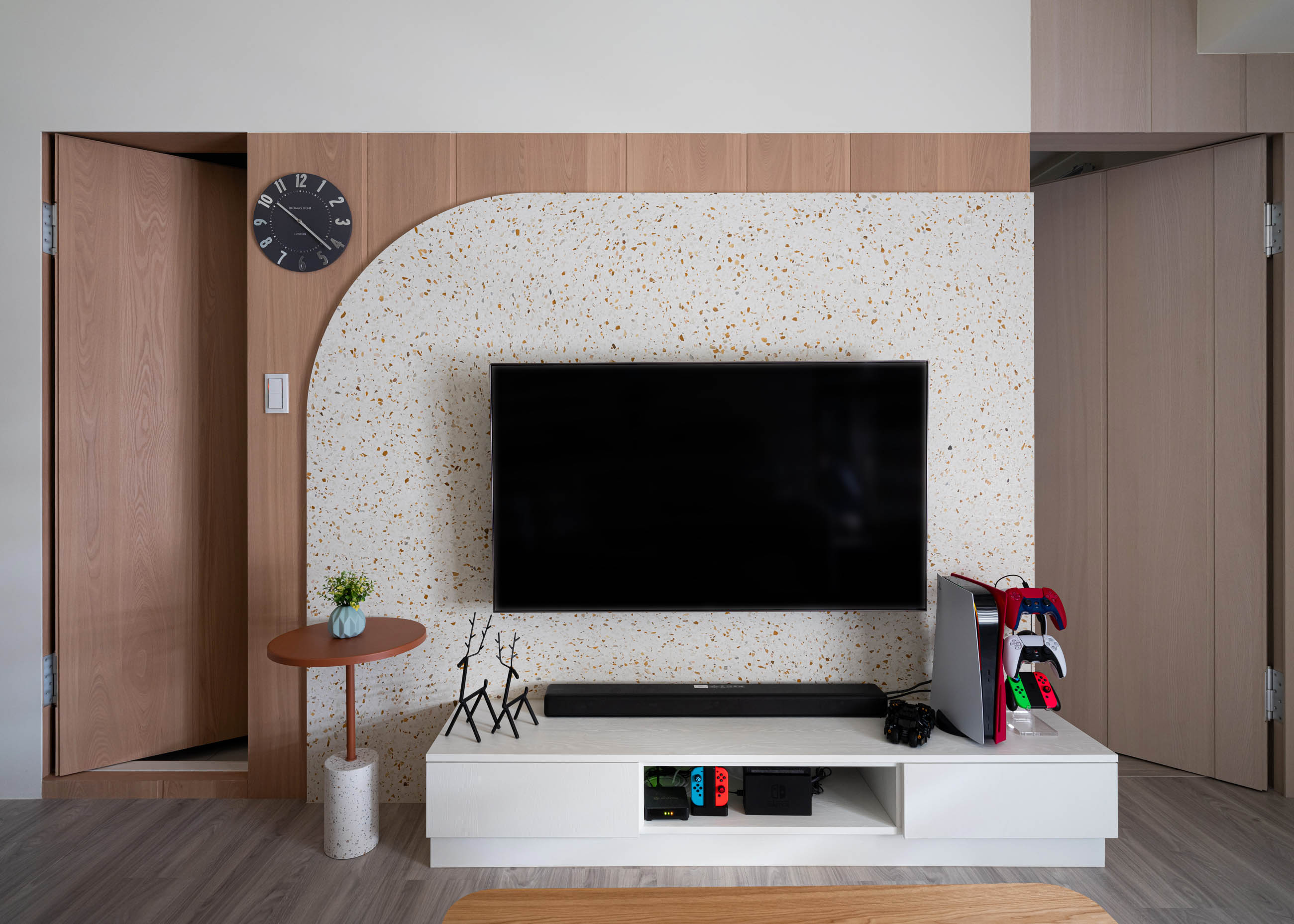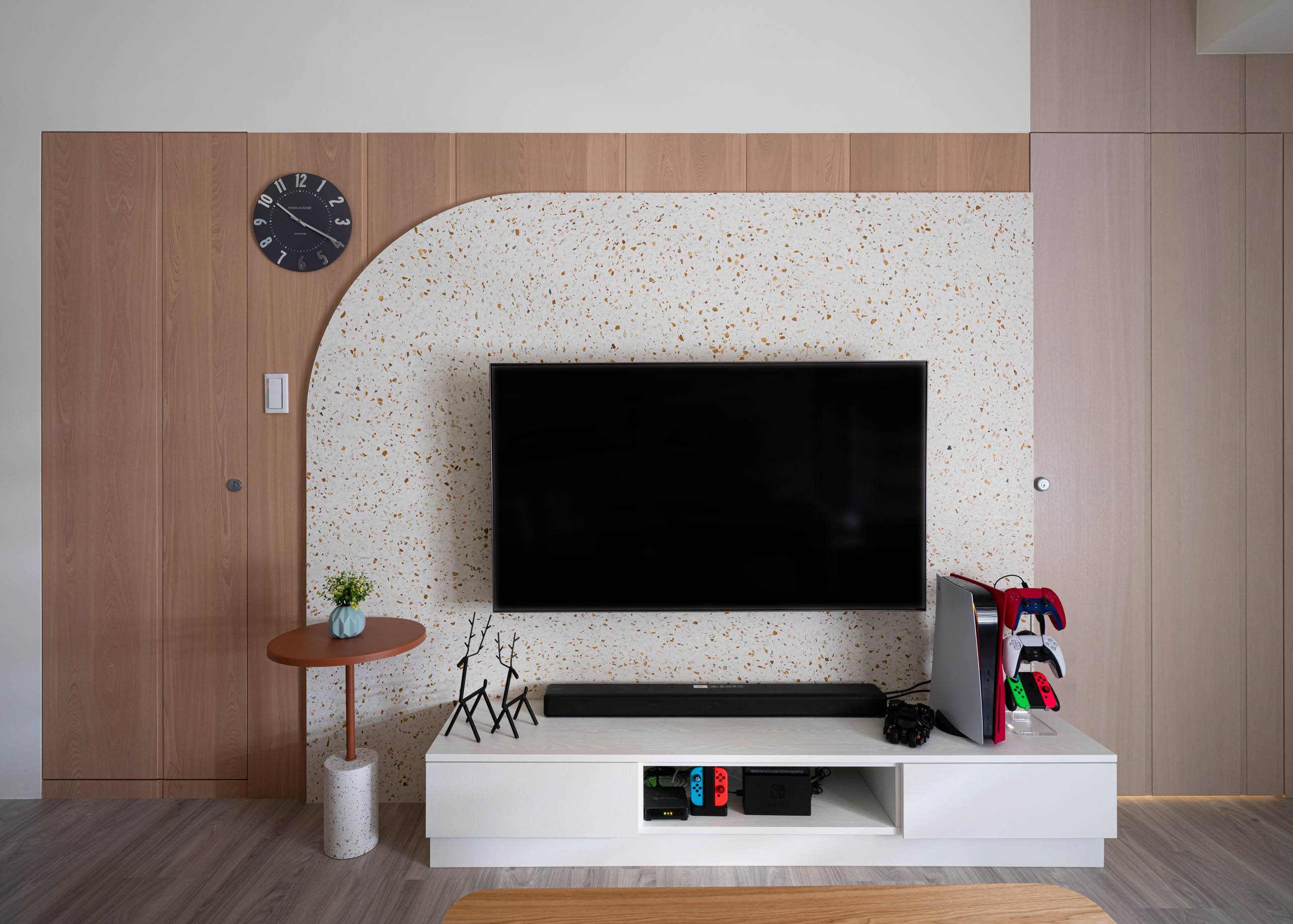 设计选材:水磨石虽保有传统磨石子的复古韵味,却打破过去老派的风格印象,供多元的颜色款式可搭配,因此选用具活泼清新纹理的水磨石大面积运用于电视墙,营造温馨恬静的法式氛围。