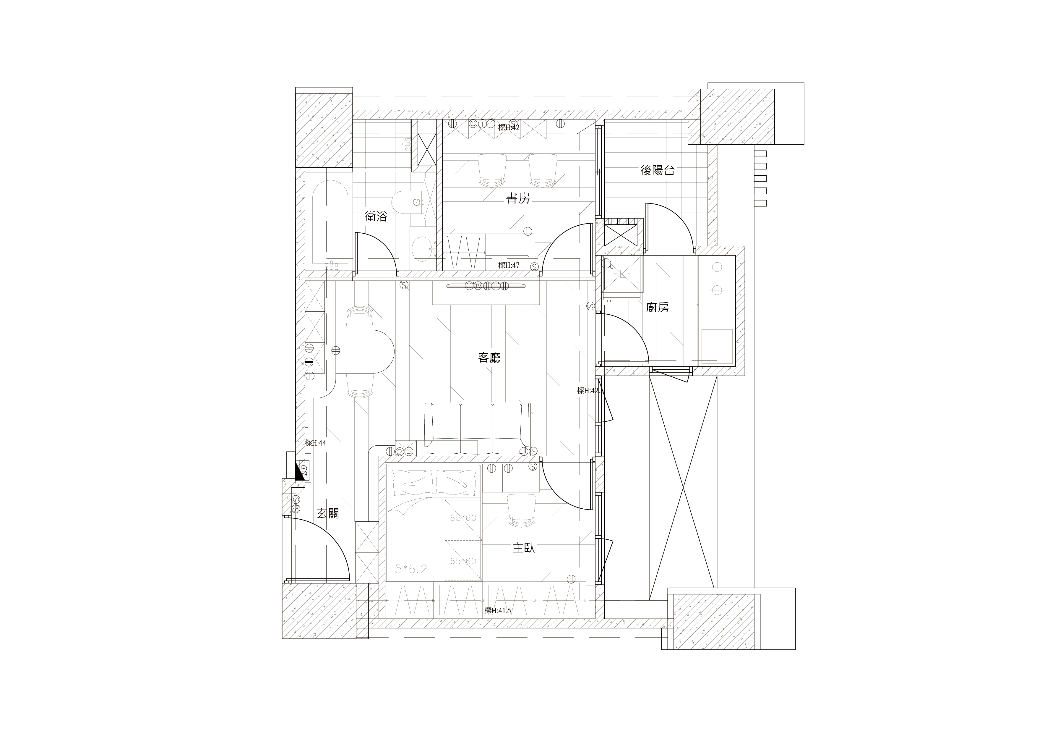 空间意境:因应业主喜好,选用充满活泼清新纹理的水磨石,奠定优雅恬静的质感,并善用温暖的木质调与柔和弧形线条勾勒的造型等元素,将温暖的氛围浓缩在微型空间打破多数人对小宅的印象。主卧私领域维持简约的空间线条,以温馨实用为主,柔和的肤粉色墙面和同色调木质纹理 ,搭配衣柜长虹玻璃增加了空间的开阔感,让休息氛围更温暖舒适。书房以焦糖色及其他颜色的交叠,呈现与其他空间不同的感觉,增加家的多变性。