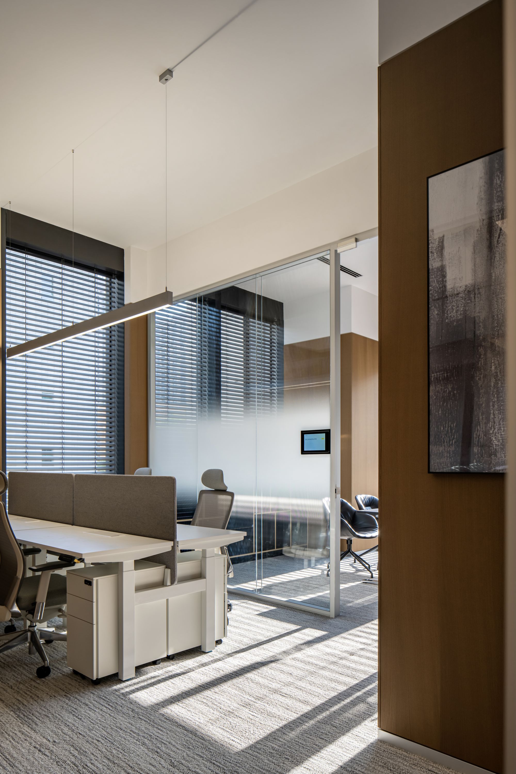 空间意境:主入口位于主电梯厅一侧,次入口位于商业电梯一侧。进入门厅后,映入眼帘的木质背景墙,与两侧的玻璃隔断形成虚实对比,并构成空间整体氛围基调。洽谈区和茶水间分置入口两端,L型的公共走廊链接各办公空间和辅助空间,会议室、电话间及其他辅助空间沿走廊内侧线性布置。入口门厅处,玻璃隔断上方和架空地面下方的隐藏的灯带分别向上和向下照射,配合吊顶的灯光设计,共同构成了门厅的灯光视觉效果。这样的照明形式,营造出轻盈“线性”感,与空间块面做对比,降低体块对视觉上带来的厚重感。走廊上方,依靠漂浮于空中的超长灯线主光源,和玻璃上方金属带背后的线性灯带辅助光源,共同照明,形成走廊的灯光氛围。这样系统化的灯光布置不仅使得吊顶更加的简洁和干净,让身处其中的人能够快速切换状态,且让办公人群可以在走廊有了更多的停留,整体沉浸式的代入感,可以适应不同空间角色之间的自由转换。形成更多的沟通和交流。