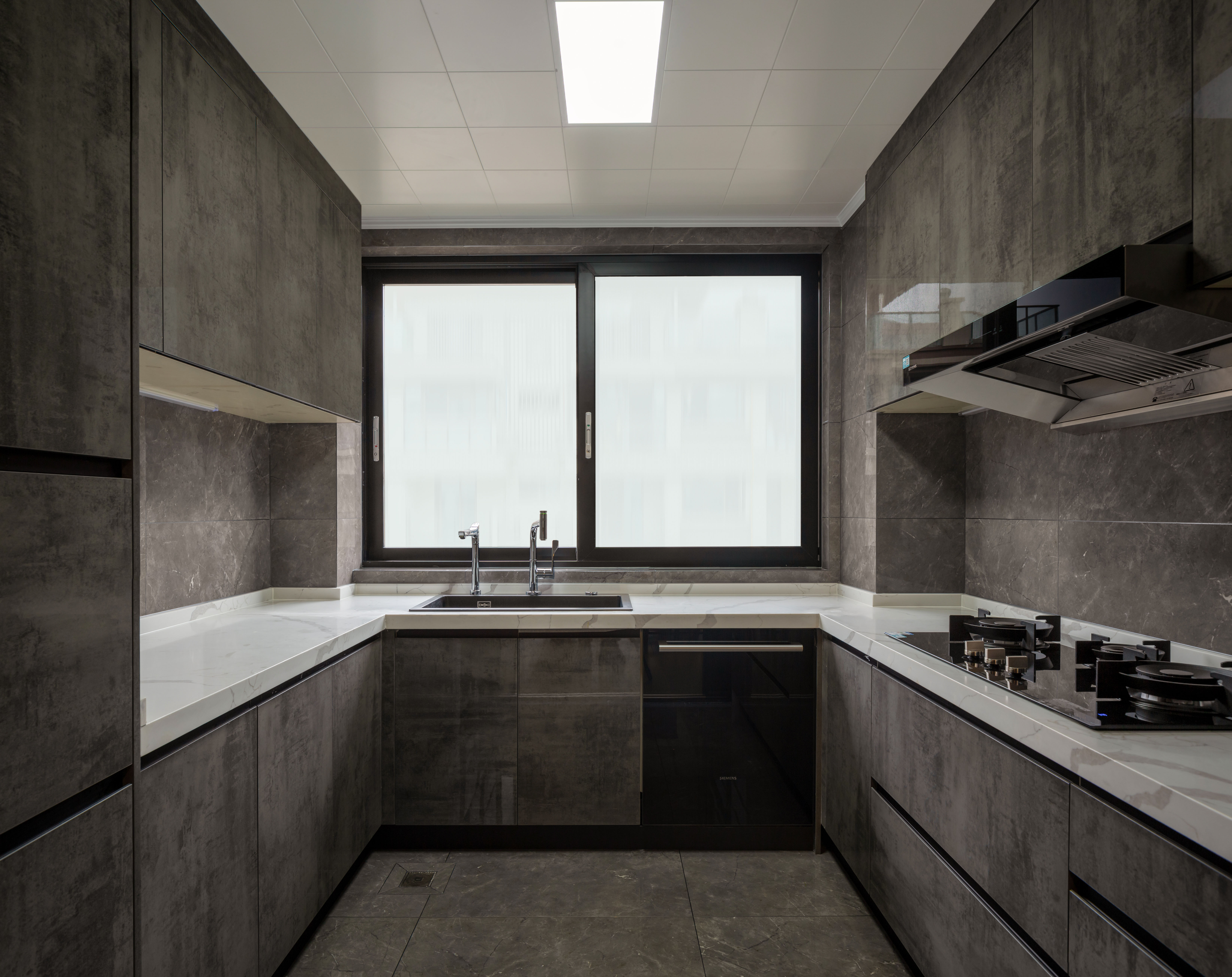 u型厨房以大面积灰色为主色调,橱柜运用了灰色免漆板,从而与墙体相适应;台面则选择了白色大理石点亮,同时与顶面形成呼应,层次分明且互通协调,突显简约高级之感。