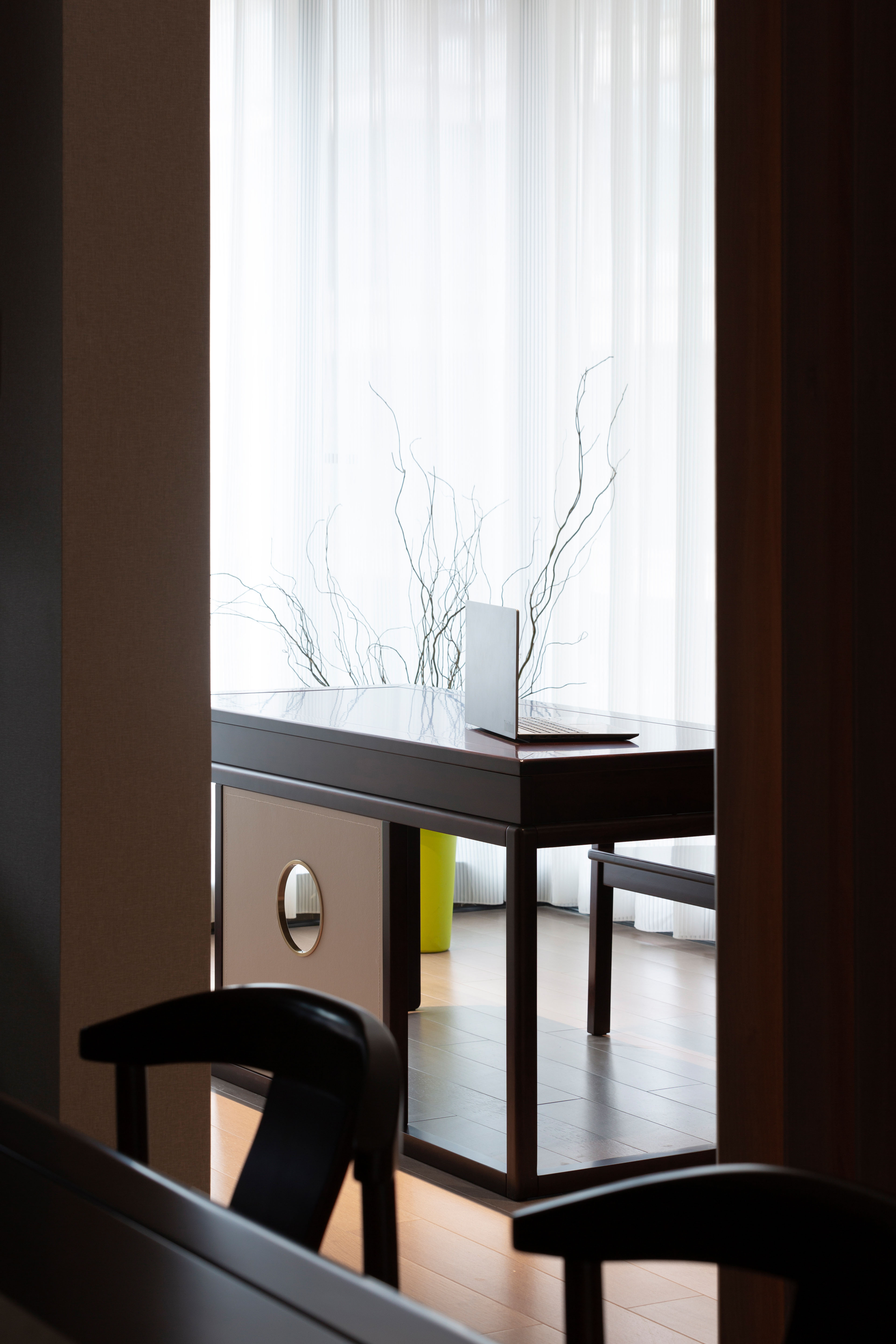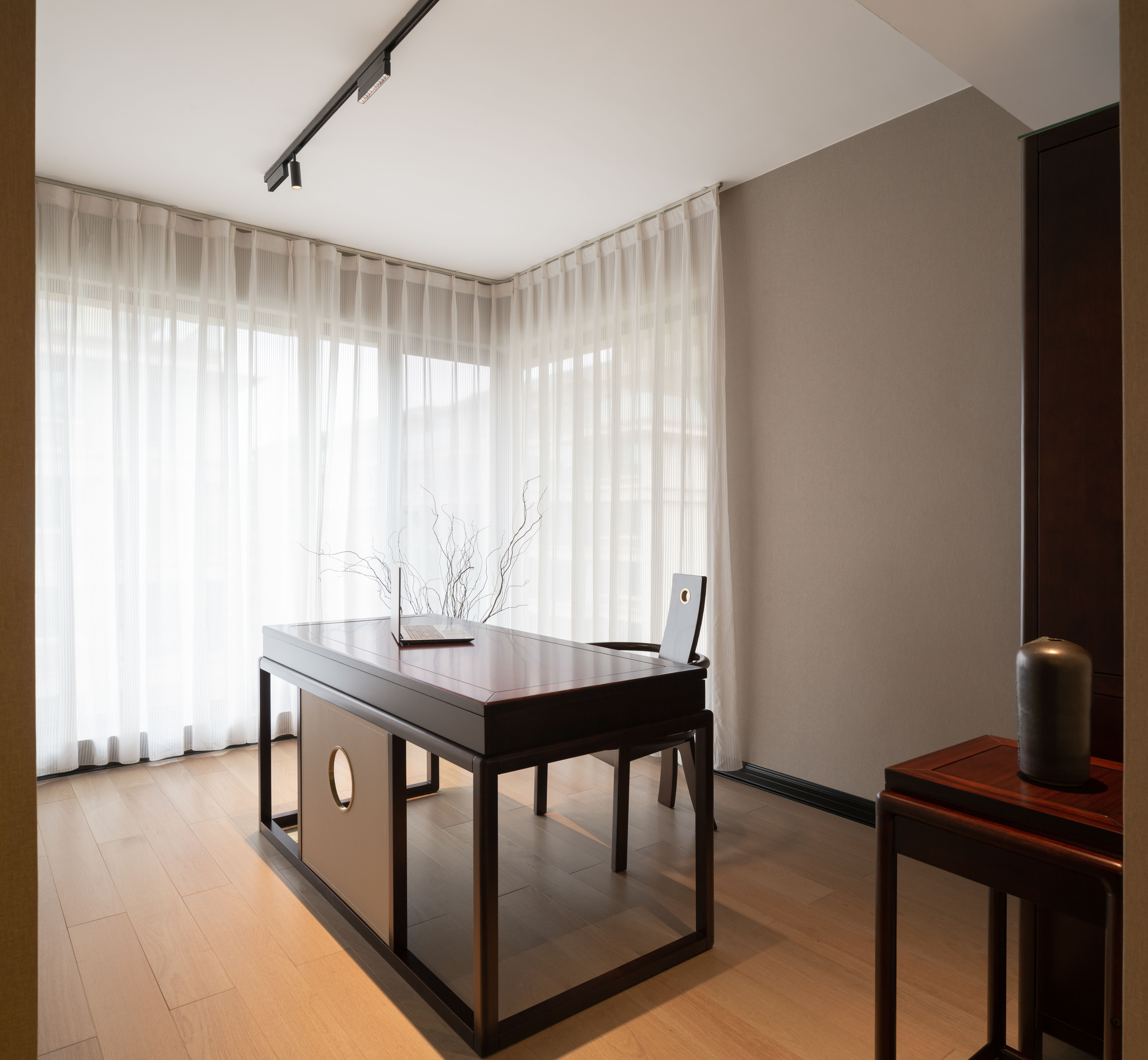 独立的中式书房,落地窗加白色纱窗使得空间更加透光轻盈。