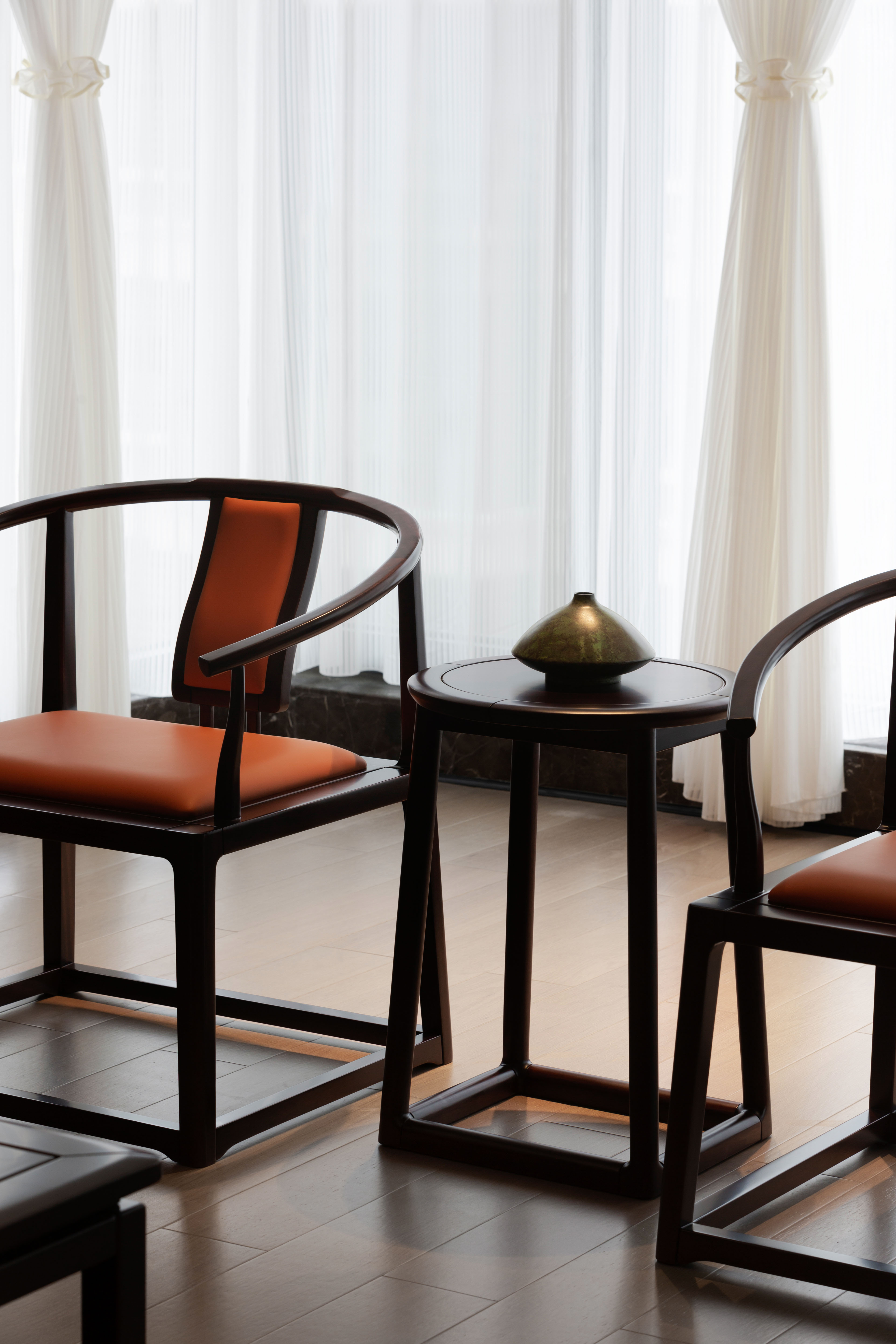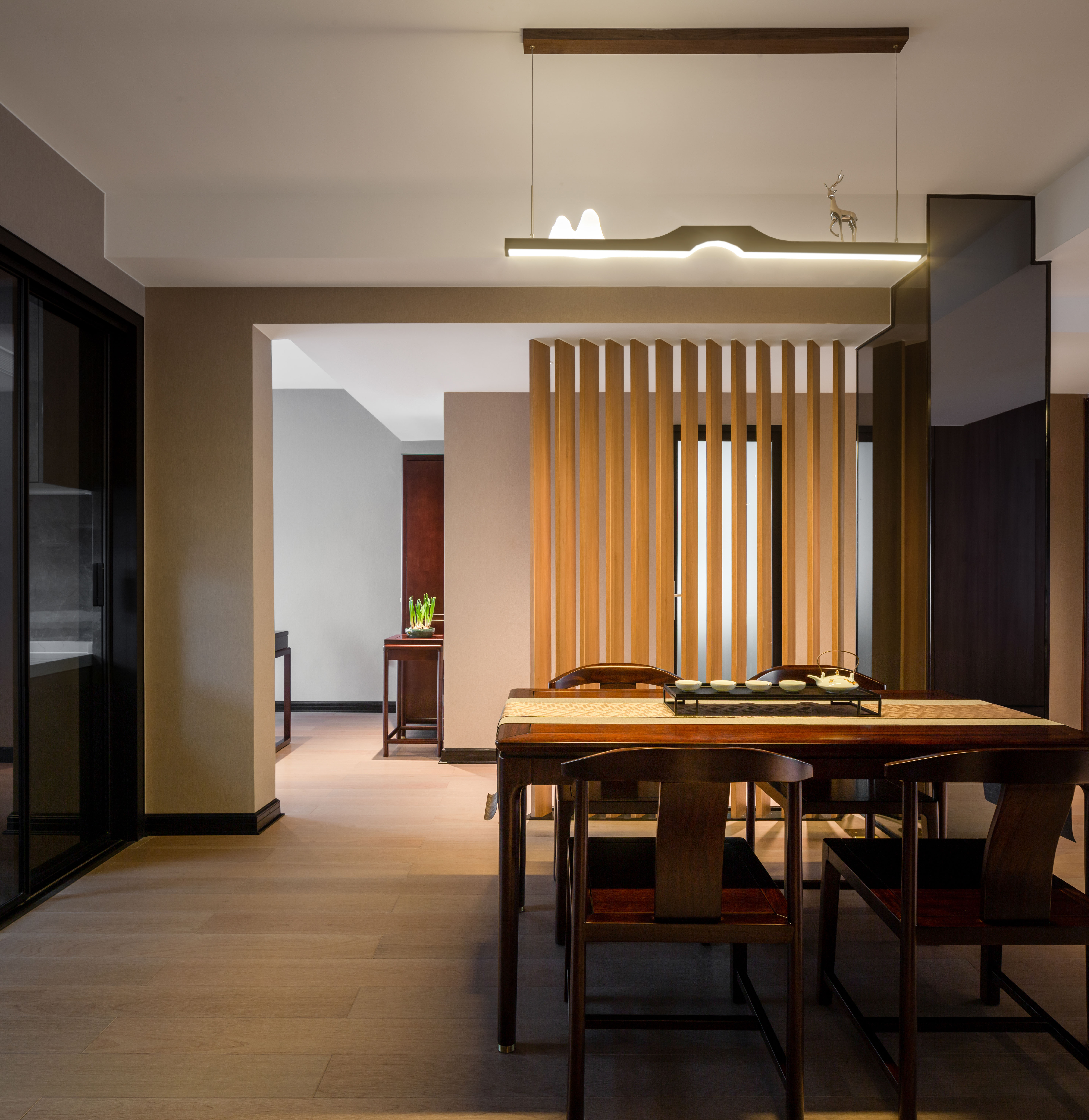 木质格栅暖色调与简约的艺术吊灯交相辉映,辅以黑色质料为空间重色,目及之处皆为精心设计的古色古香同以人为本的明朗流线。