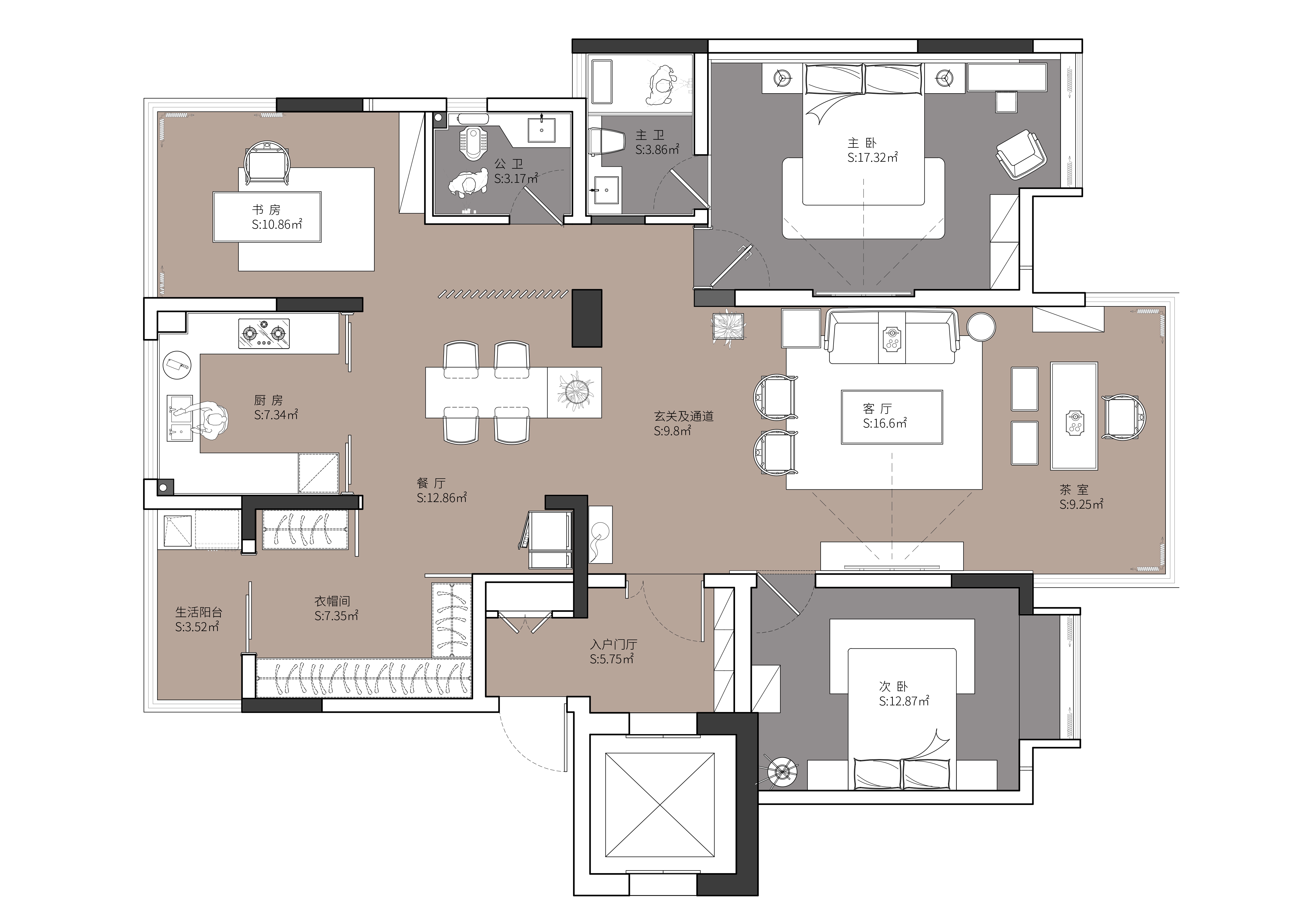 空间布局:统筹整合空间功能,横向统一公共区域,协调空间关系;卧室居于两侧区域通透与舒适性俱佳。