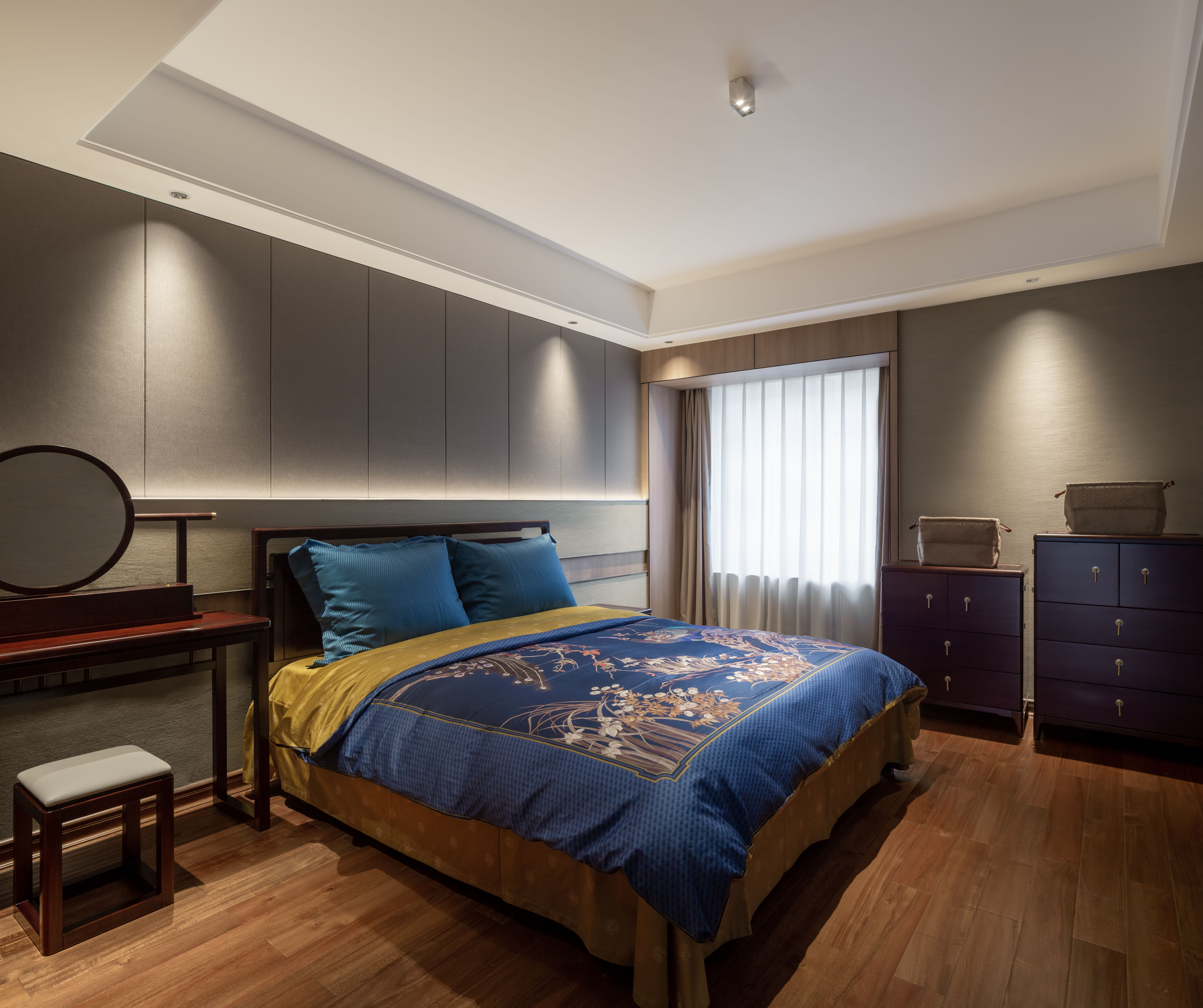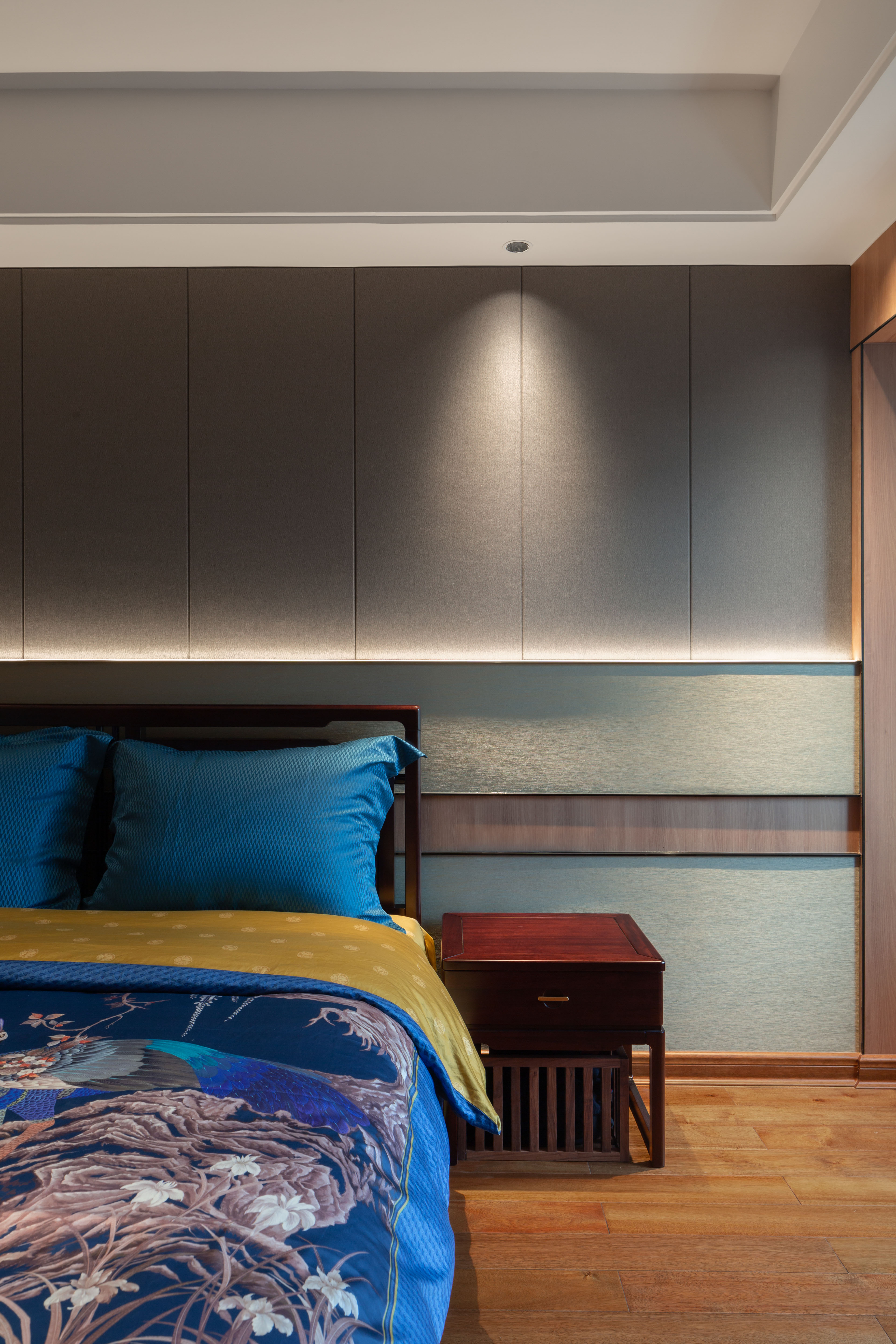 灰墙与红木家具的卧室中,由一抹蓝色床品软装加持,古味十足的纹样呼应主题,让卧室空间独有一番风景。