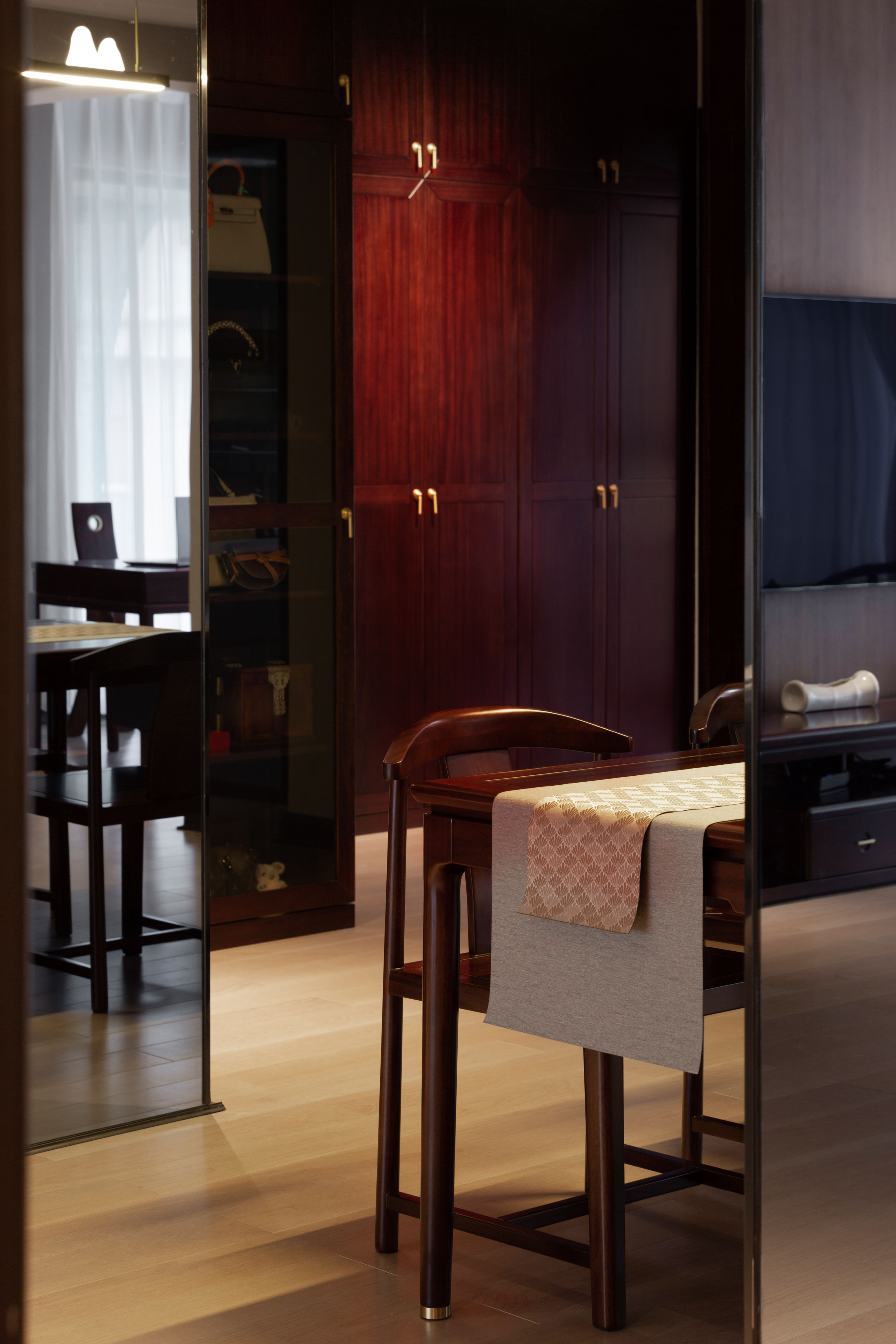从餐厅转过,柔和的奶油色墙壁衣帽间由红色家具萦绕,静置在其中的红棕色胡桃木定制衣柜,与整个空间的家具色彩相融合,其间部分区域用玻璃材质来打破,灵动且富有层次。