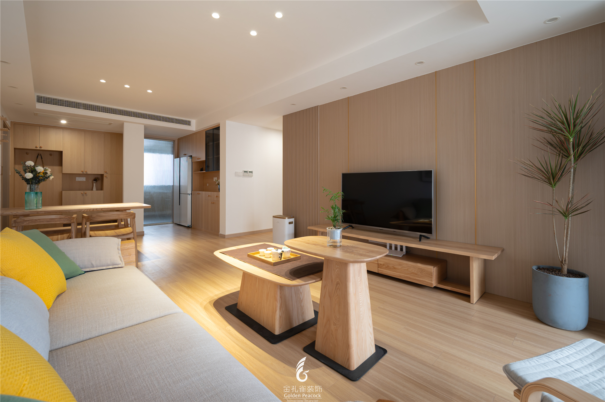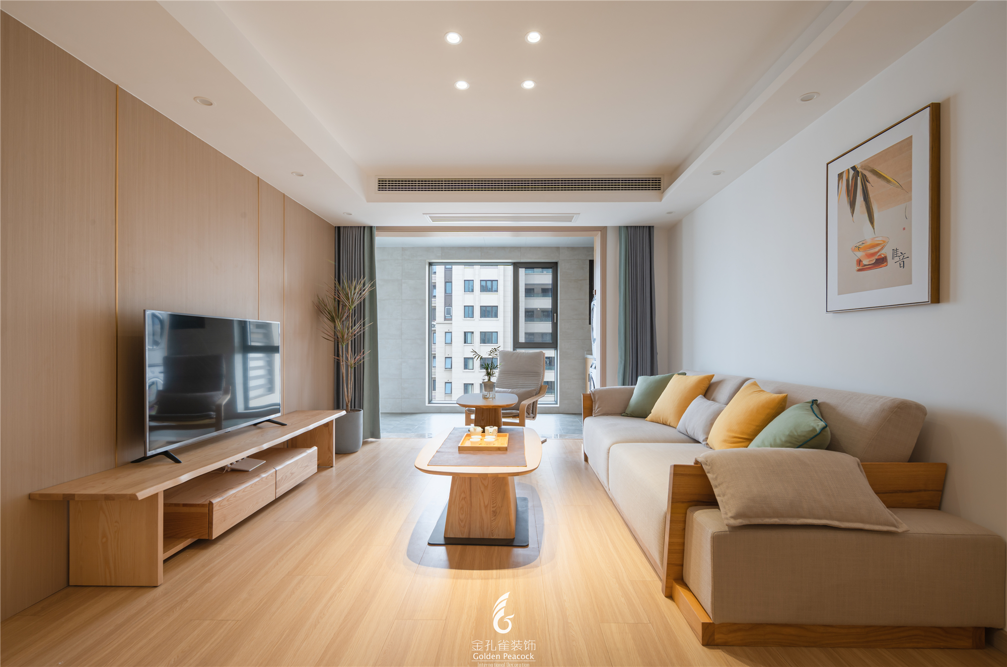 设计选材:“配色柔和舒适,营造温暖的家居氛围。用原木色铺开客厅的基调,木地板+家具的组合,有温柔又安定的力量。”