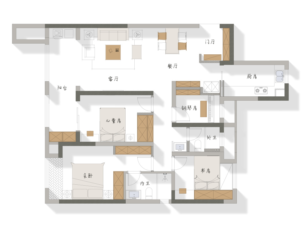 空间意境:考虑到小孩,给孩子预留了研读功课的学习区和培养兴趣的钢琴房;业主夫妻平时生活上的储物需求比较多,希望新家的收纳空间要跟上,在与设计师的交流碰撞中实现了原木日式暖居。