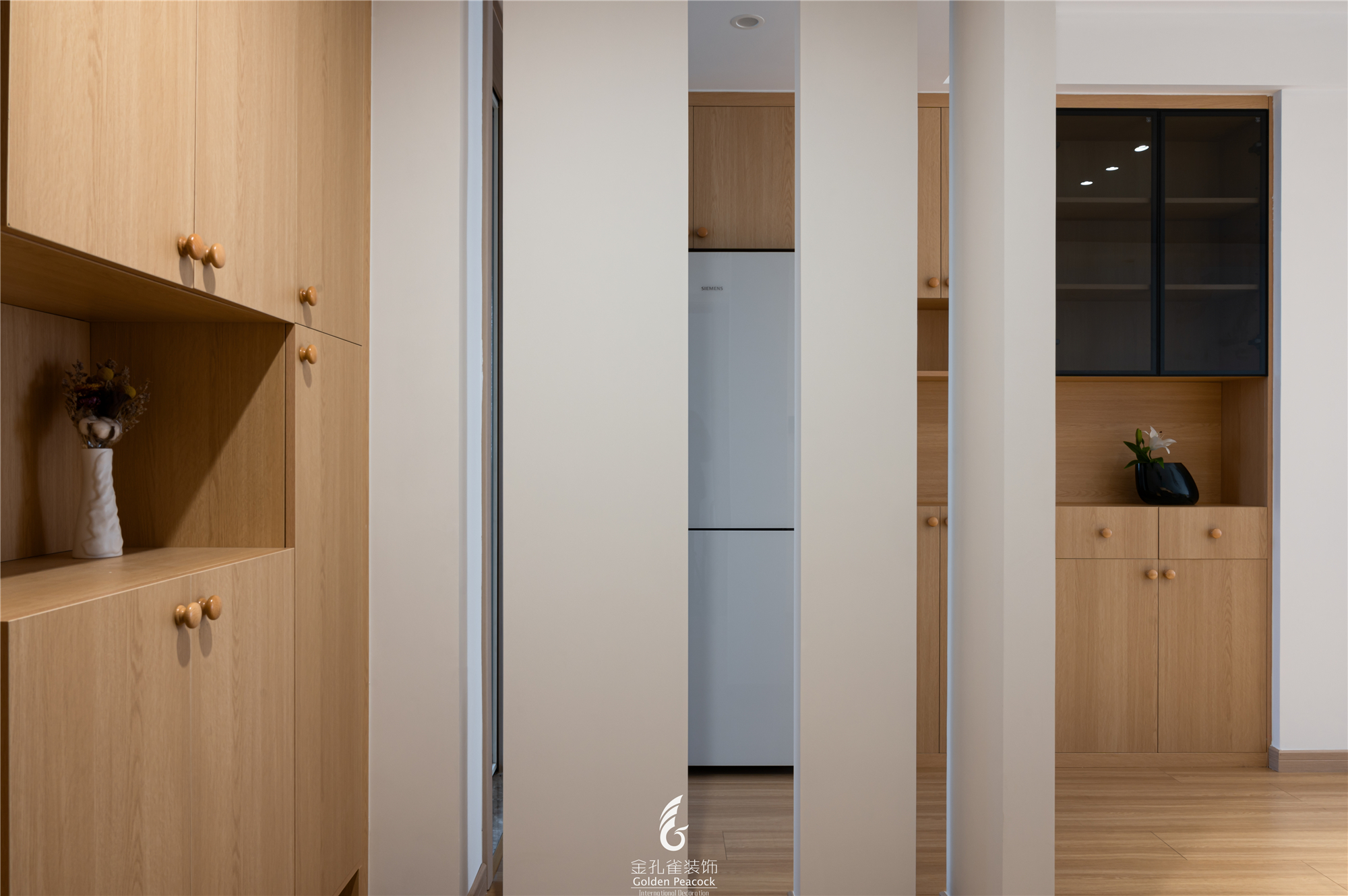 2.入户看到冰箱业主考虑到美观问题,做了半透隔墙隔断,尽显空间通透。