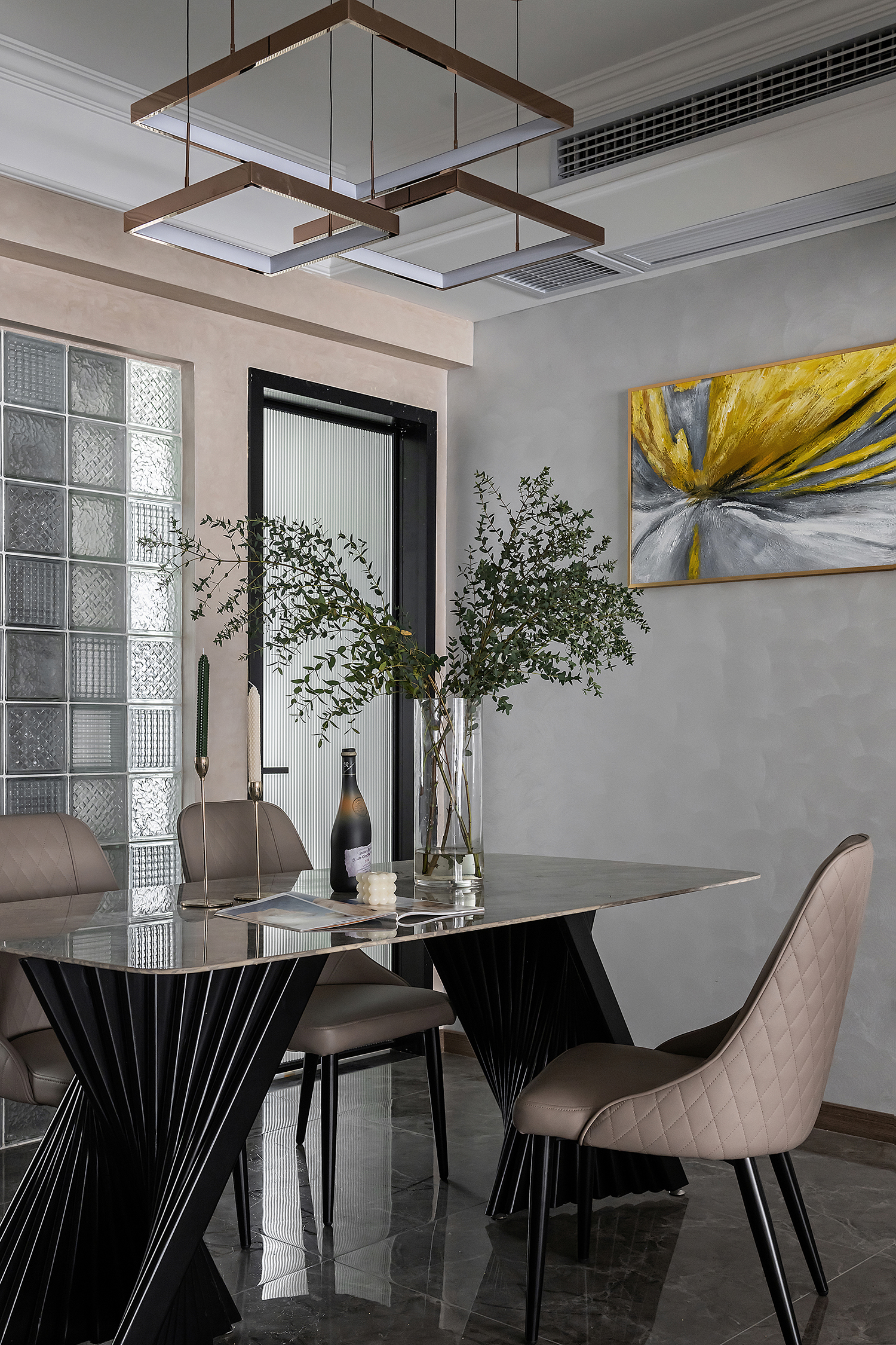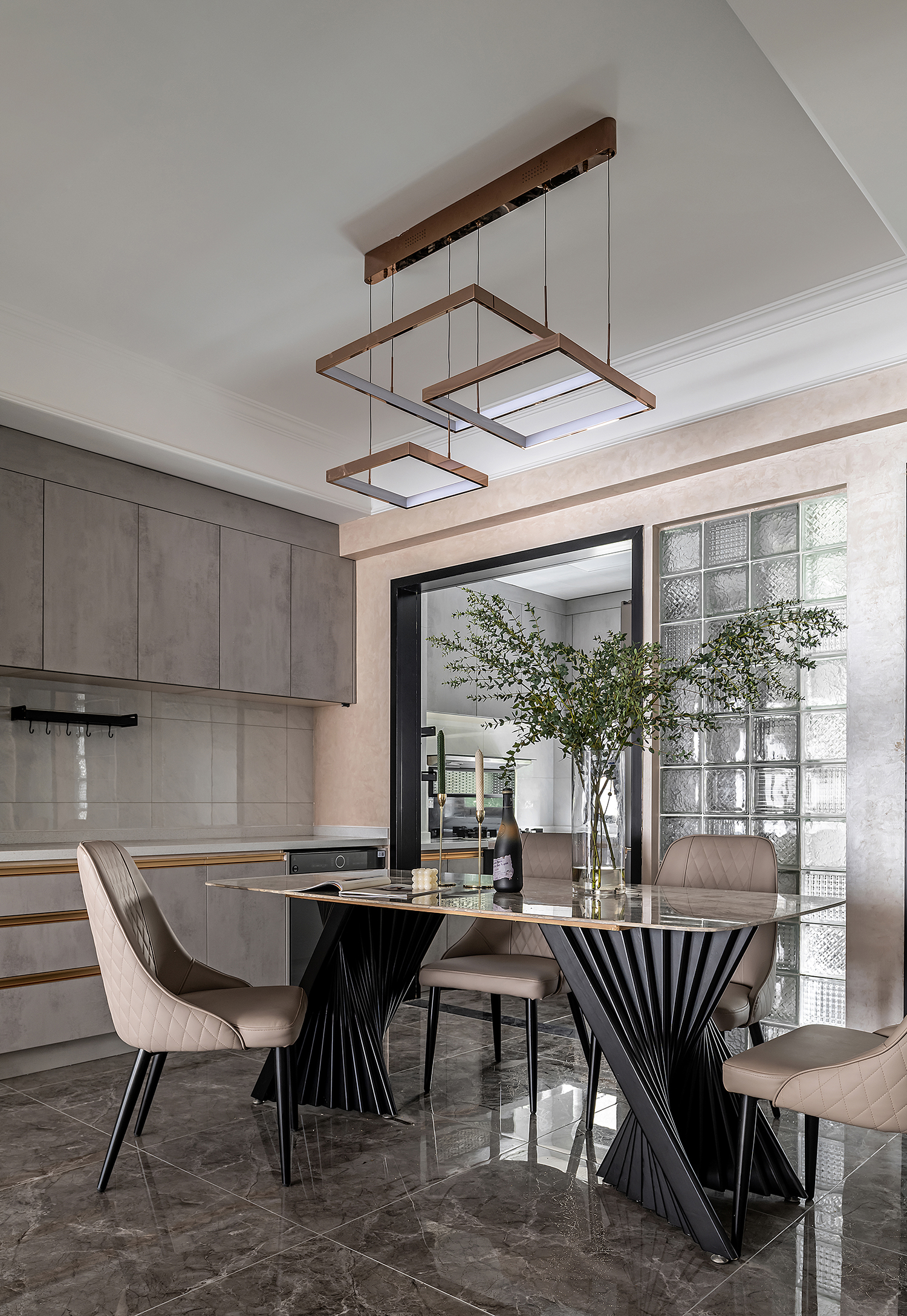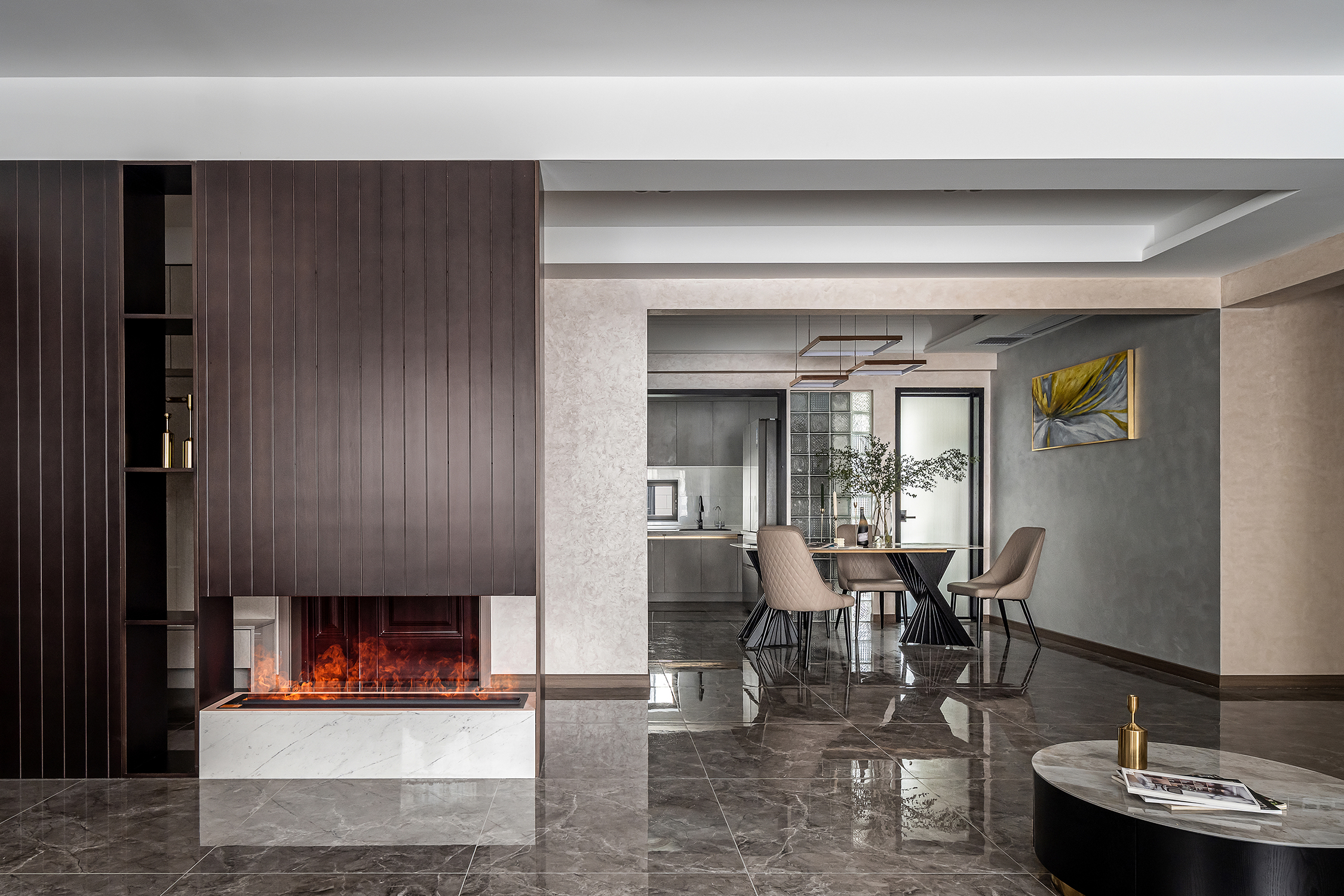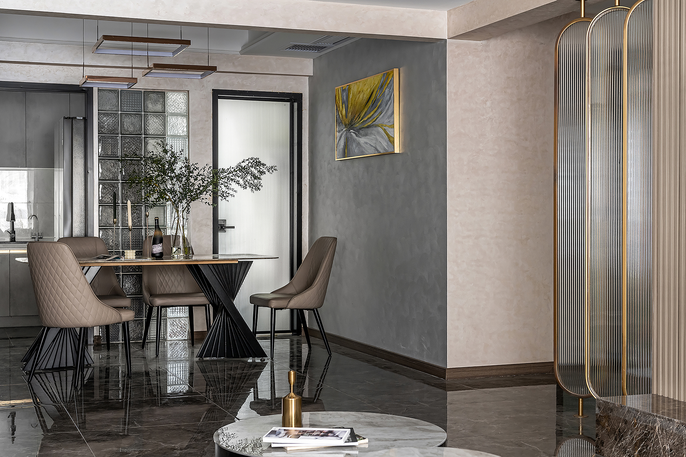 设计选材:整个空间主要是以各种通透玻璃以及纹理自然的大理石打造轻奢的品质感,让整个空间显得时尚而大气的同时,又不失空间的通透感,再用深色的板材,少量装饰,整个空间低调而内敛。