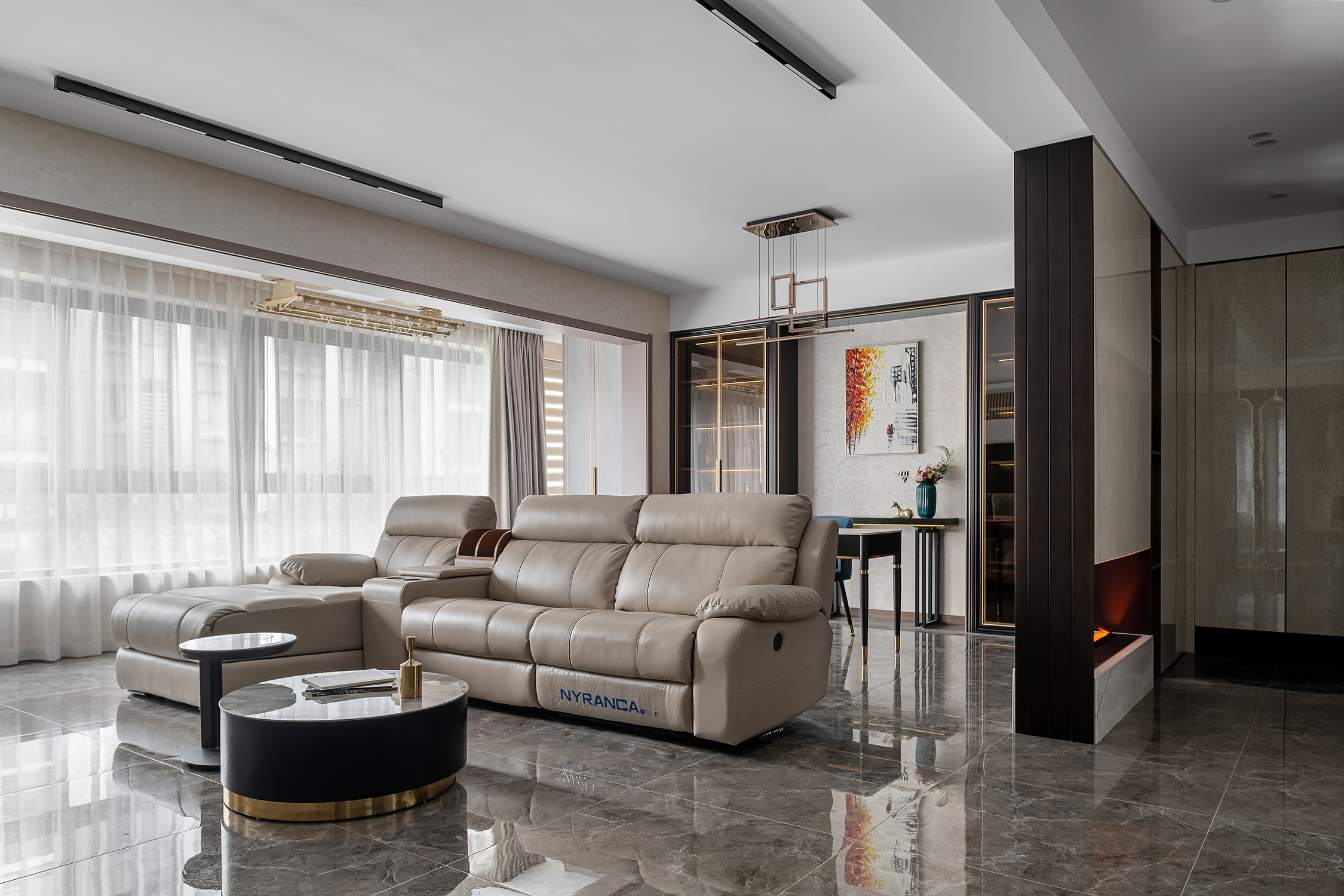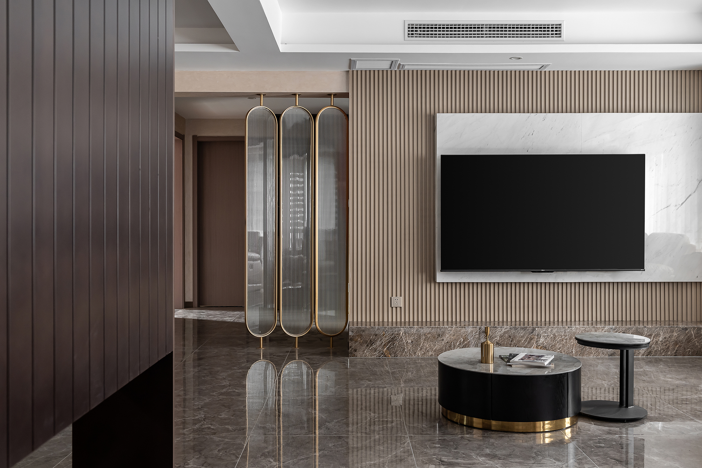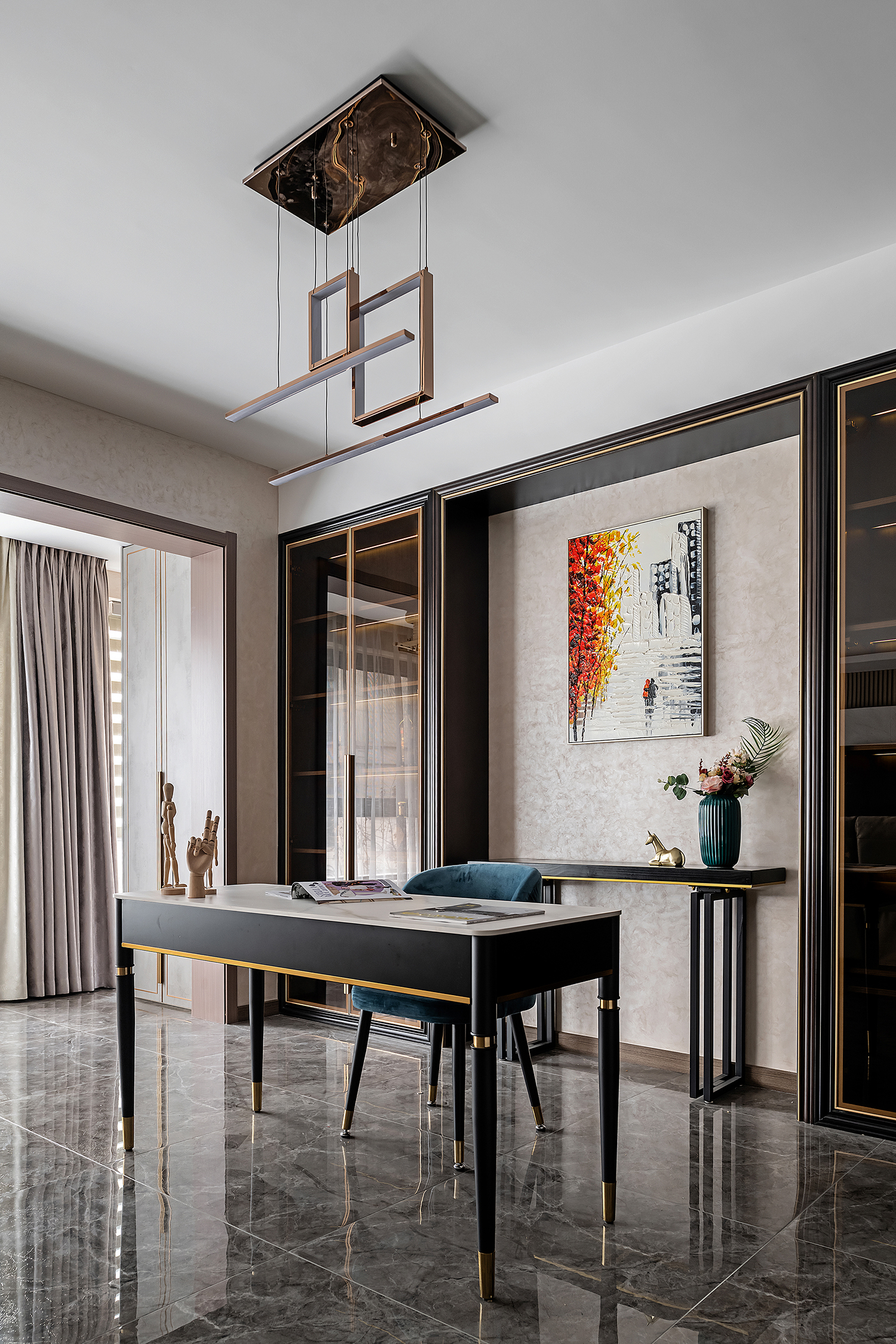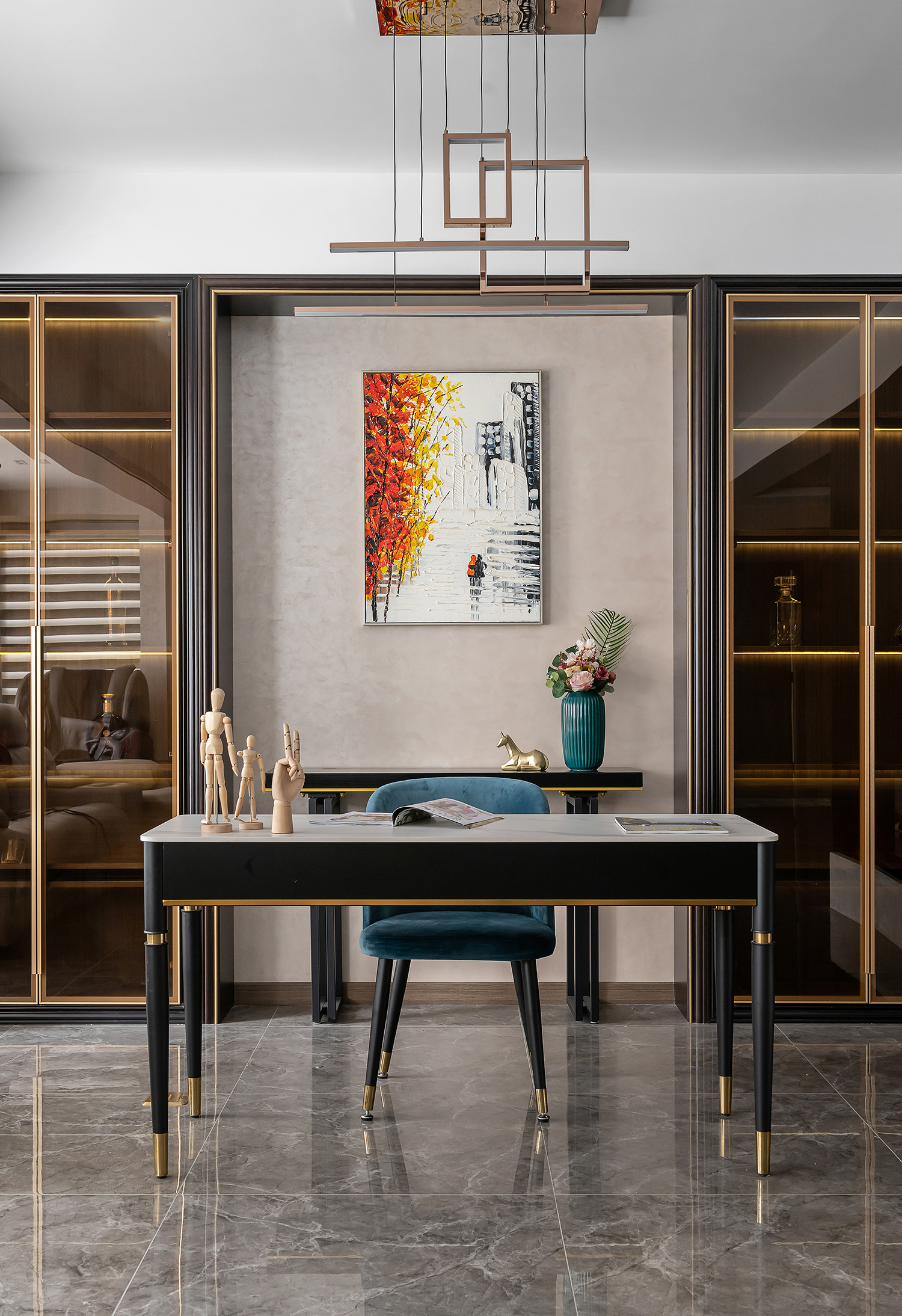 设计选材:整个空间主要是以各种通透玻璃以及纹理自然的大理石打造轻奢的品质感,让整个空间显得时尚而大气的同时,又不失空间的通透感,再用深色的板材,少量装饰,整个空间低调而内敛。