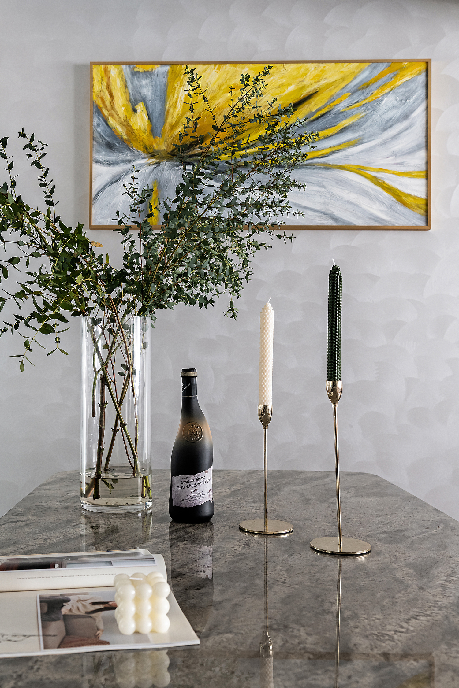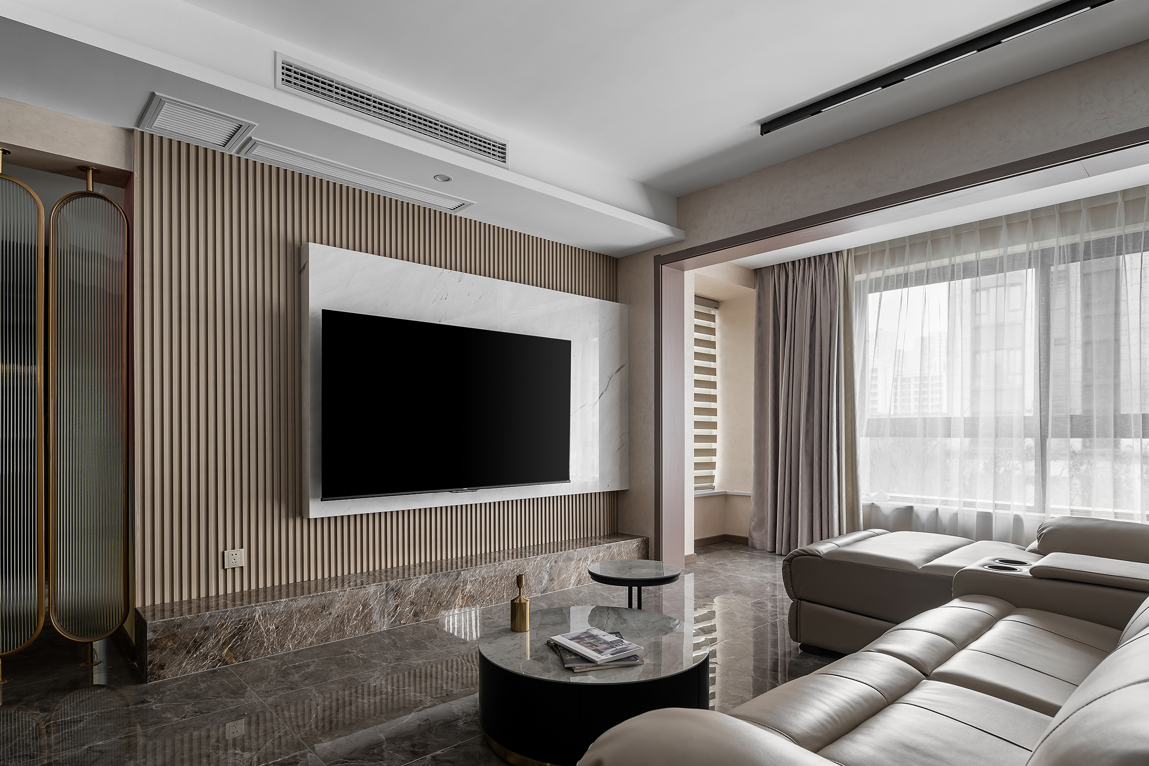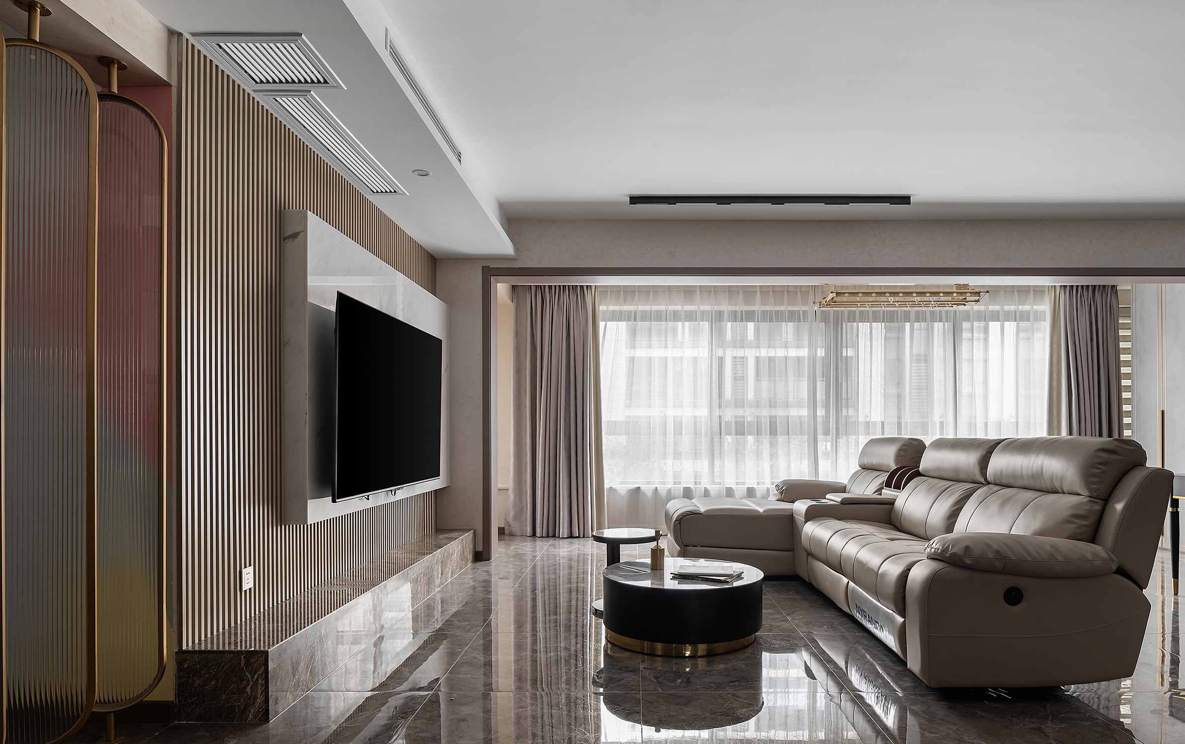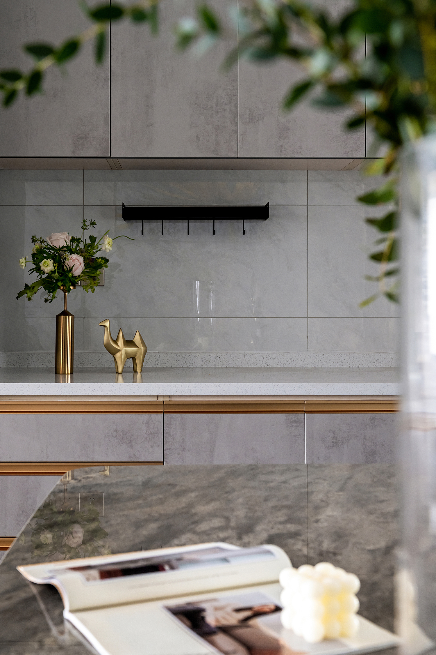 设计选材:整个空间主要是以各种通透玻璃以及纹理自然的大理石打造轻奢的品质感,让整个空间显得时尚而大气的同时,又不失空间的通透感,再用深色的板材,少量装饰,整个空间低调而内敛。