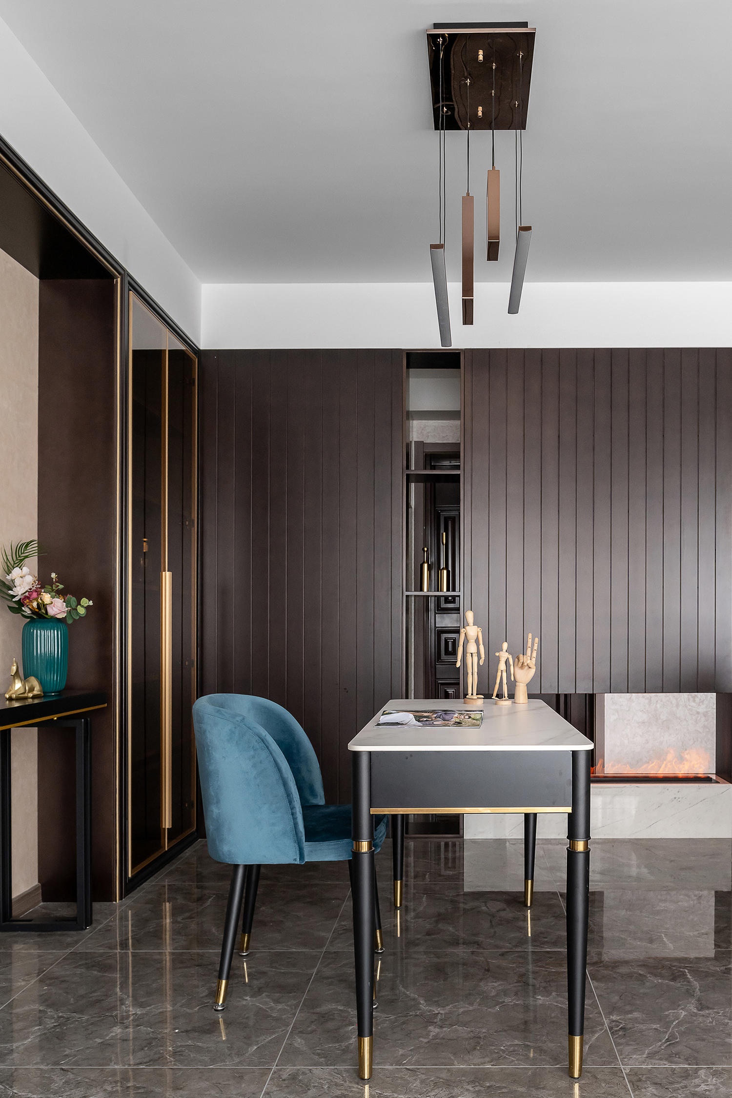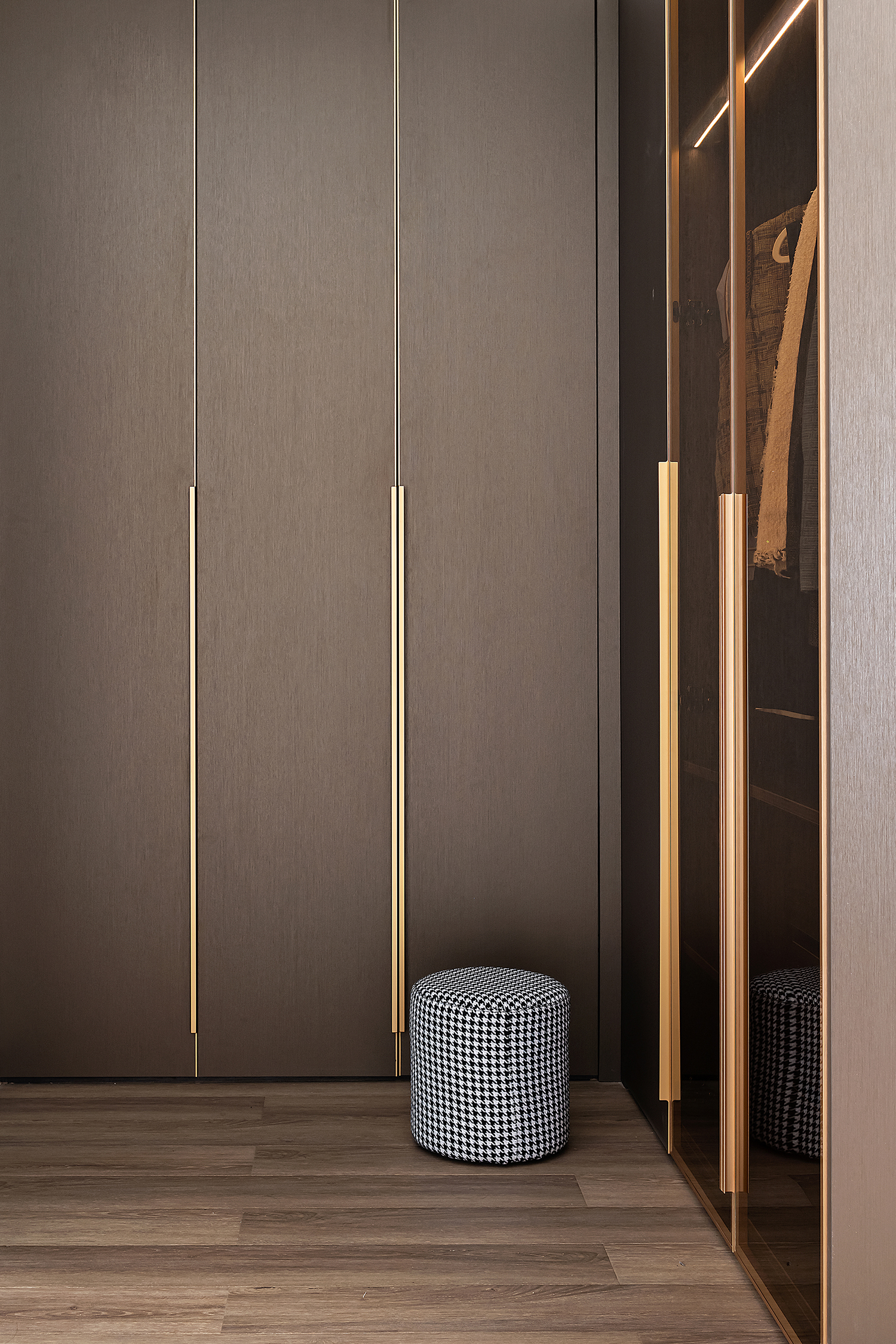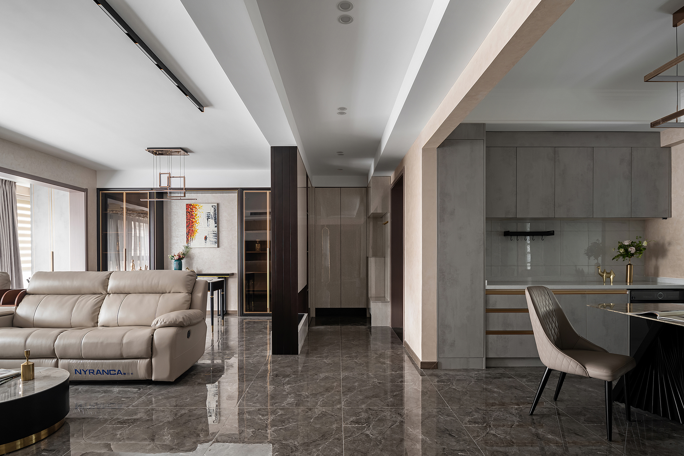 空间意境:本案风格是轻奢风,整体色调统一而偏向暗色系,营造出内敛而高级的氛围感,整体设计上主要是凸显出轻奢风的大气优雅。