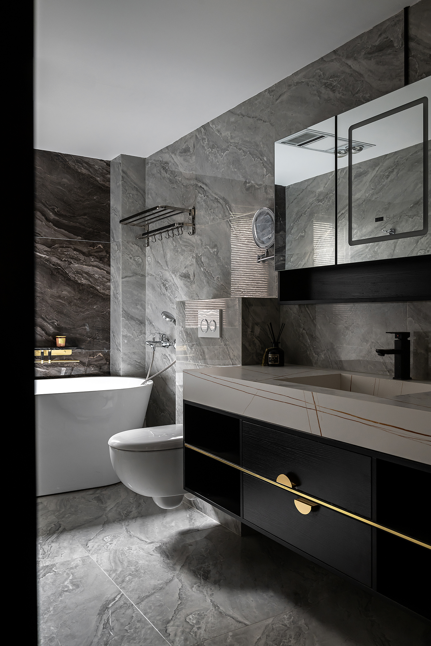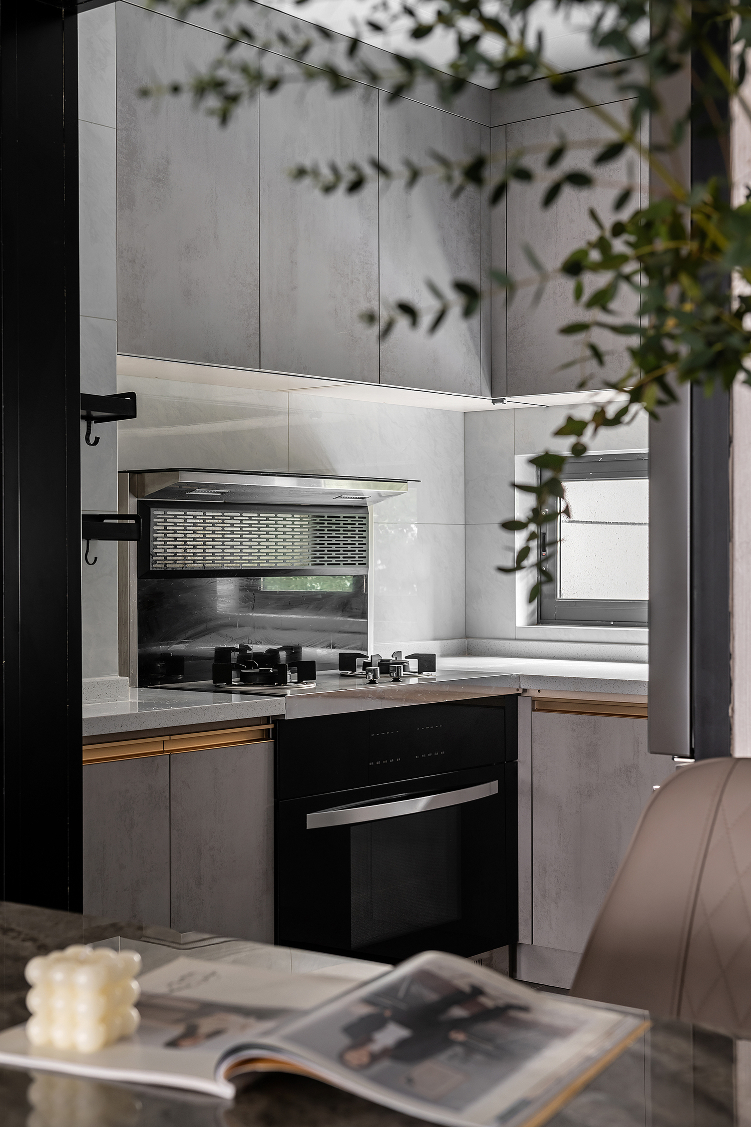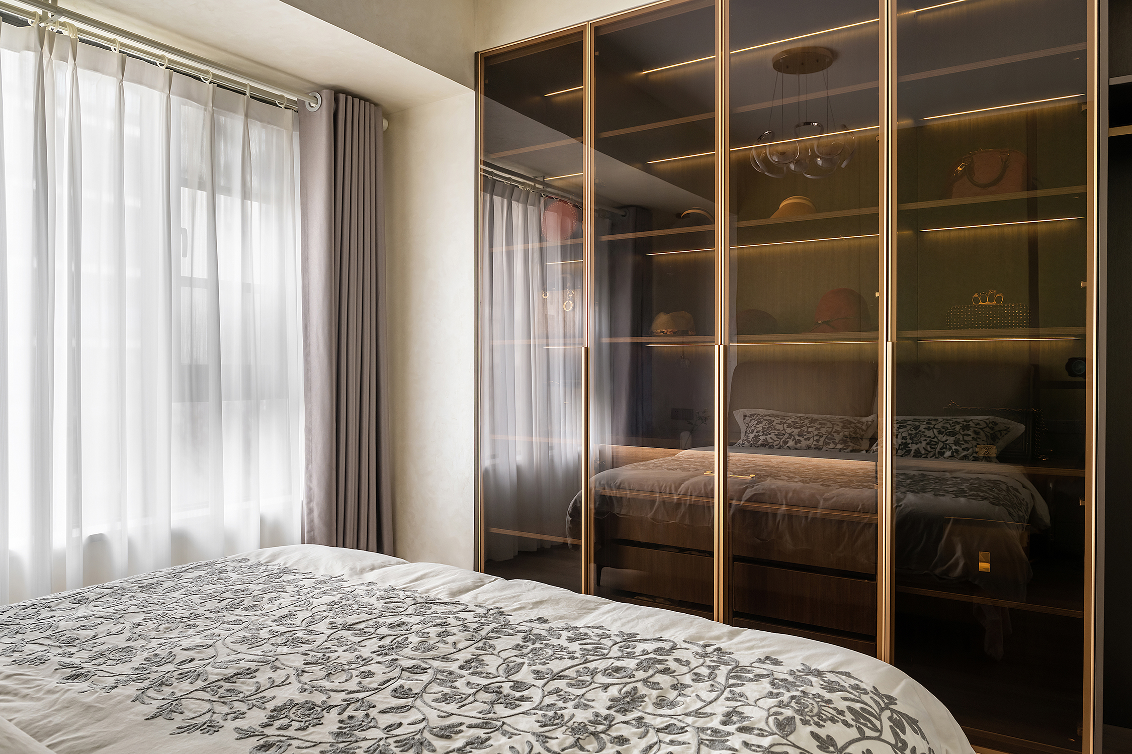 空间意境:本案风格是轻奢风,整体色调统一而偏向暗色系,营造出内敛而高级的氛围感,整体设计上主要是凸显出轻奢风的大气优雅。