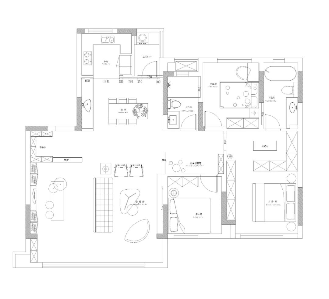 空间布局:在整个空间布局上,将整个公区的空间连通,开放式的书房设计,以及开放式的厨房设计,将整个客餐厨做到通透流畅,让整个公共区域开阔大气,休息区又做到了安静私密的效果,尤其是主卧,舒适与功能性兼具。