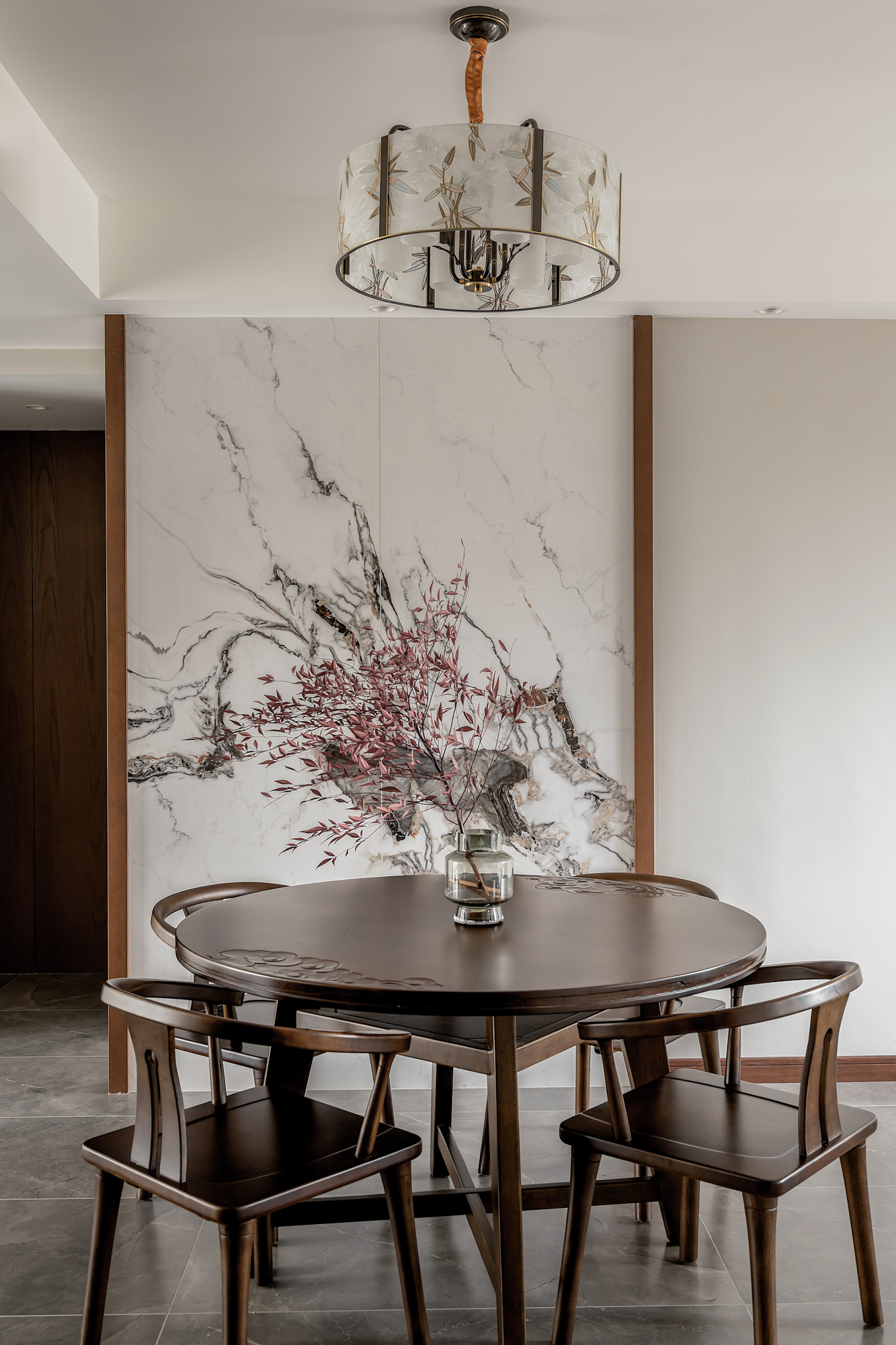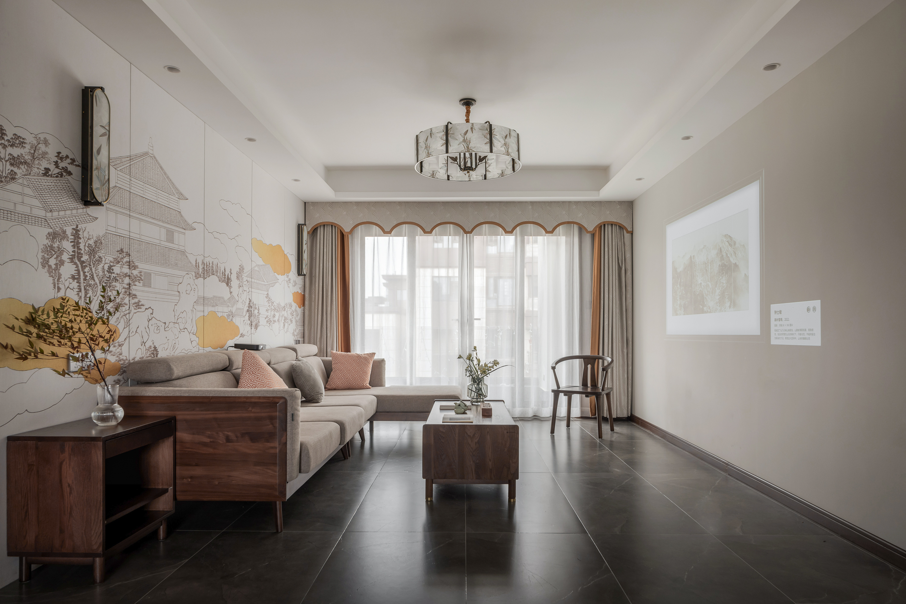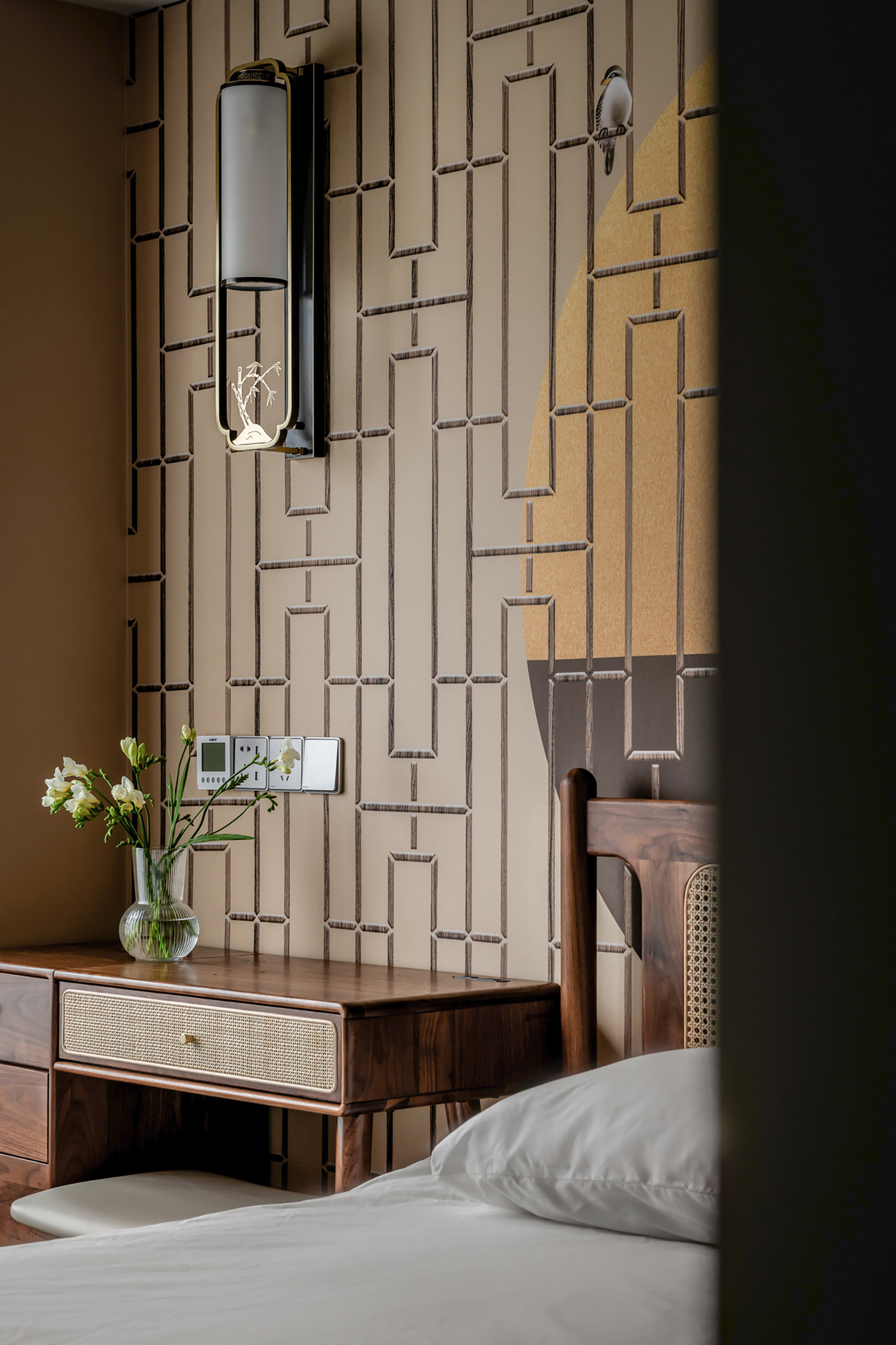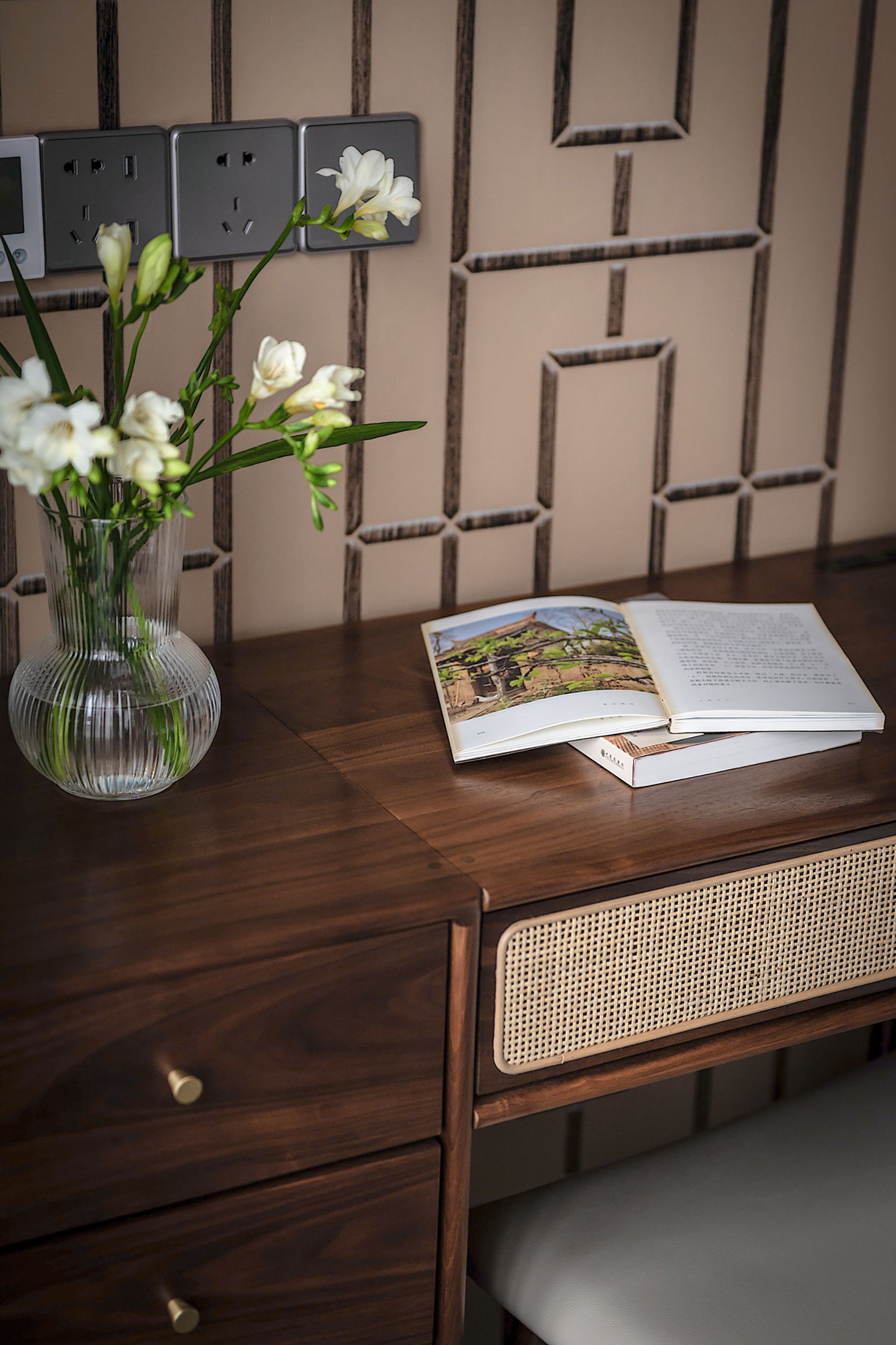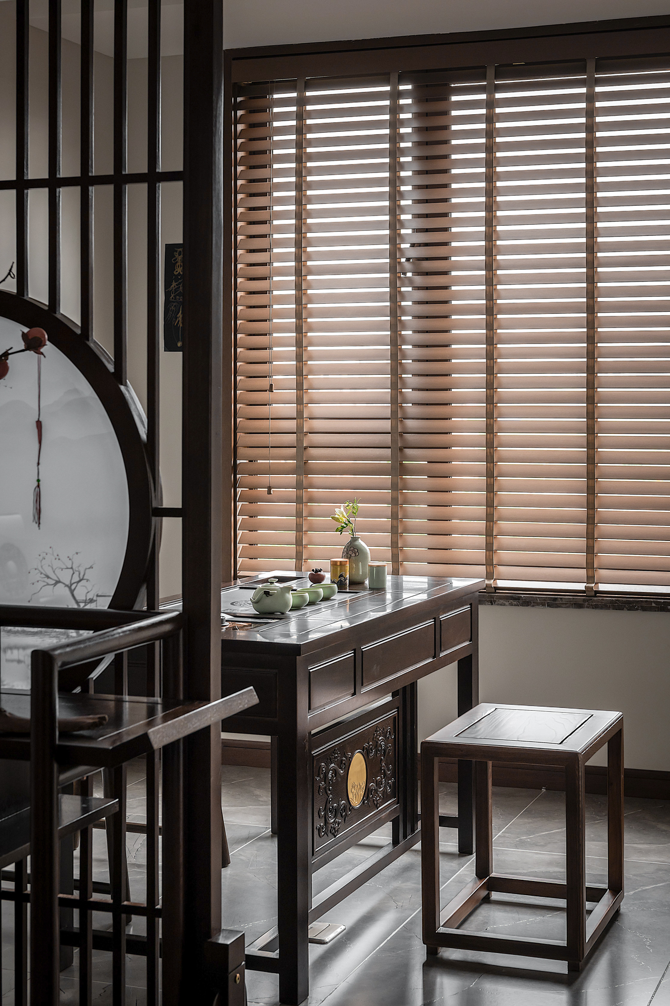 设计选材:全屋家具采用实木家具,展现中式之美,大多采用深色胡桃木打造深邃静谧感,部分空间用工笔画的墙布装饰,体现中式韵味,公区暖白的墙漆,更显温柔。