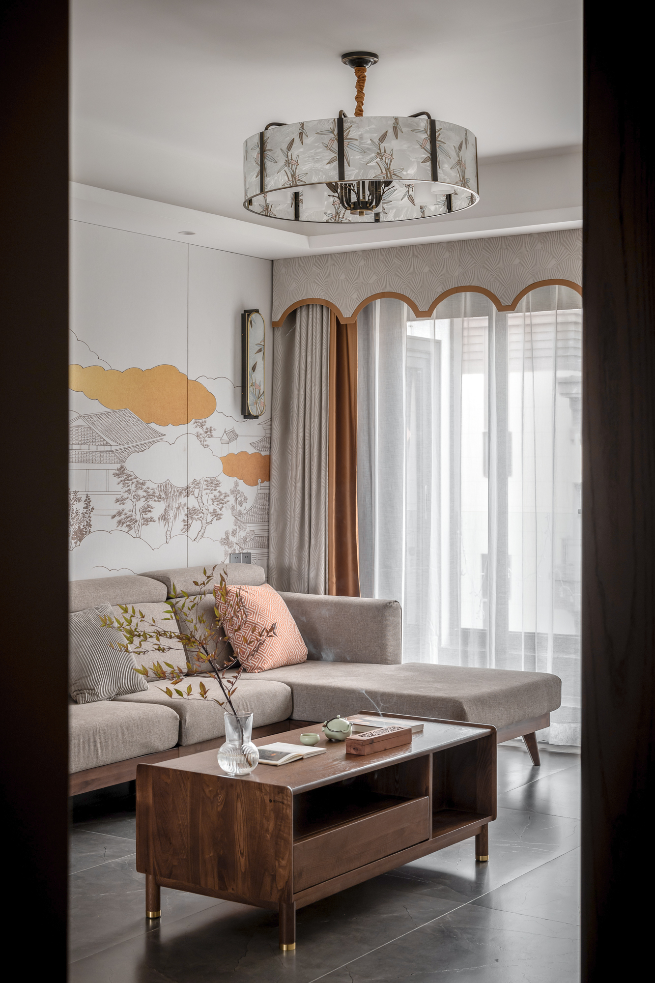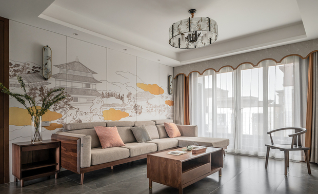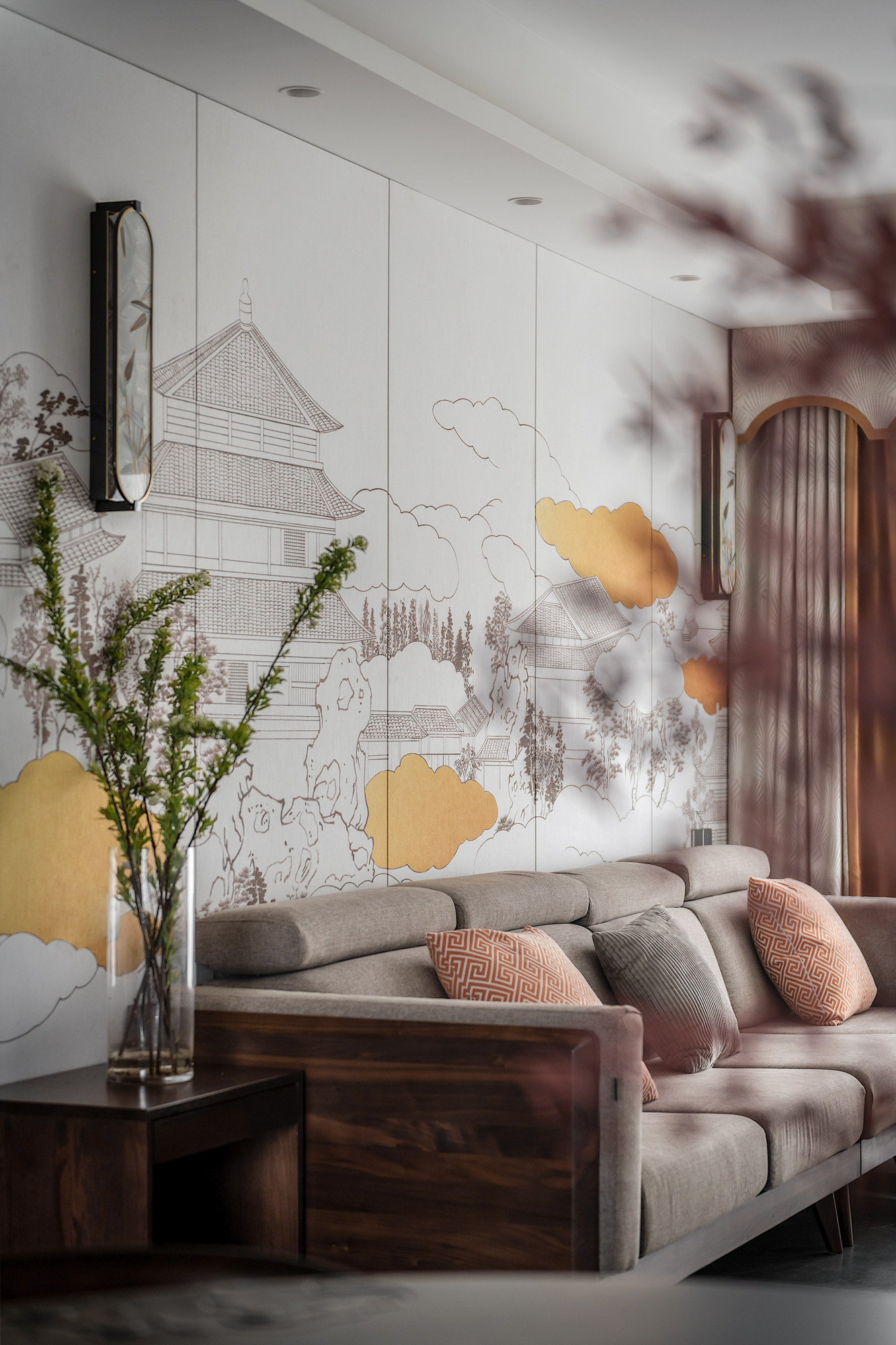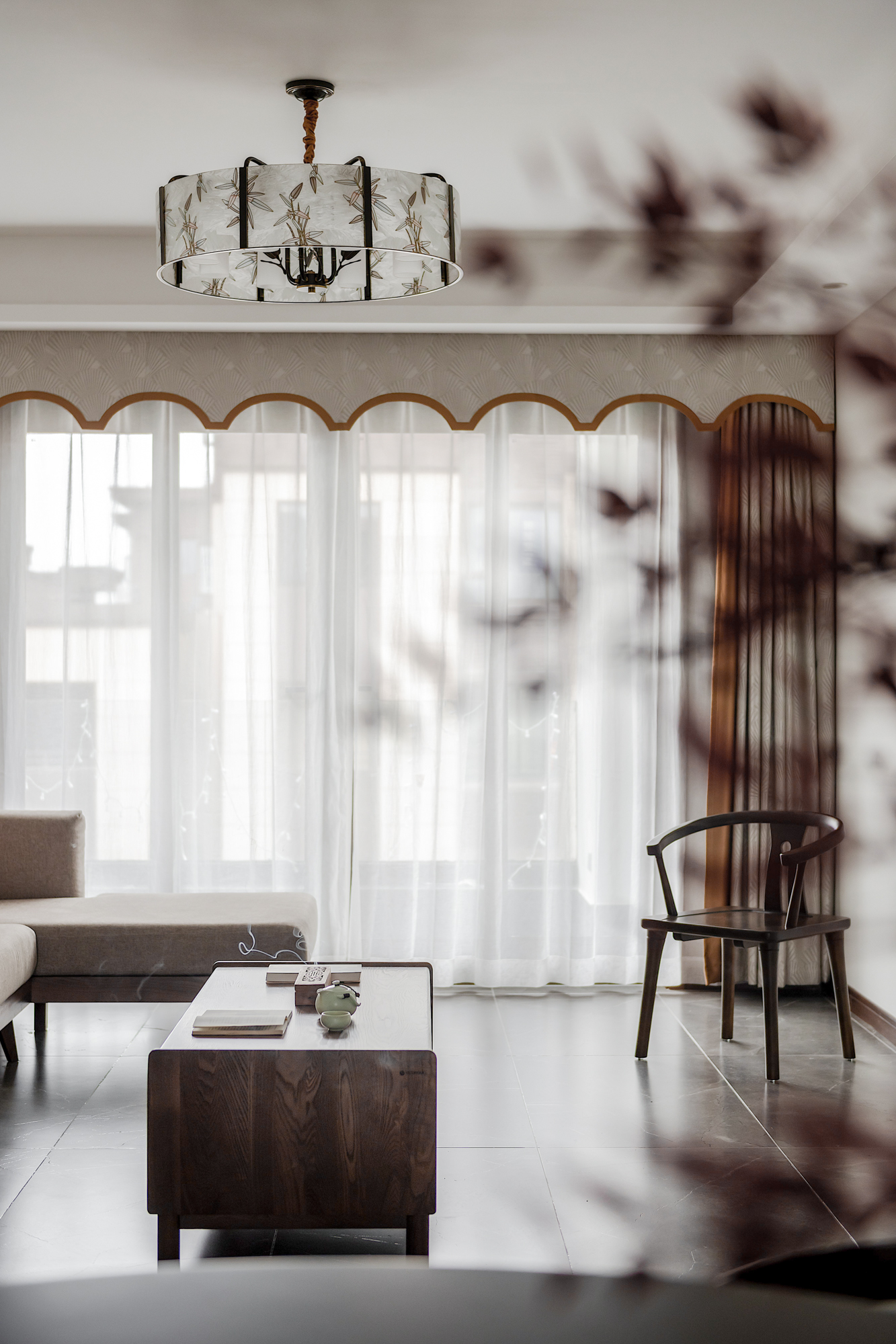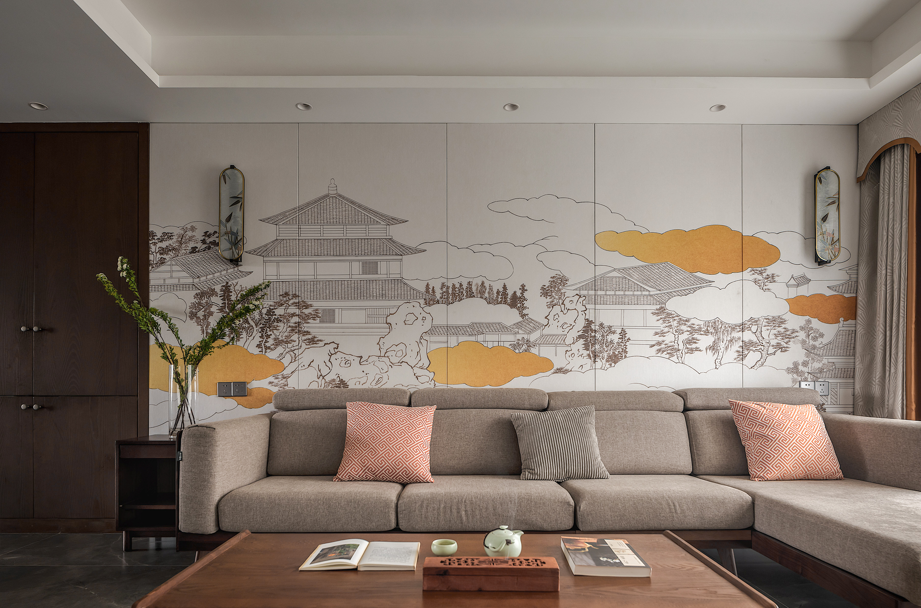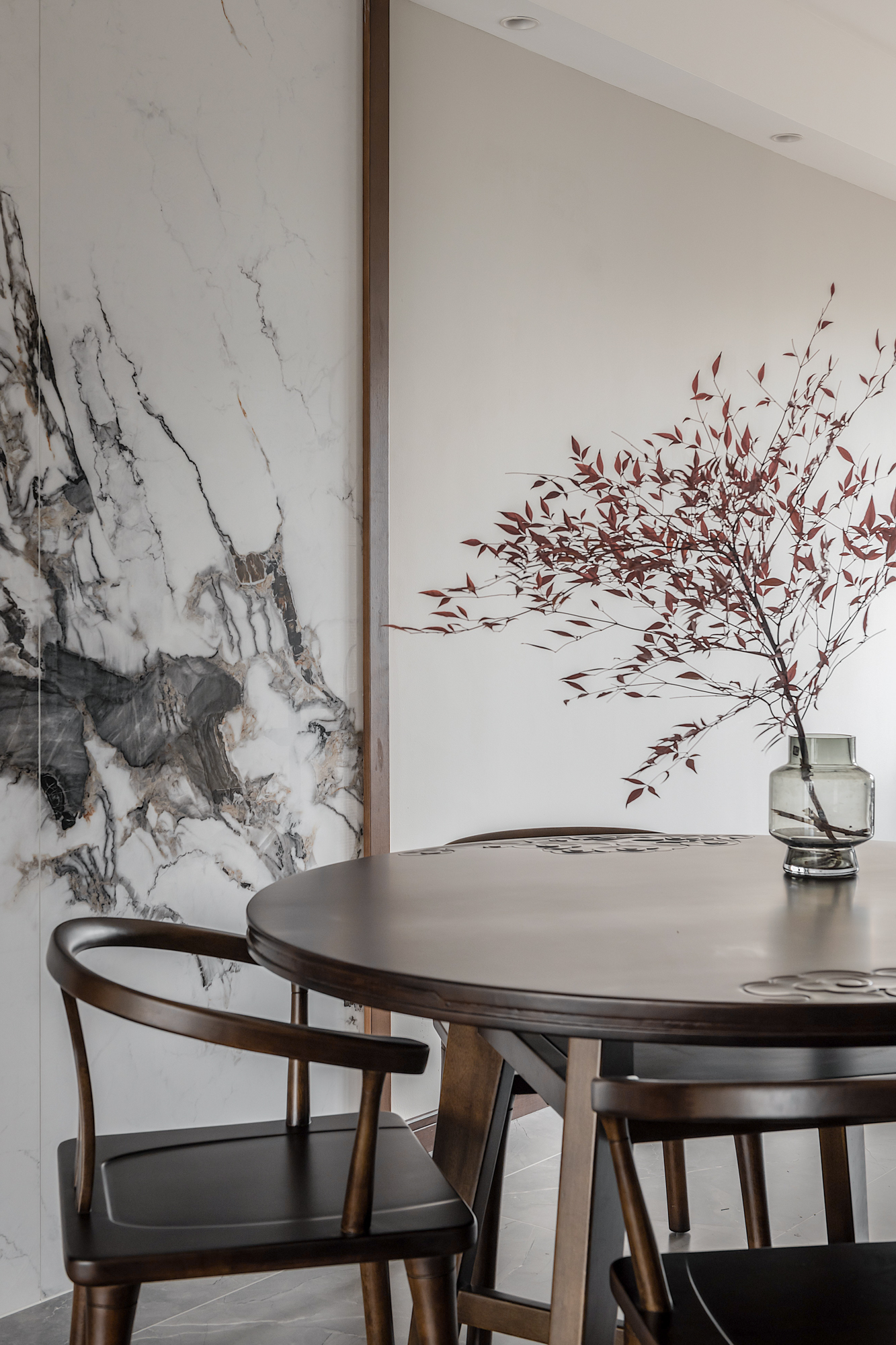 设计选材:全屋家具采用实木家具,展现中式之美,大多采用深色胡桃木打造深邃静谧感,部分空间用工笔画的墙布装饰,体现中式韵味,公区暖白的墙漆,更显温柔。