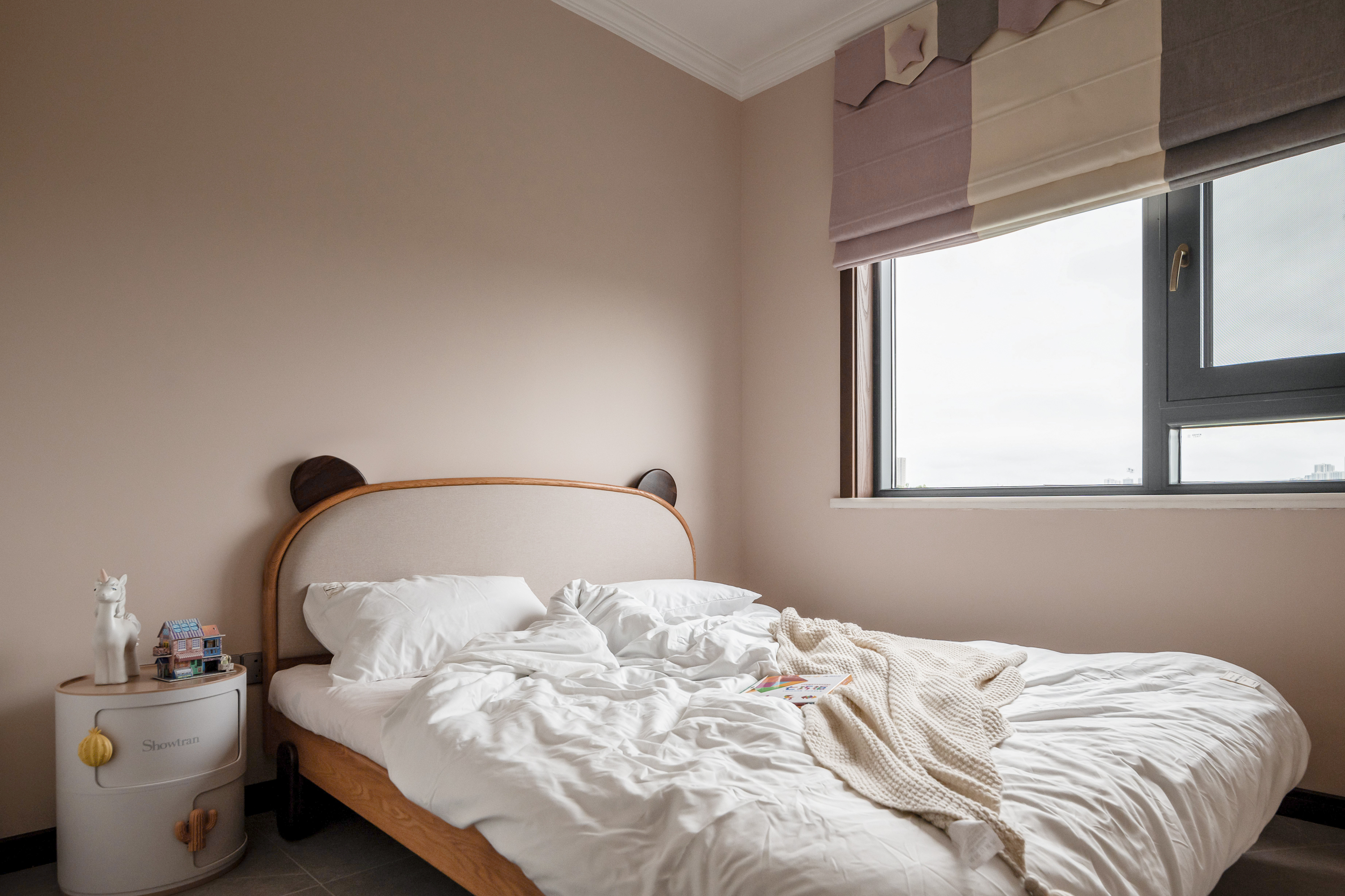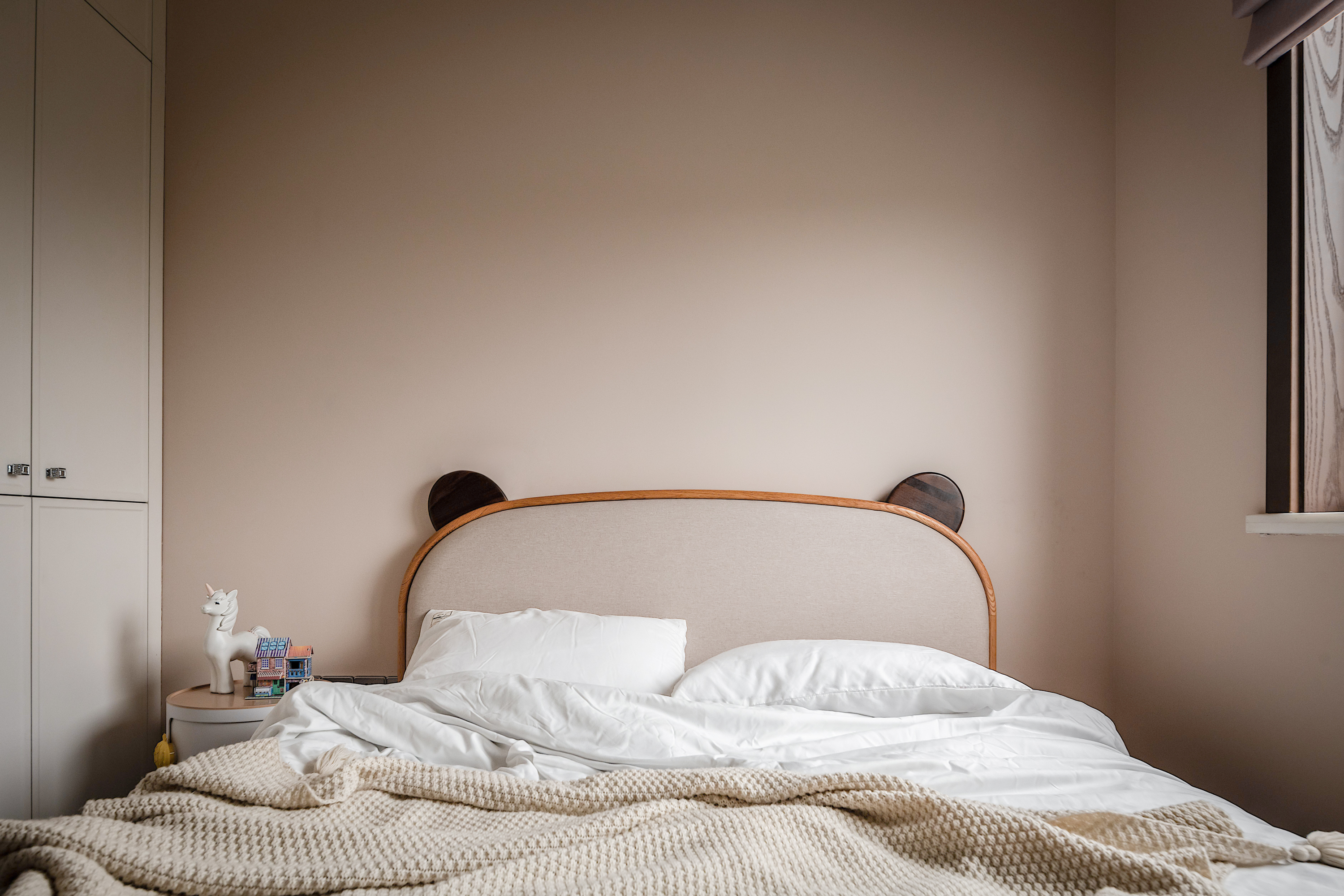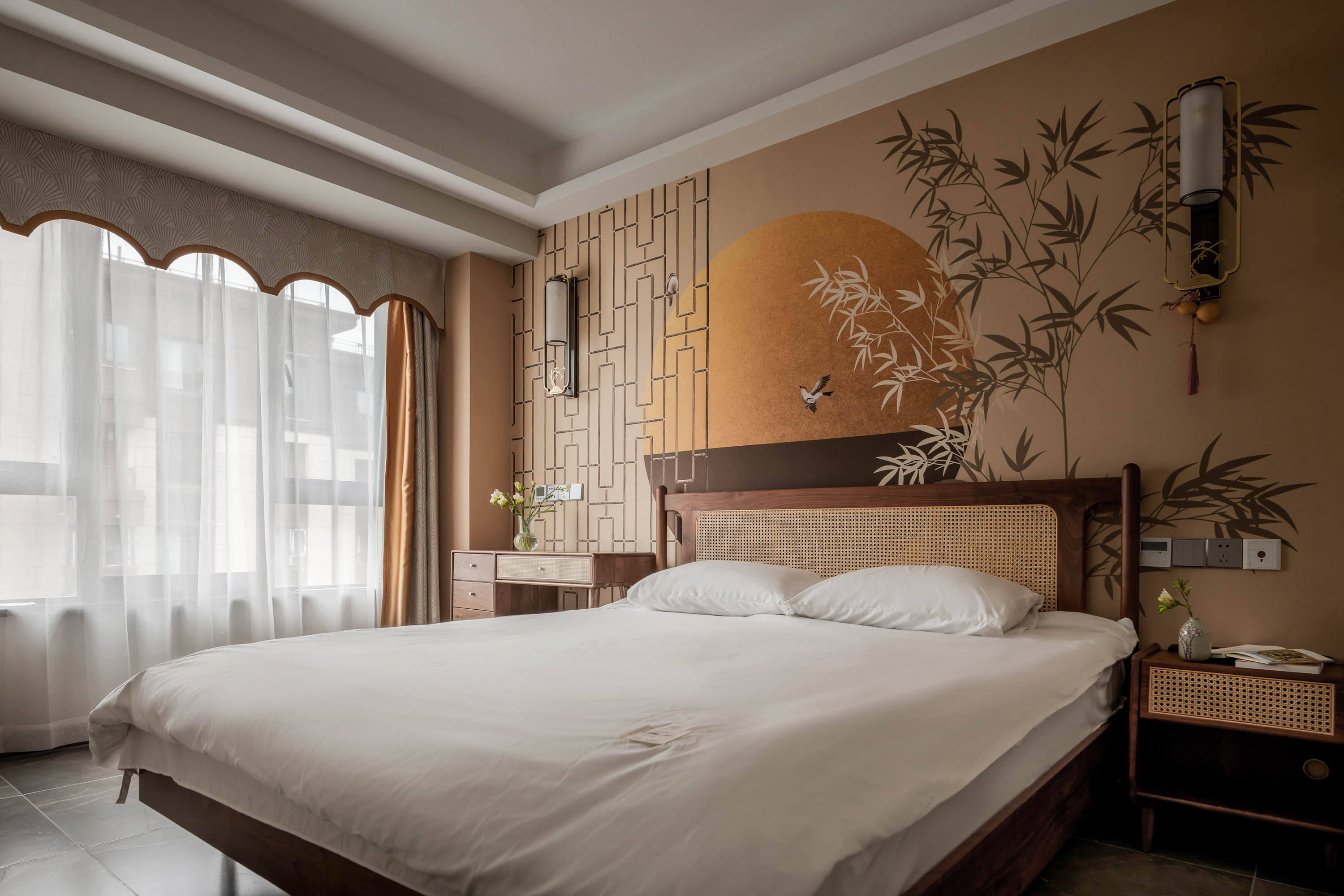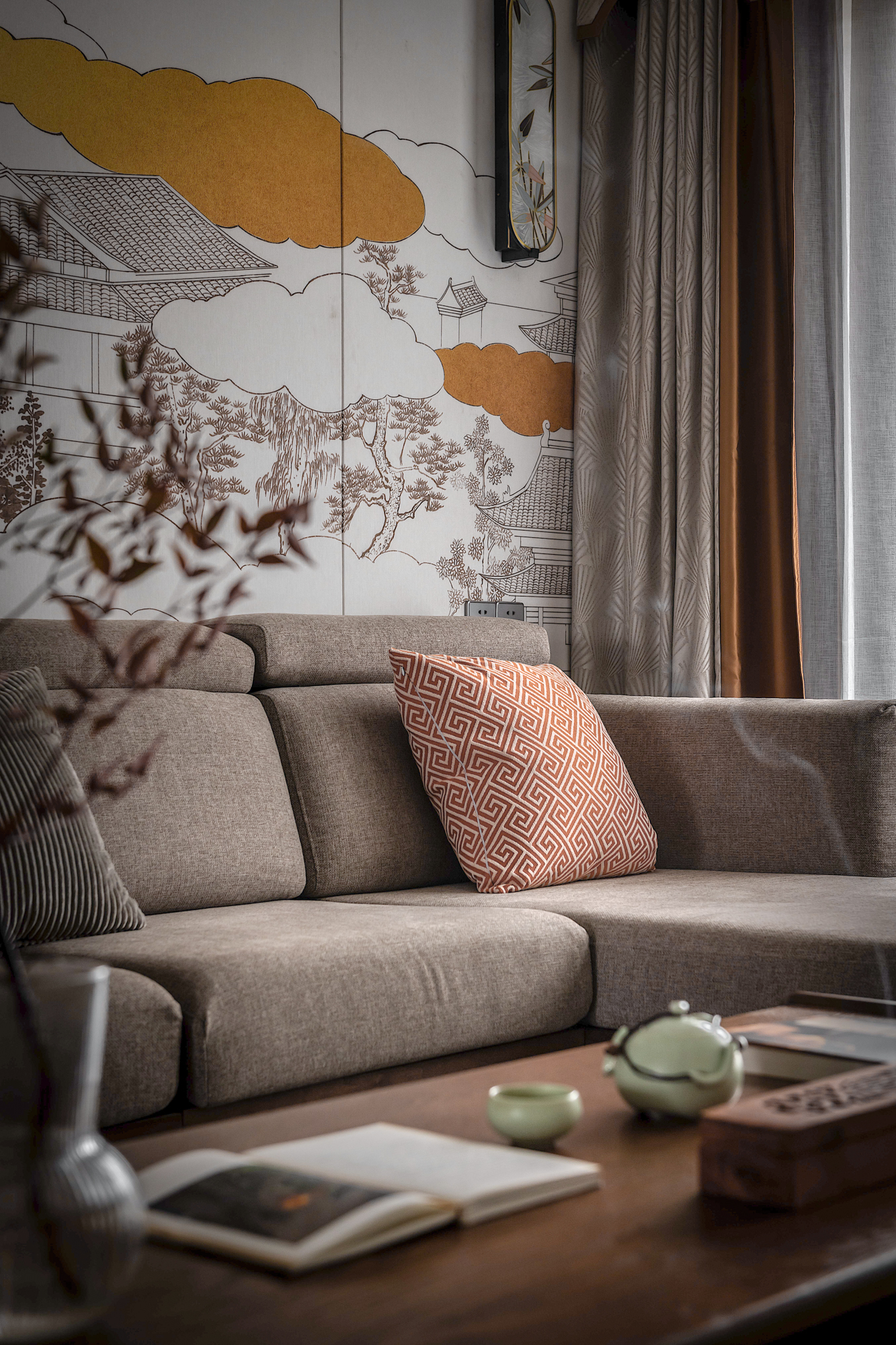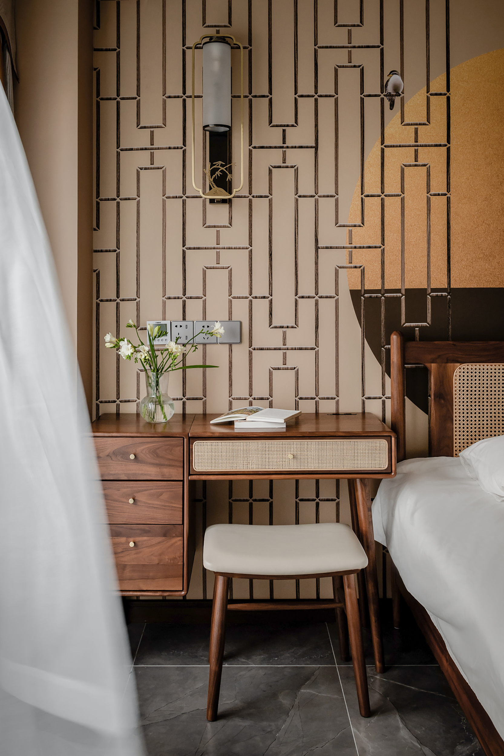 设计选材:全屋家具采用实木家具,展现中式之美,大多采用深色胡桃木打造深邃静谧感,部分空间用工笔画的墙布装饰,体现中式韵味,公区暖白的墙漆,更显温柔。