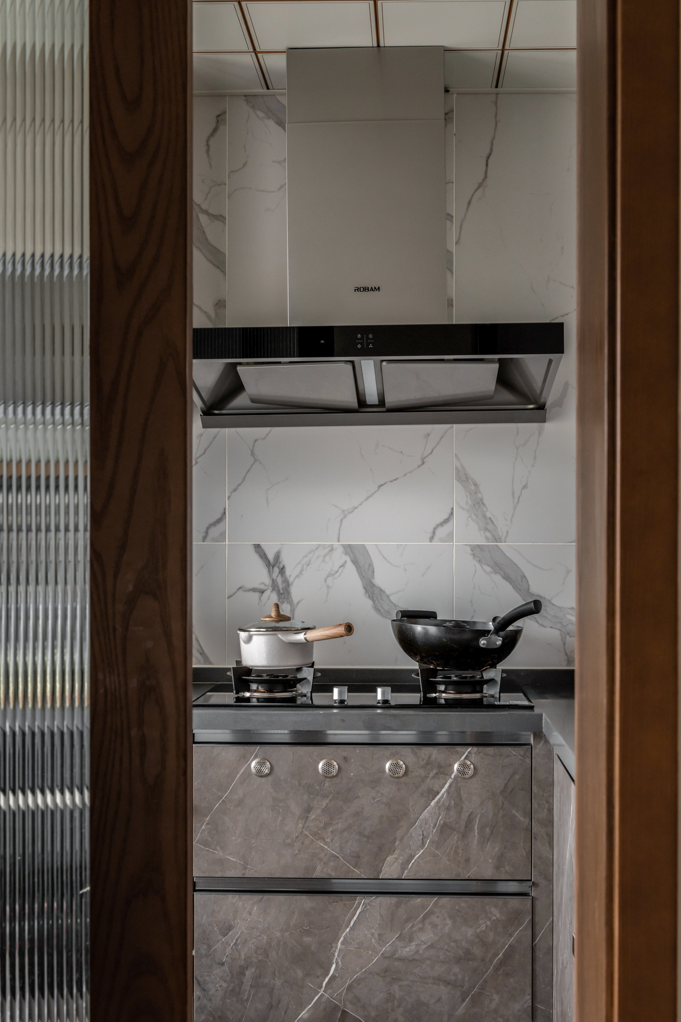 空间意境:本案的风格为新中式,不同于其它新中式沉闷老气的效果,看起来更显静谧雅致,即便是这样低沉的配色,也不显压抑。