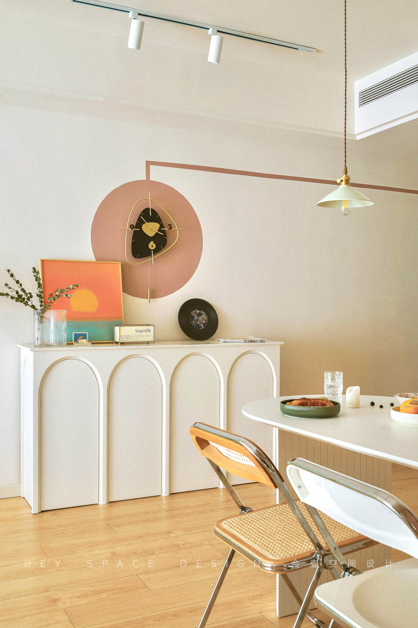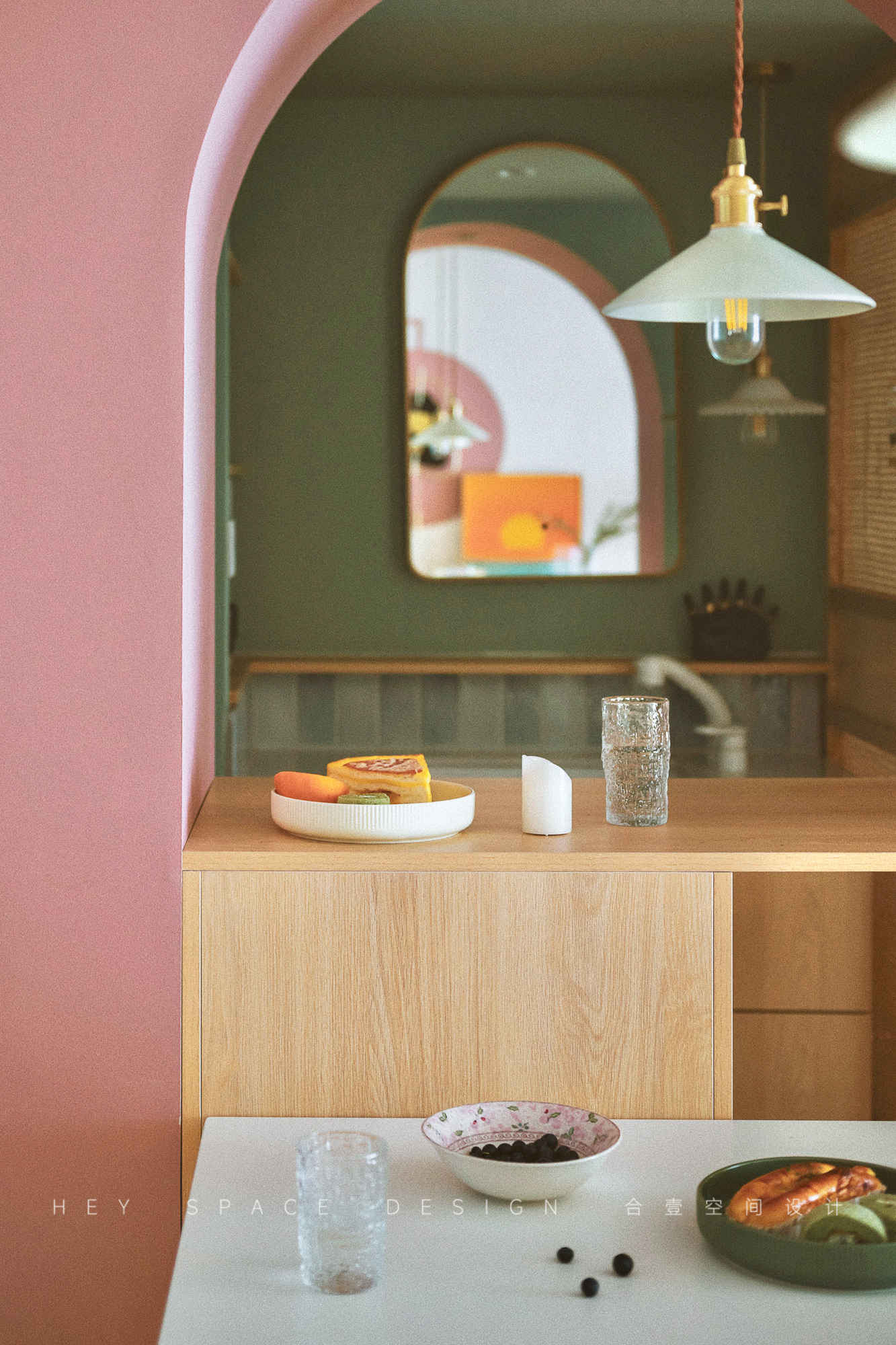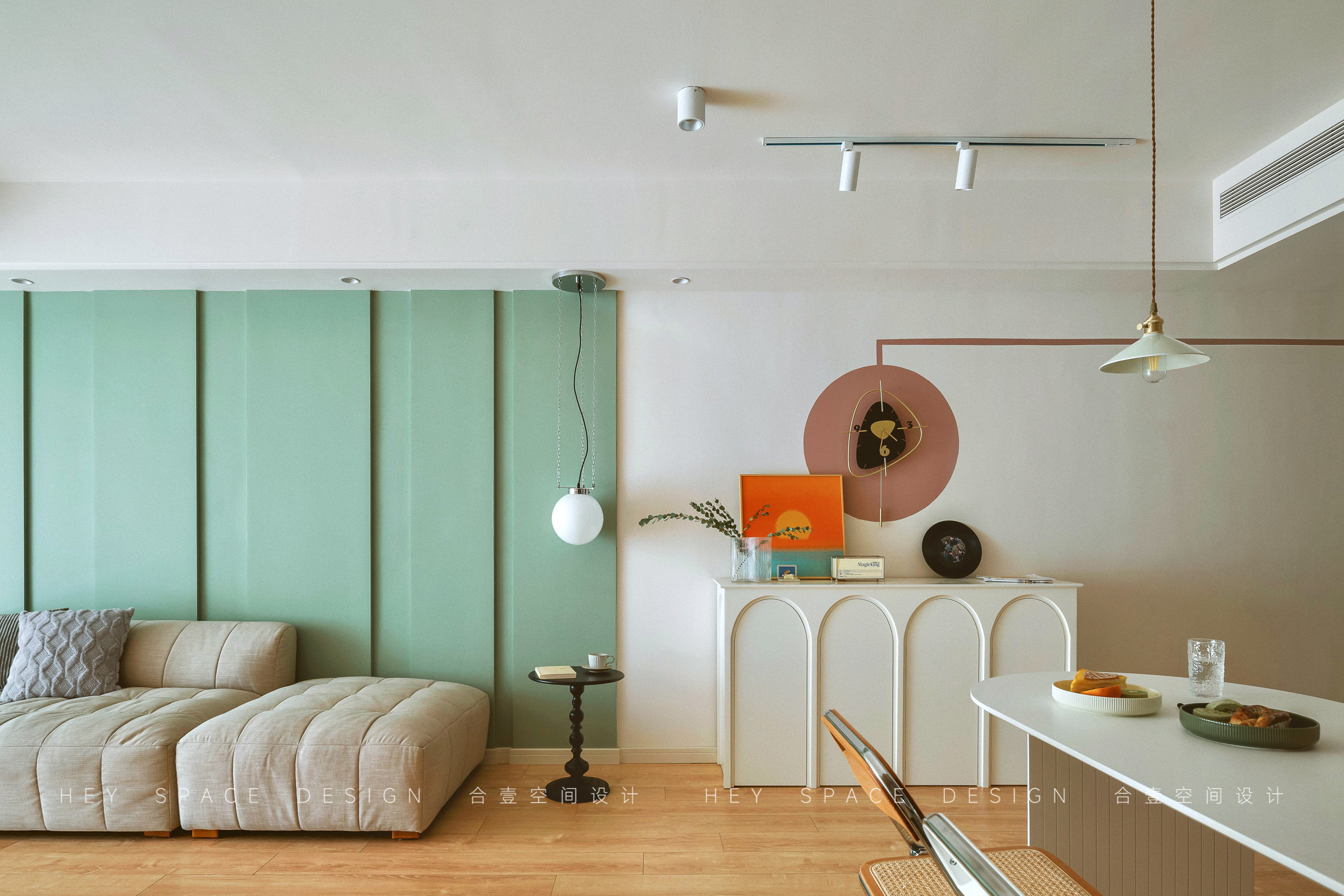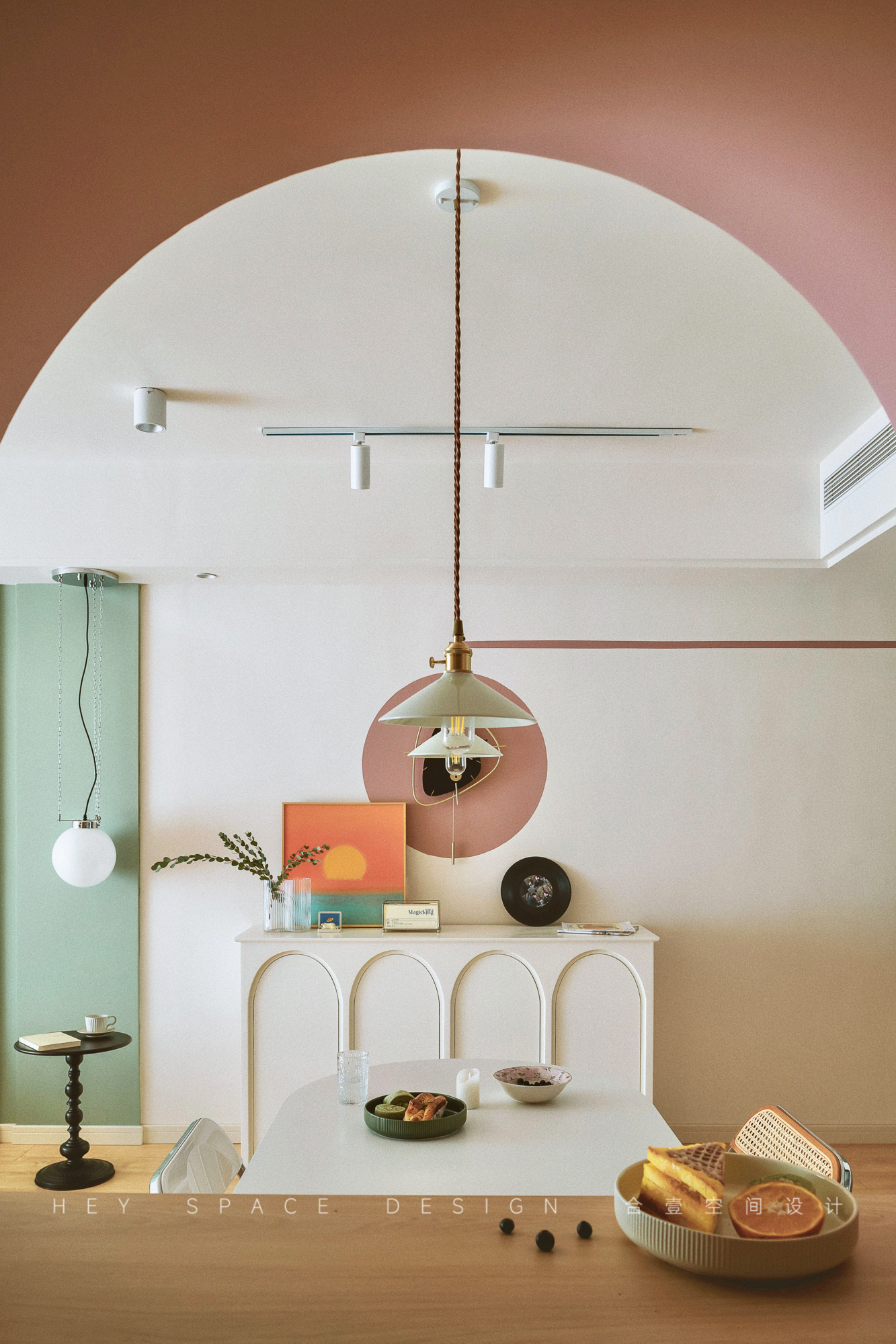 空间意境:本案的风格为复古混搭,主要的特点便是每个空间都有不一样的色系,多种色彩的碰撞对比,也让整个空间更加明艳生动。