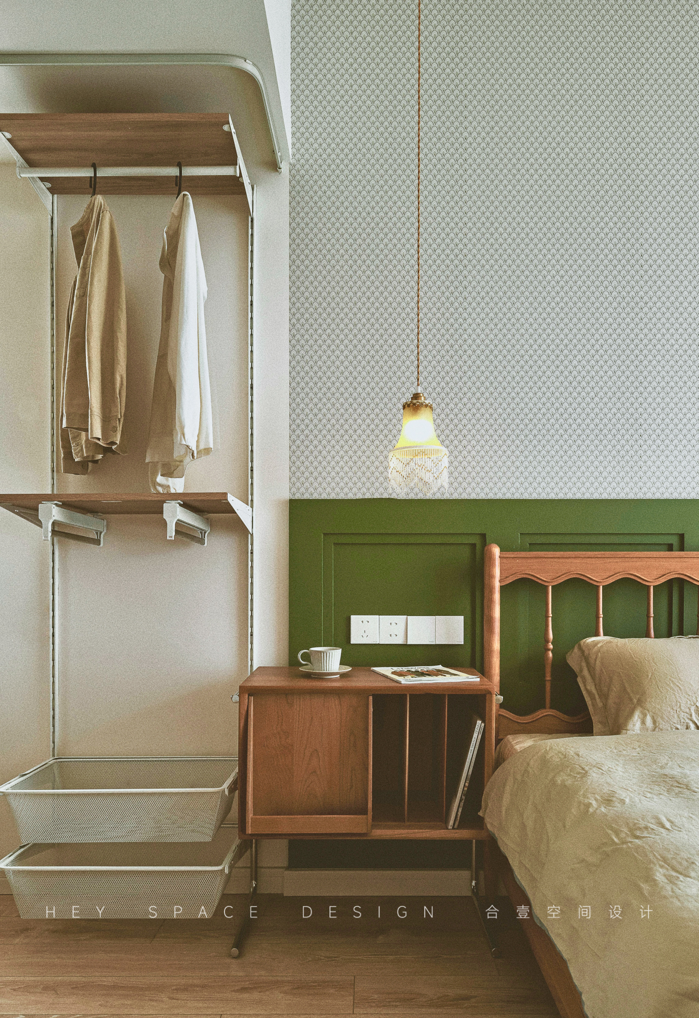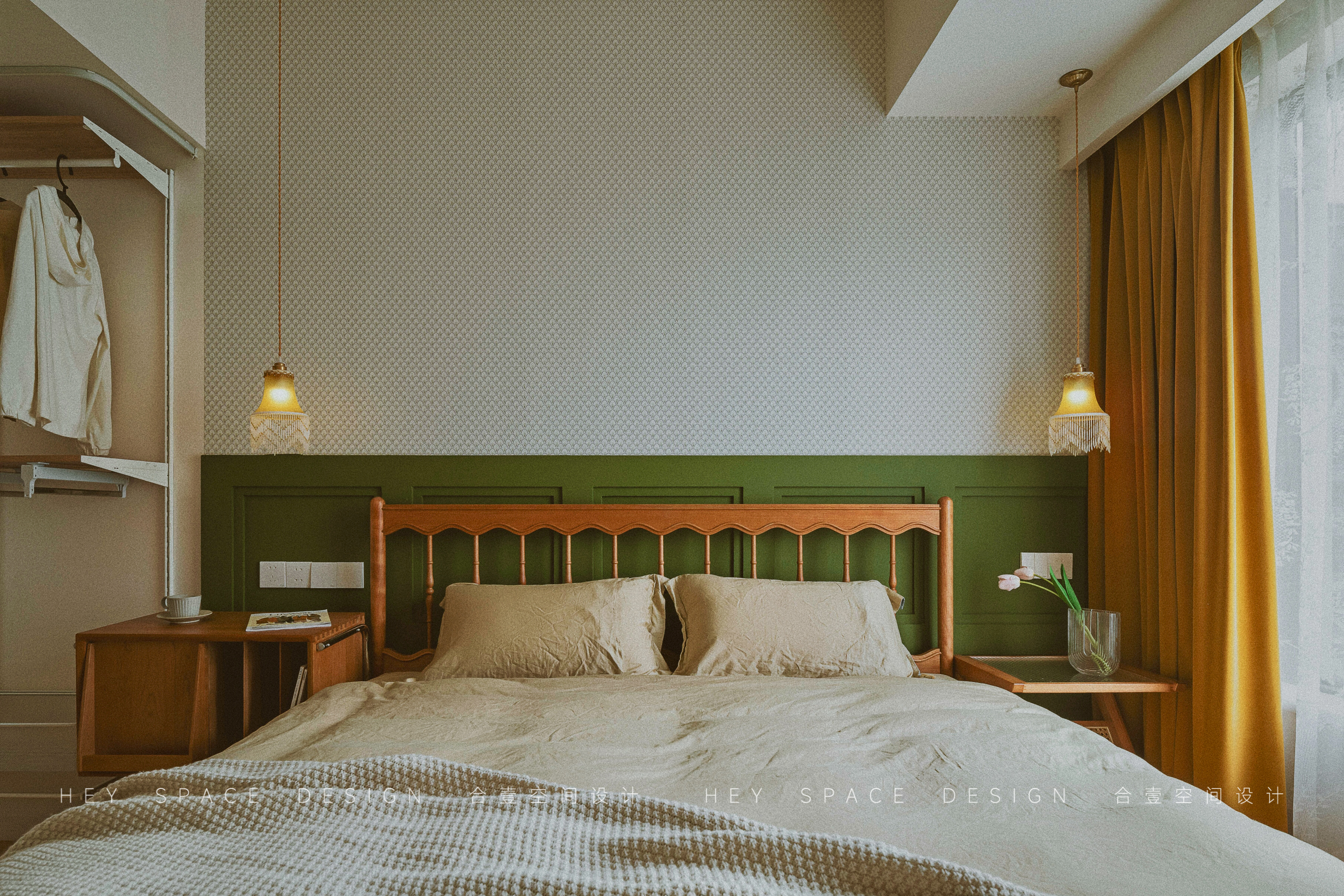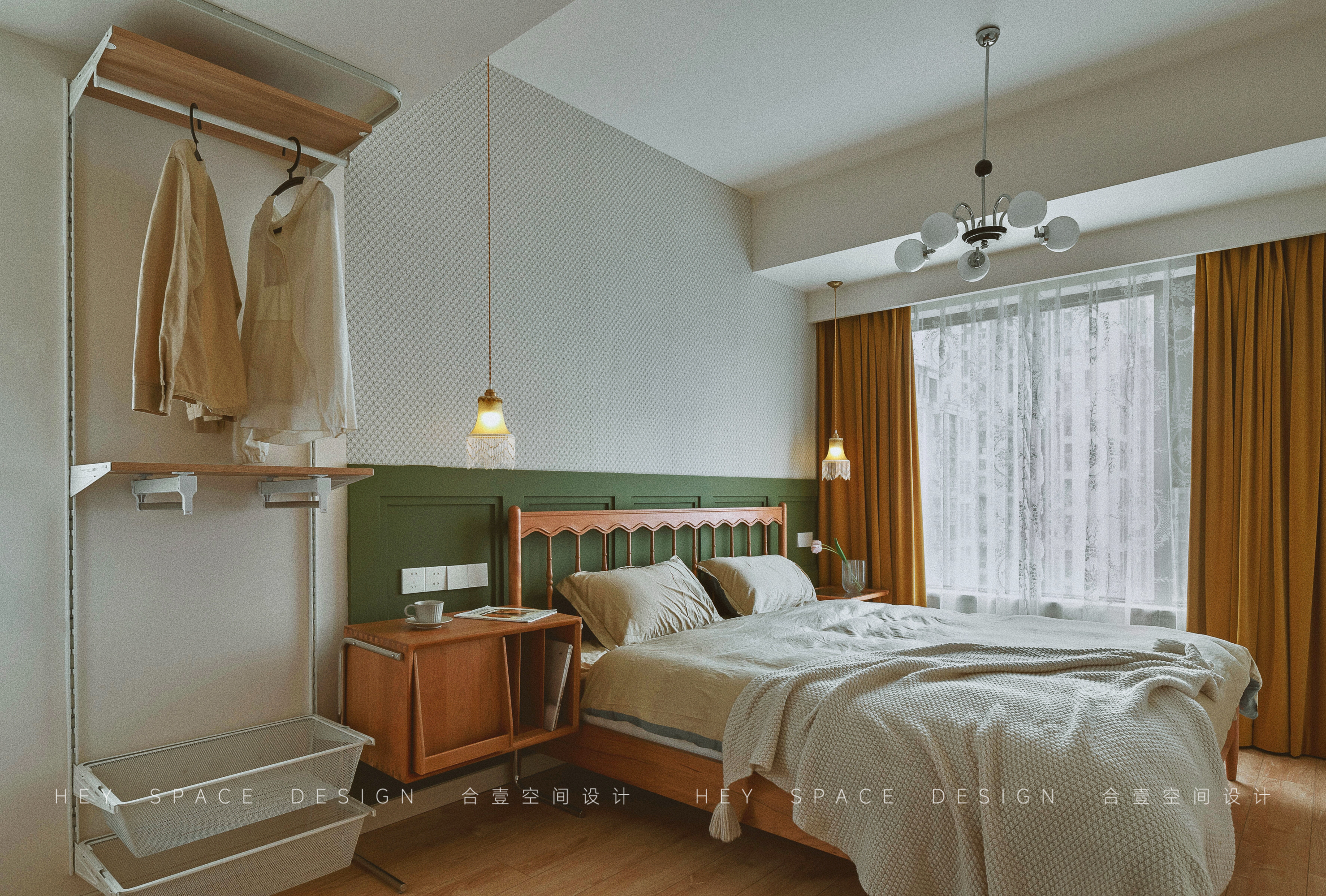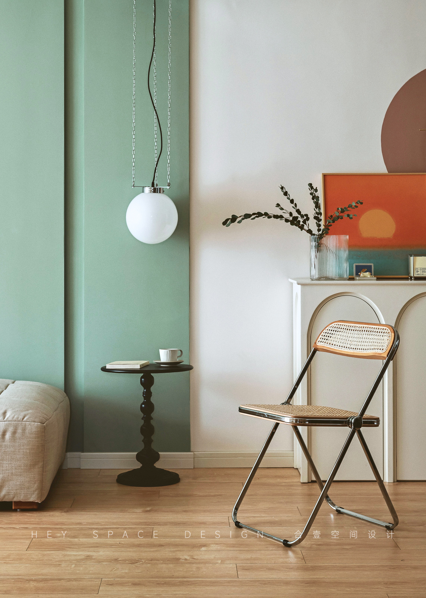 设计选材:整个空间使用了多种不同的颜色的乳胶漆,少量的原木家具,旨在打造出温柔而优雅的复古格调。