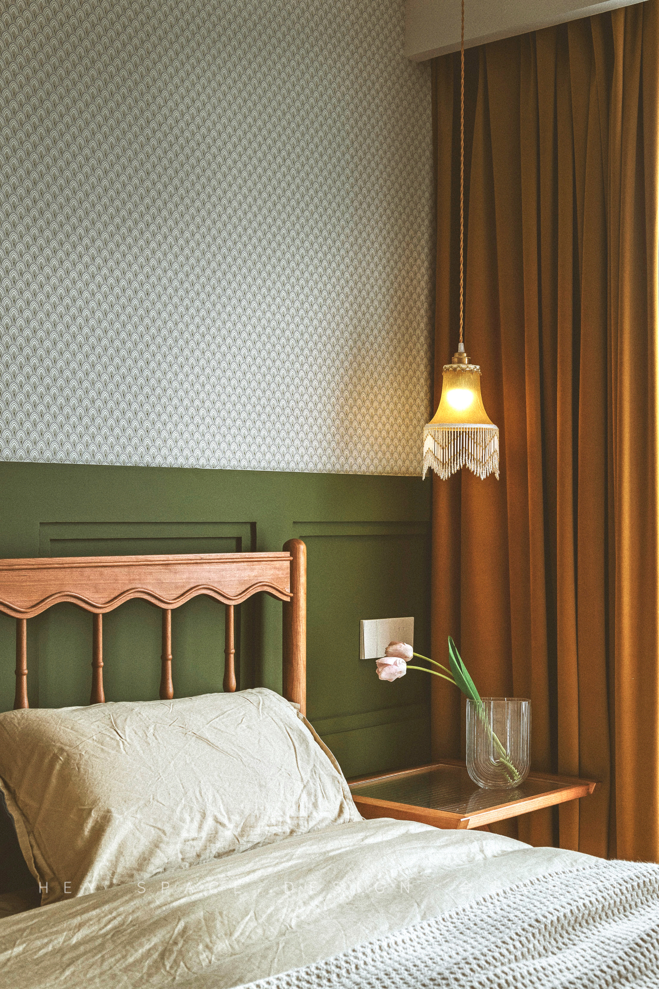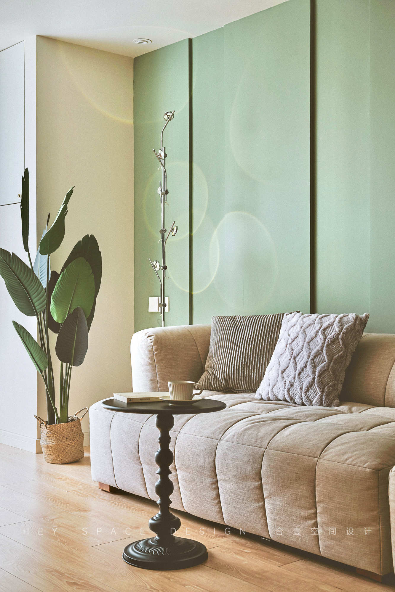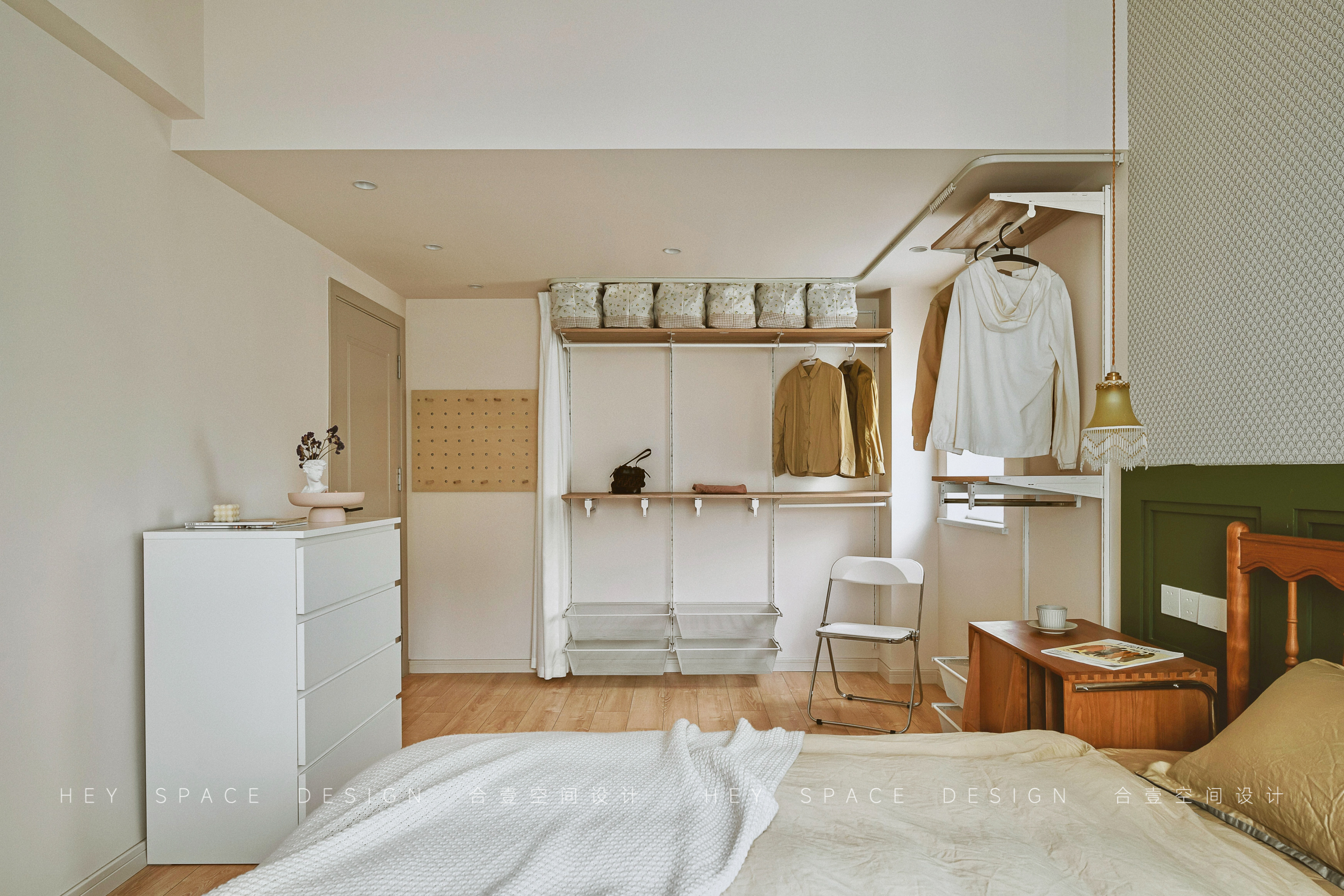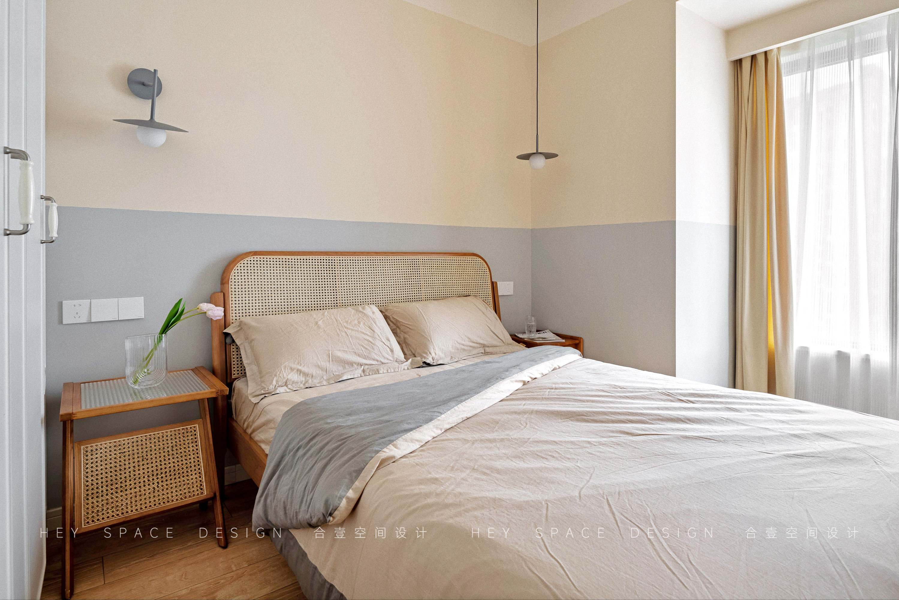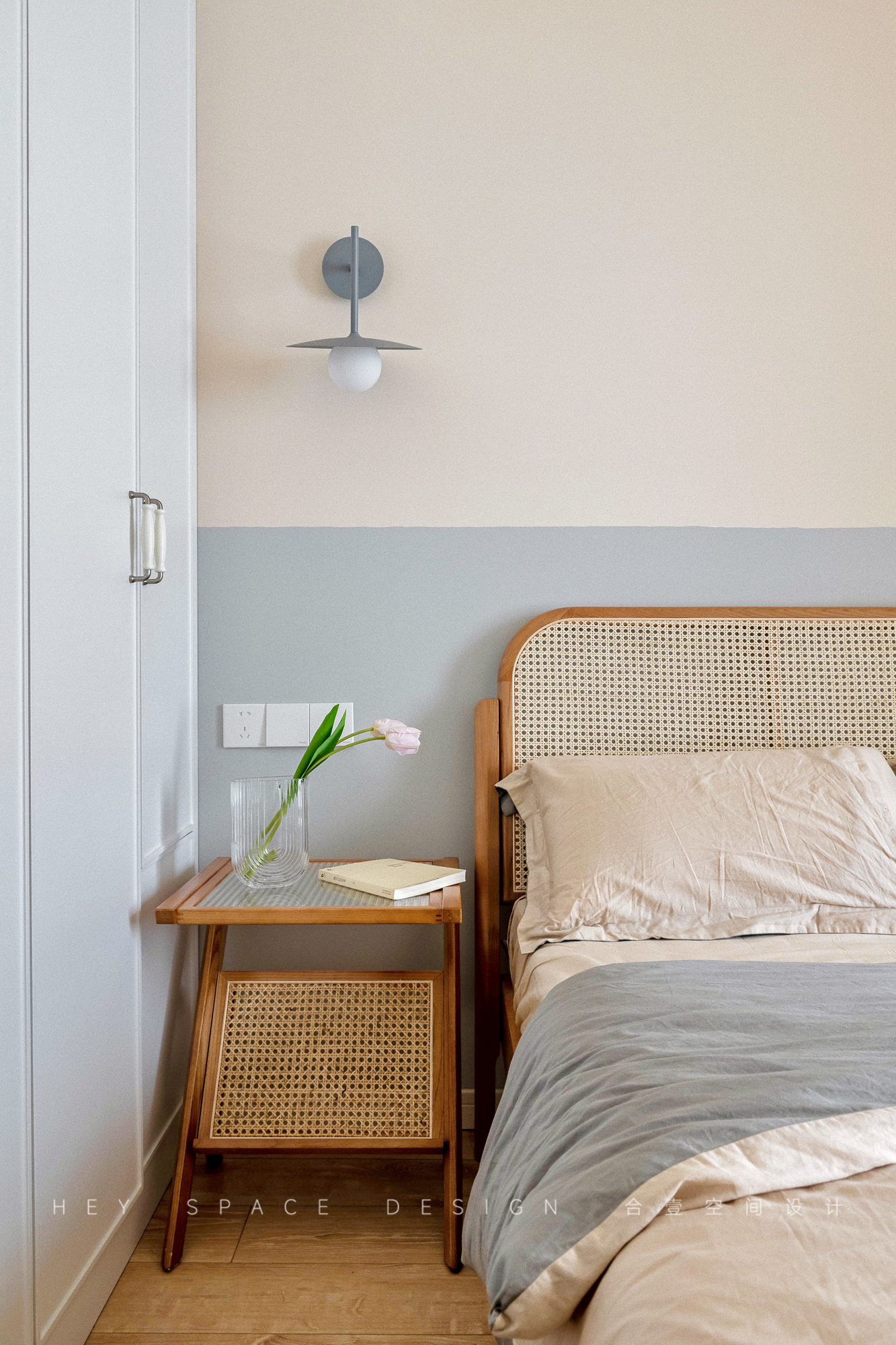设计选材:整个空间使用了多种不同的颜色的乳胶漆,少量的原木家具,旨在打造出温柔而优雅的复古格调。