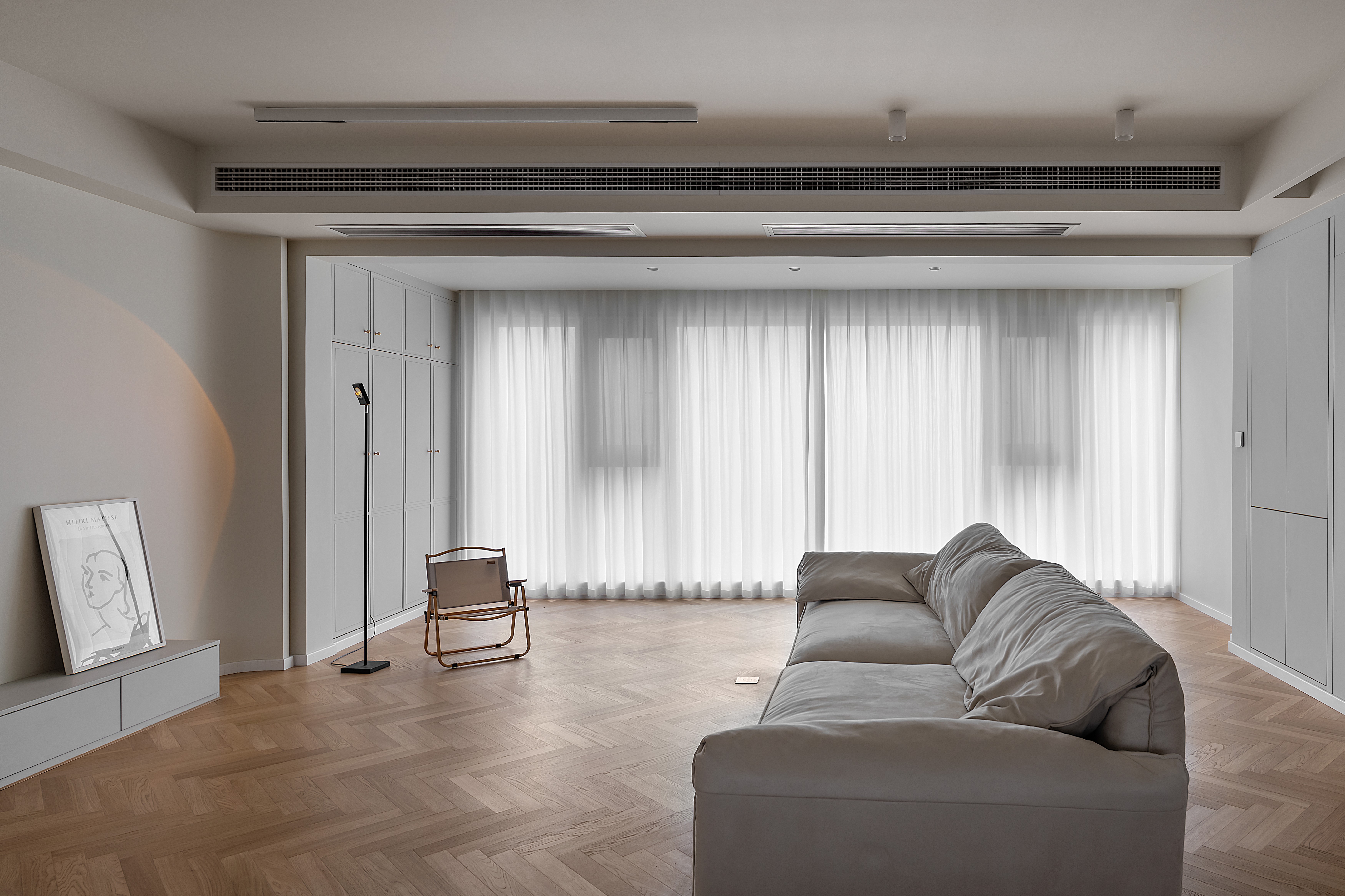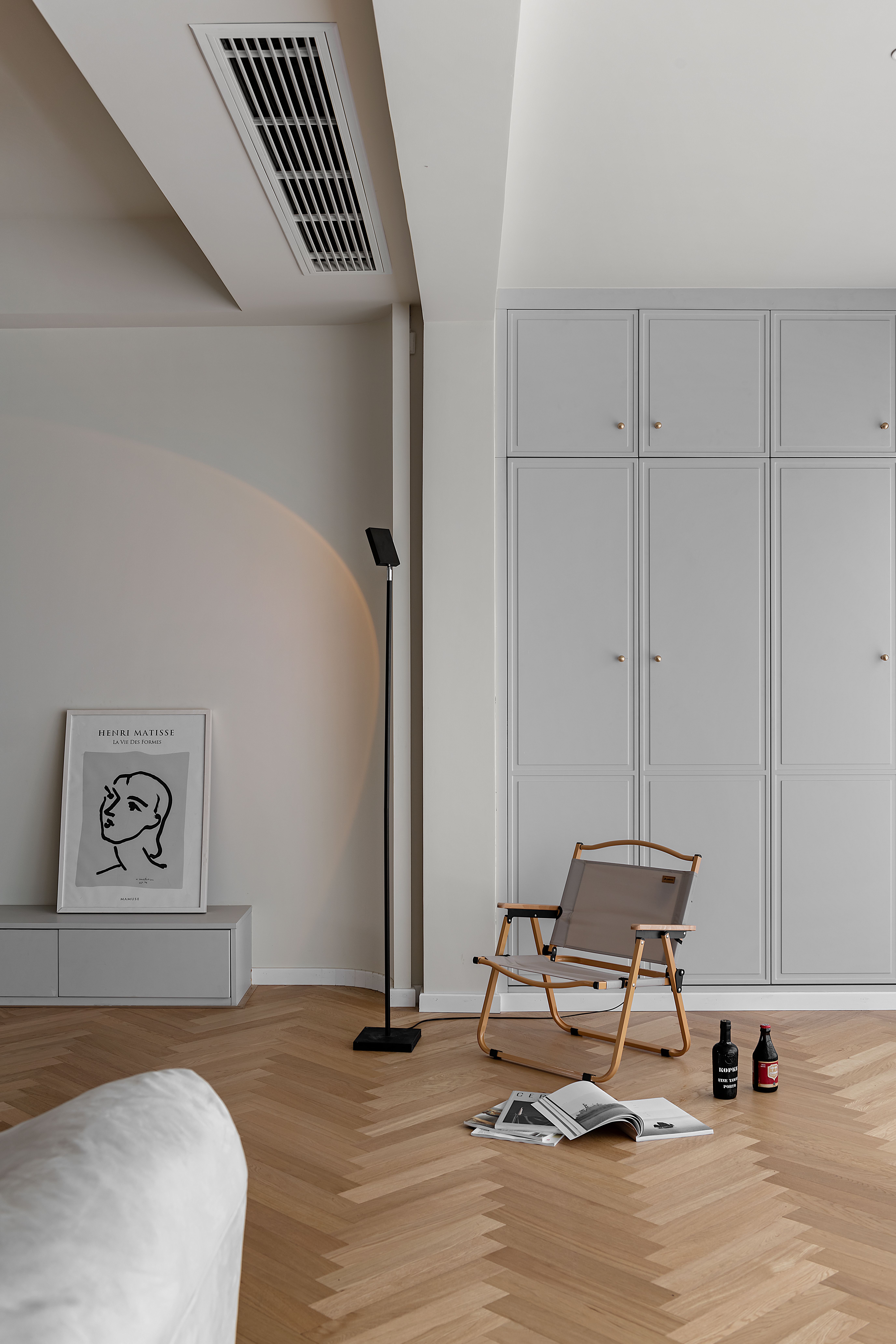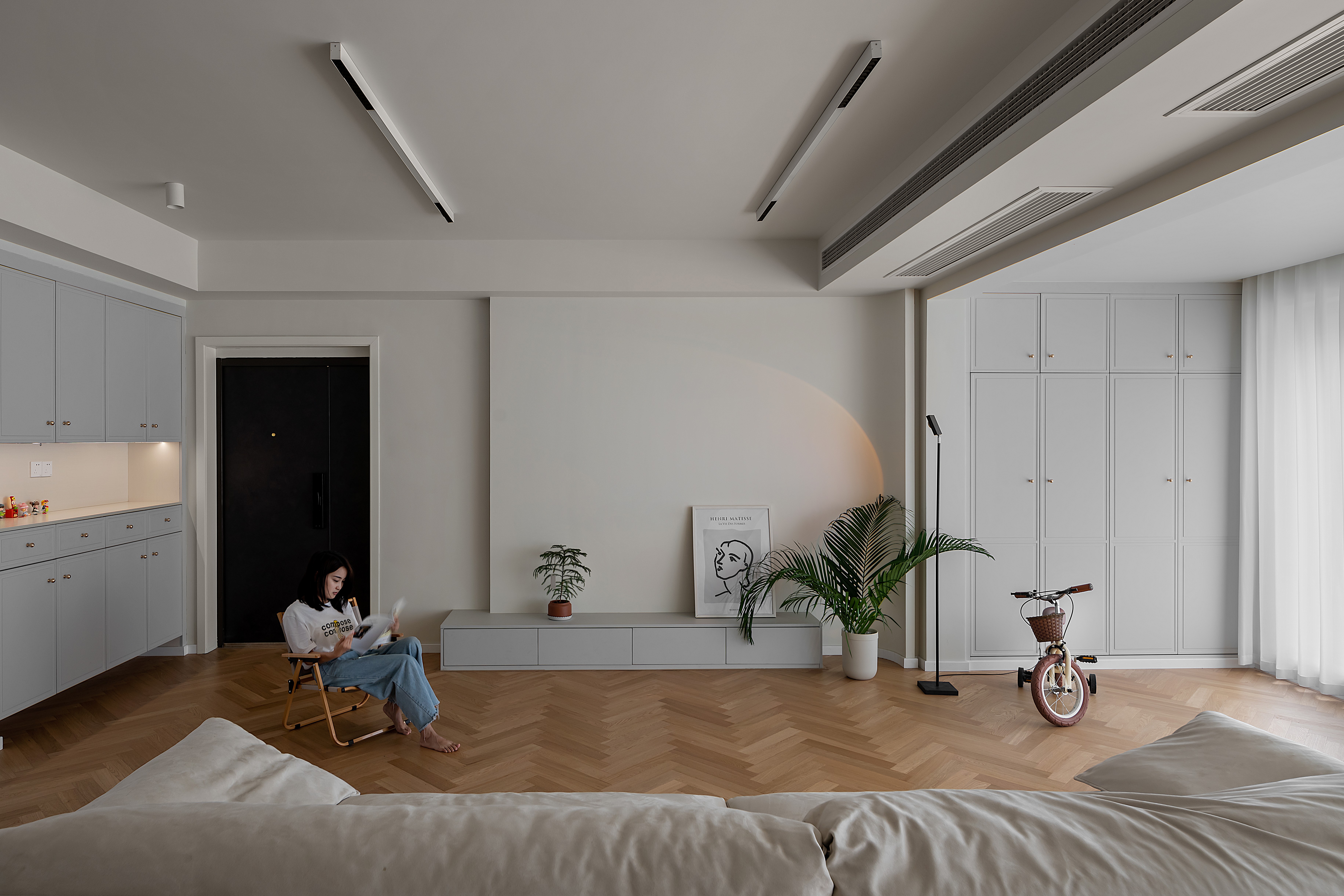 设计选材:本案主要以暖调的奶油色乳胶漆以及满屋通铺的人字拼木地板来打造整体温馨舒适的治愈感。