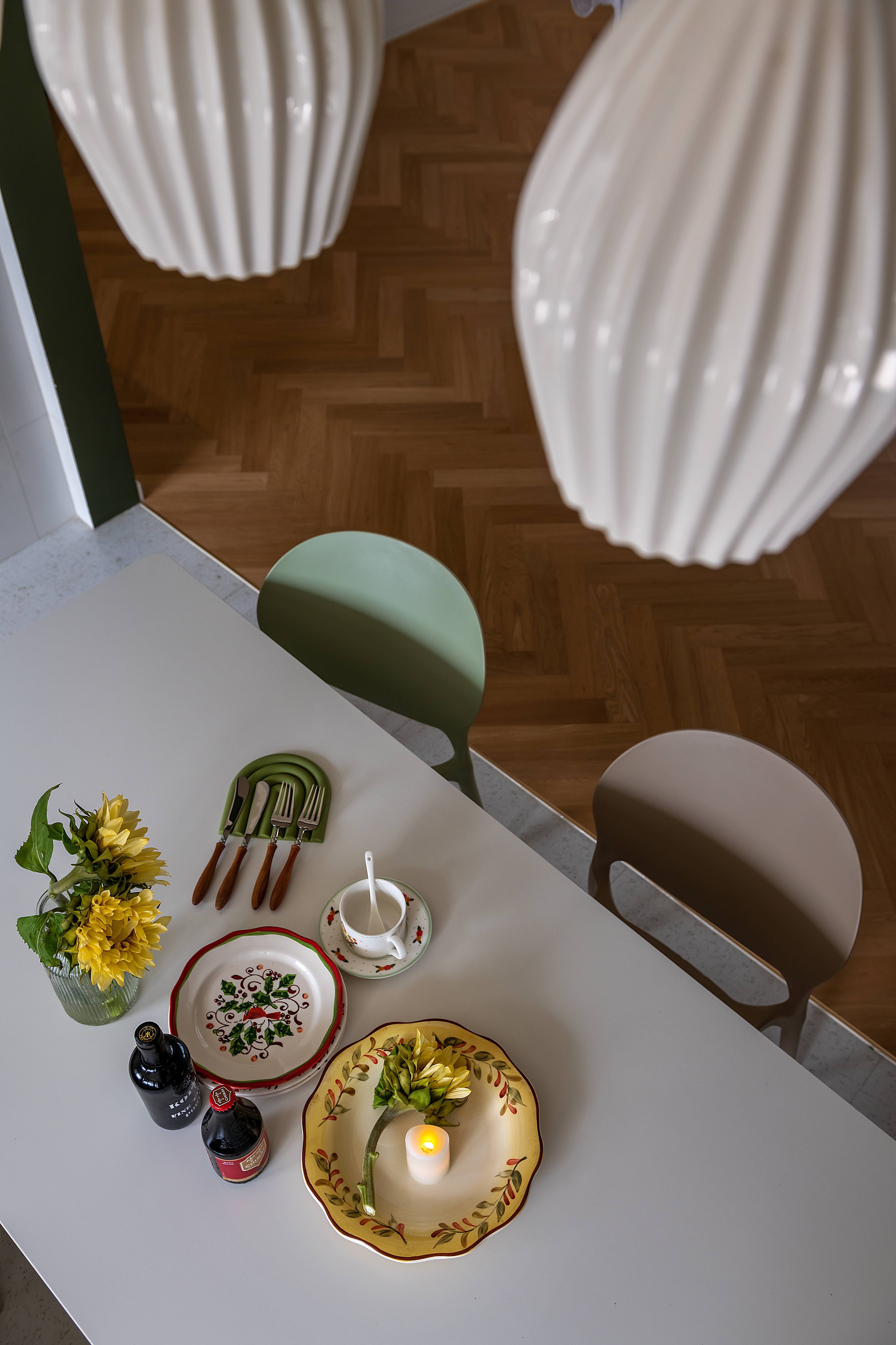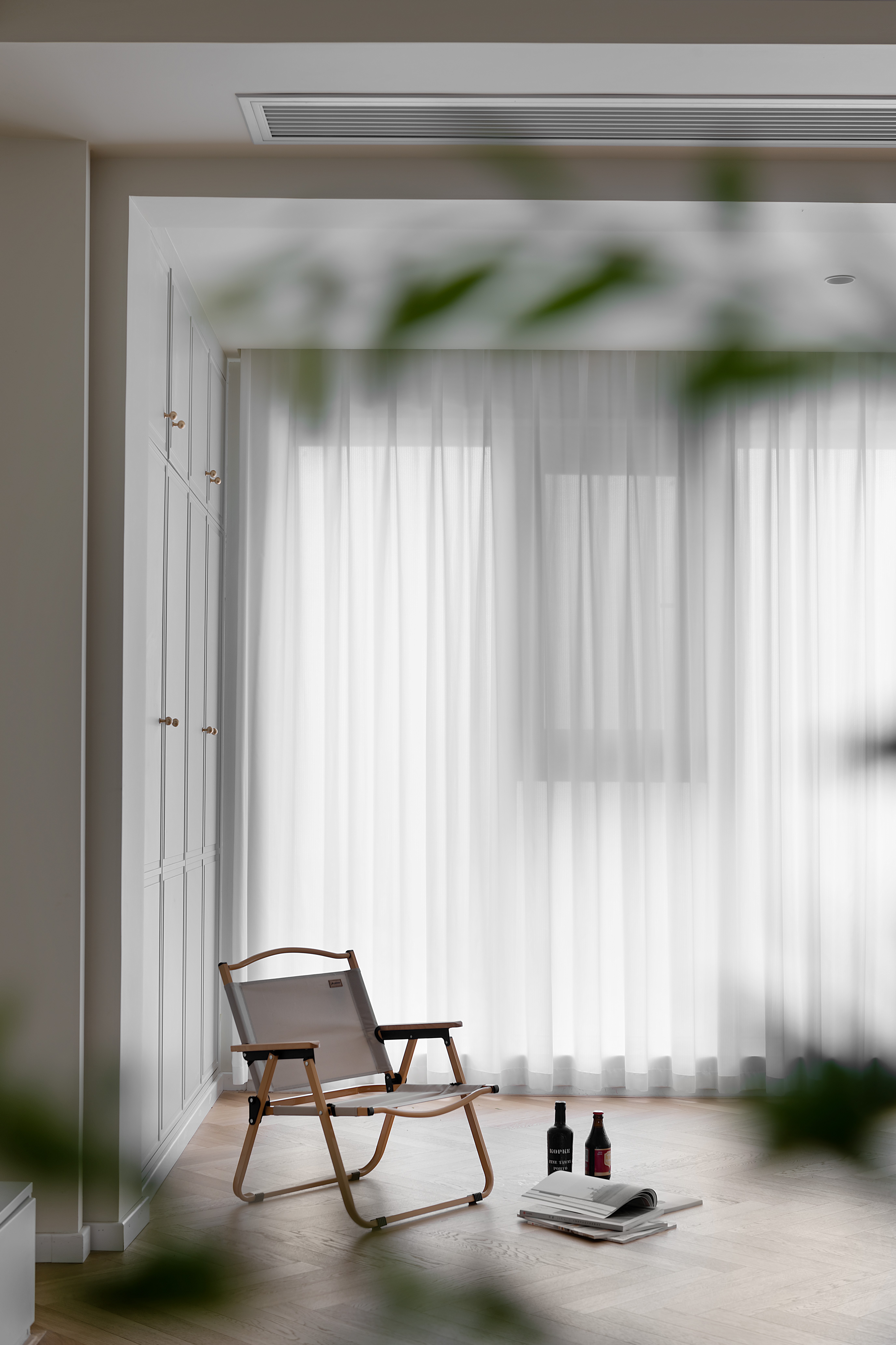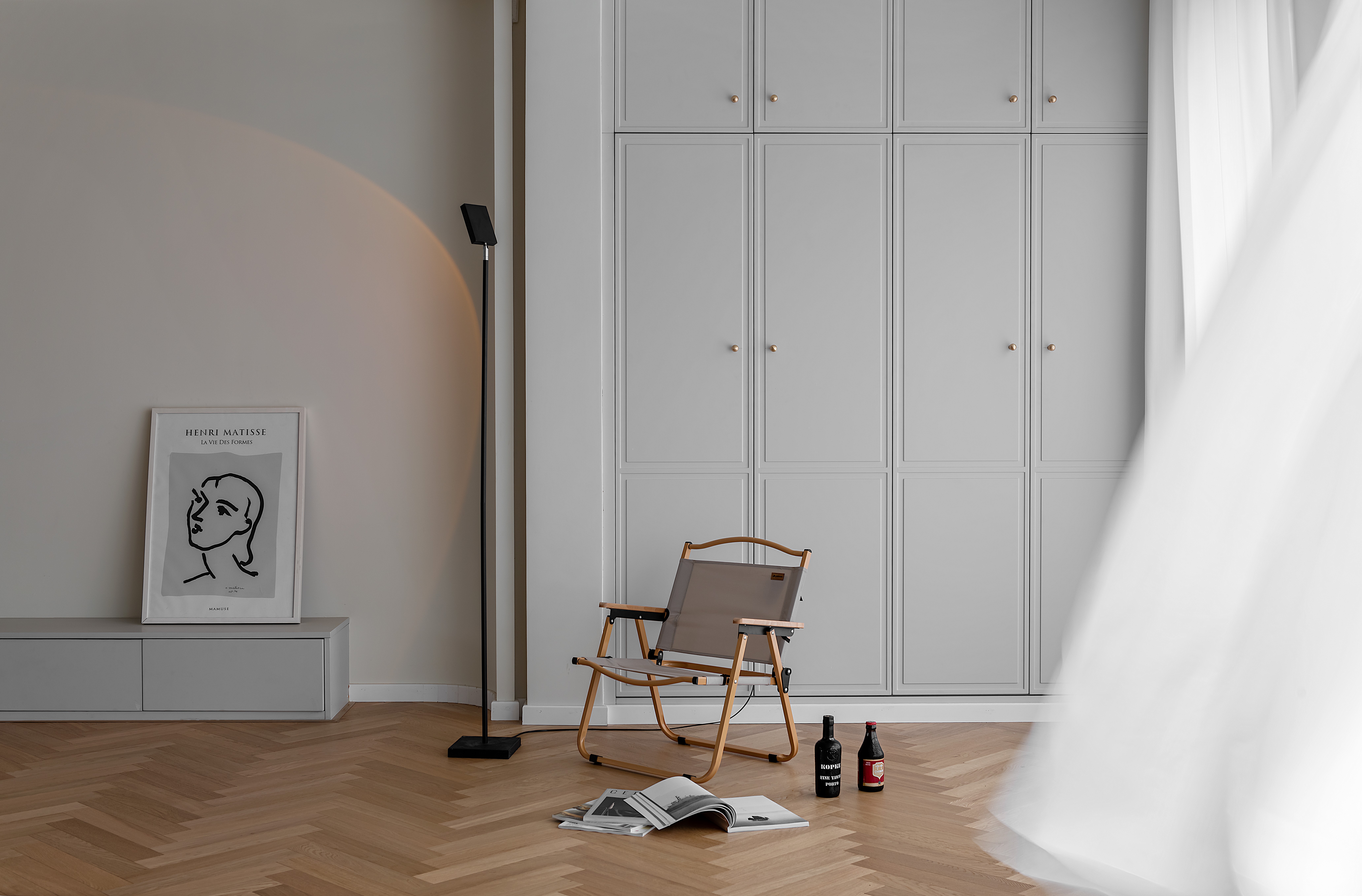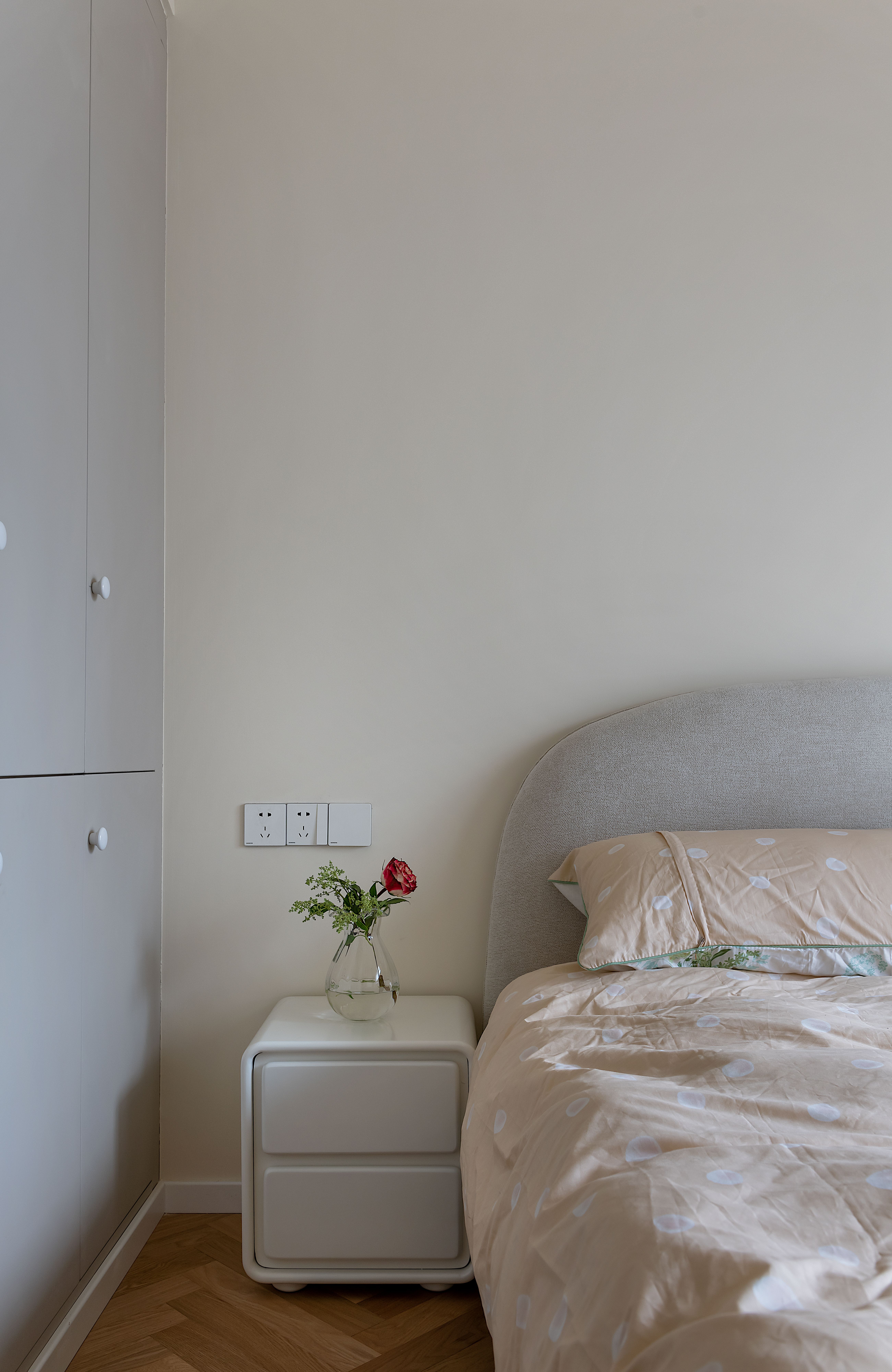 设计选材:本案主要以暖调的奶油色乳胶漆以及满屋通铺的人字拼木地板来打造整体温馨舒适的治愈感。