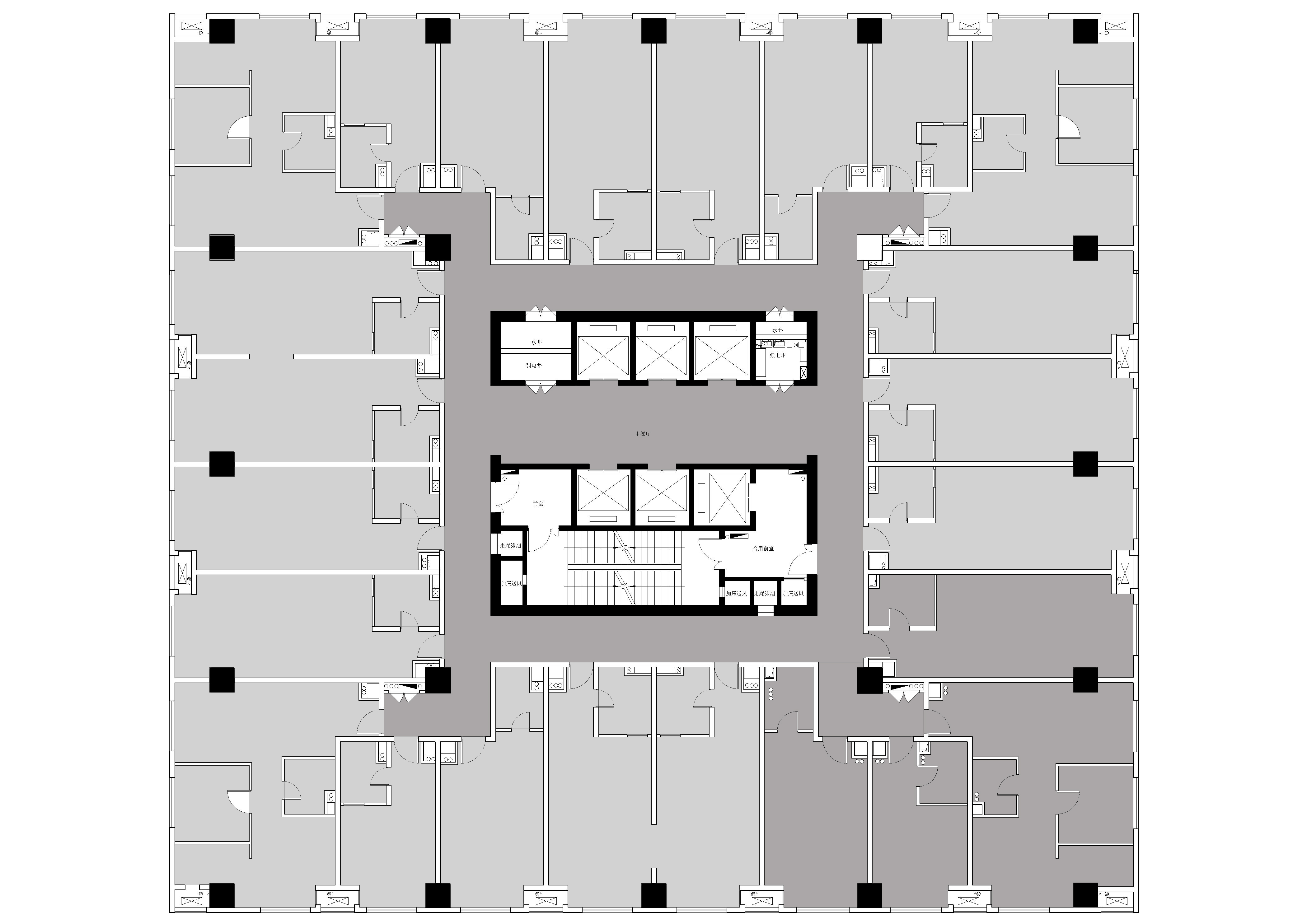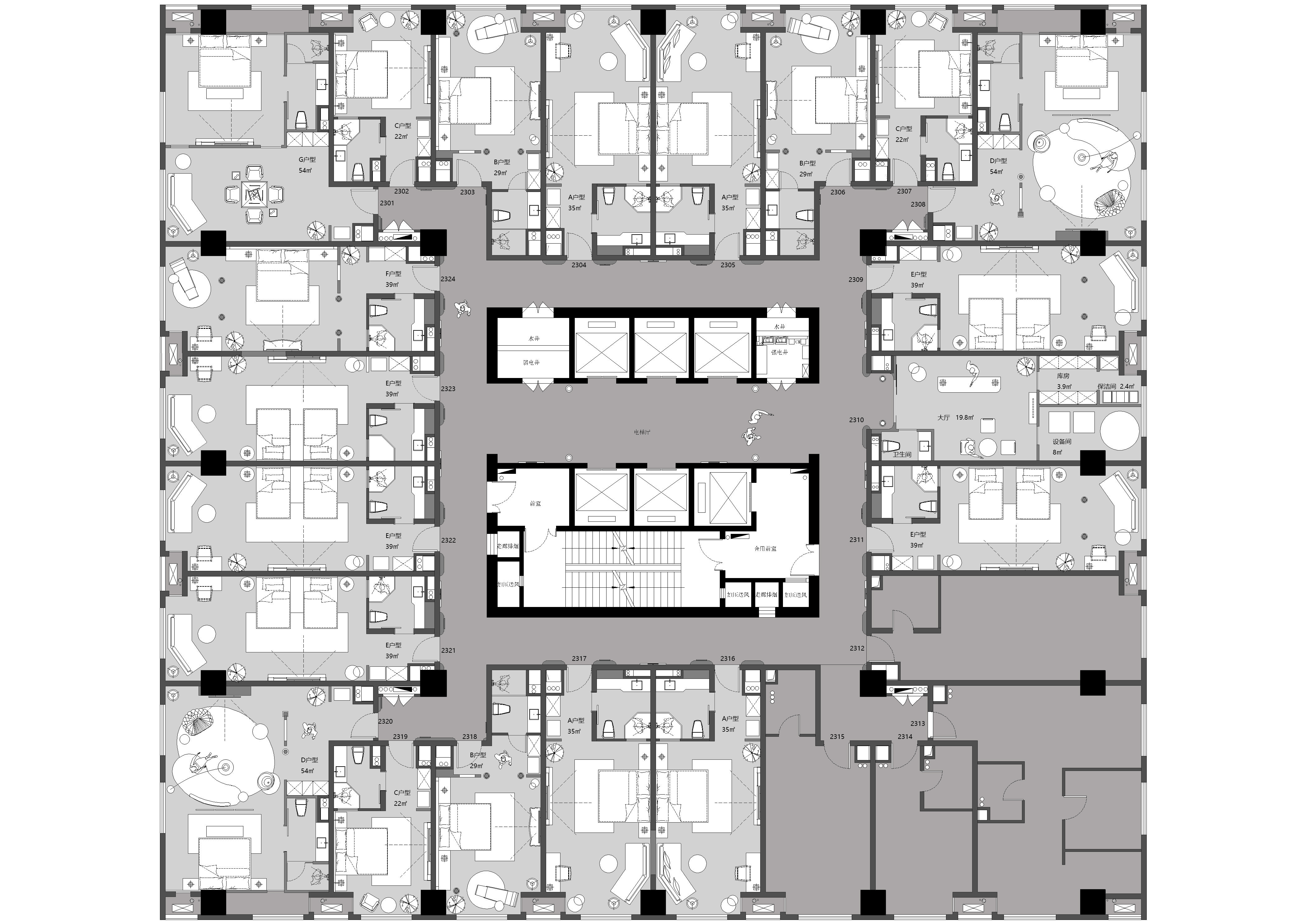 理性的空间流线梳理,便利的走廊方向示意,房间由回字形布局排列,不同角度呈现不同的视觉体验,弧形立面缓解视觉疲劳。