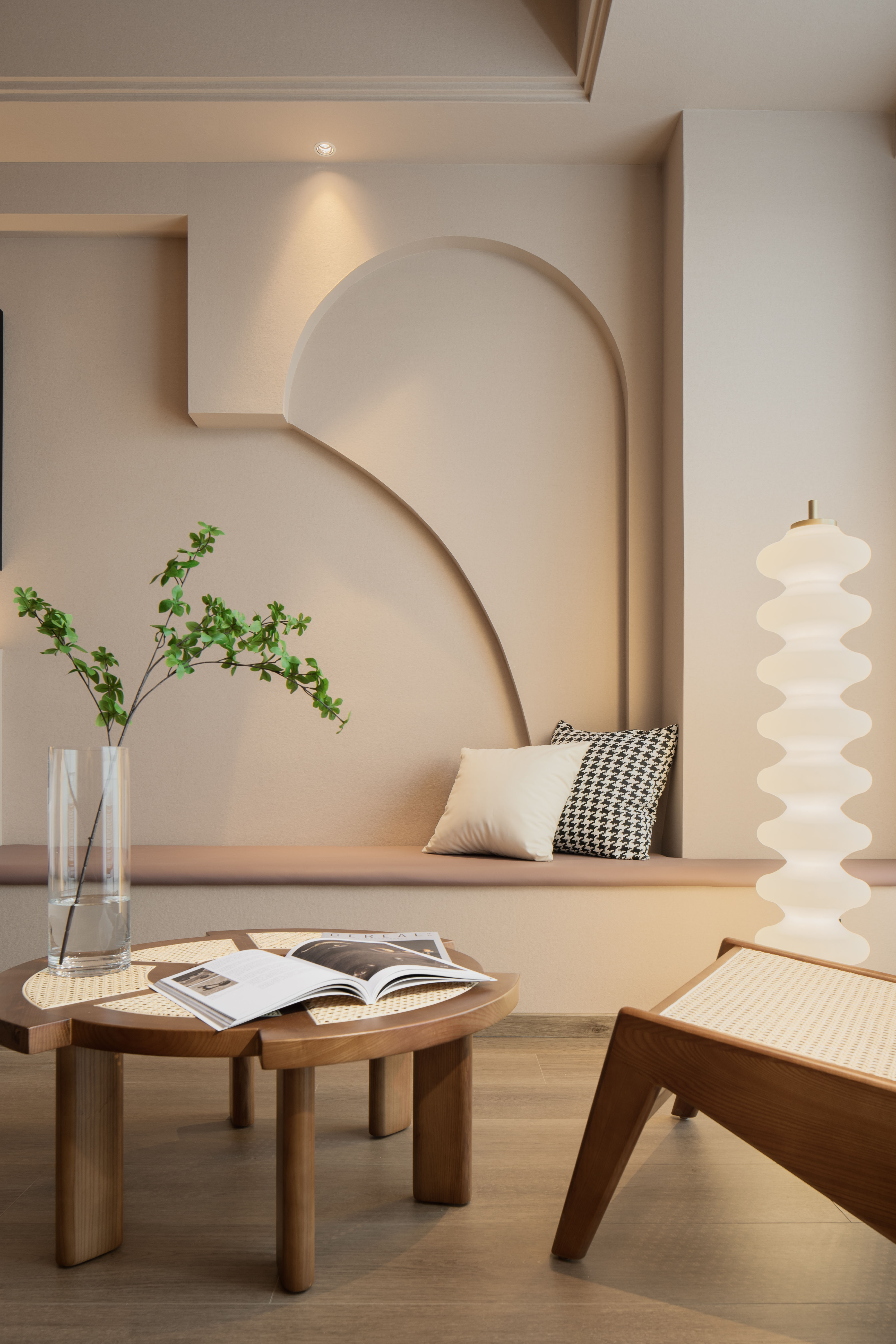 艺术漆空间的肌理环绕,斜面雕塑感造型,自然流畅的表现力,深色的画面底色,浅咖色轻盈布满,墙体装饰紧扣空间主题,温润内敛的空间环境。