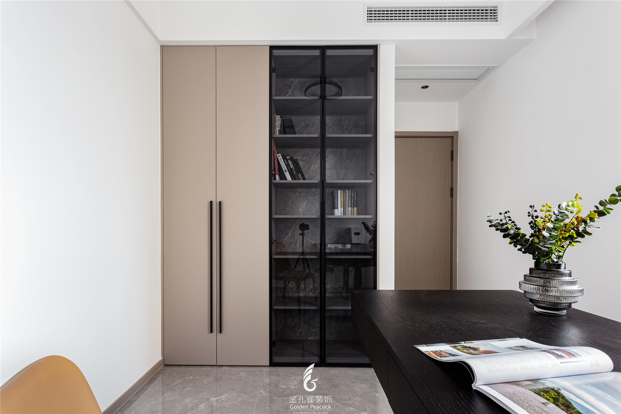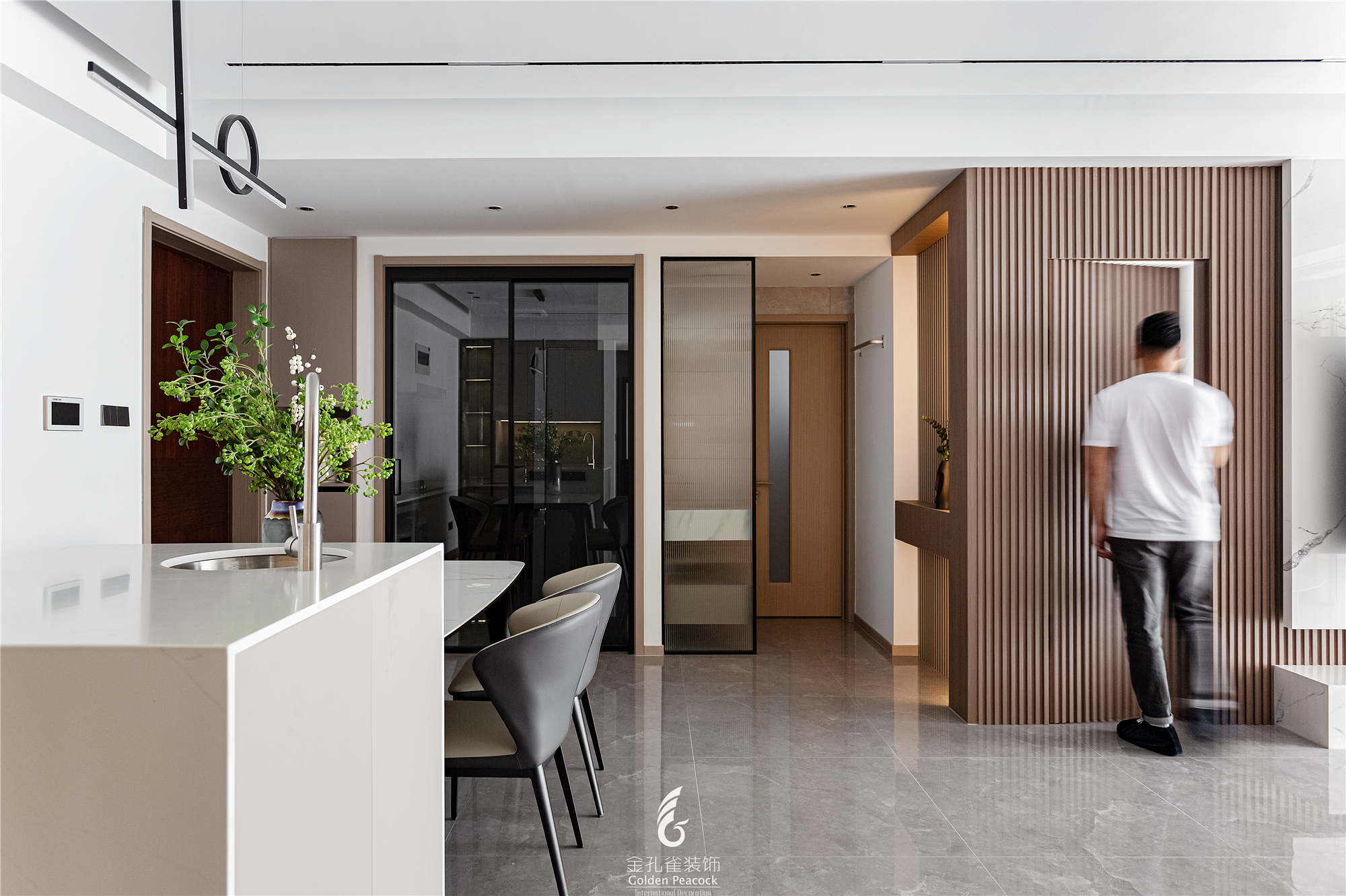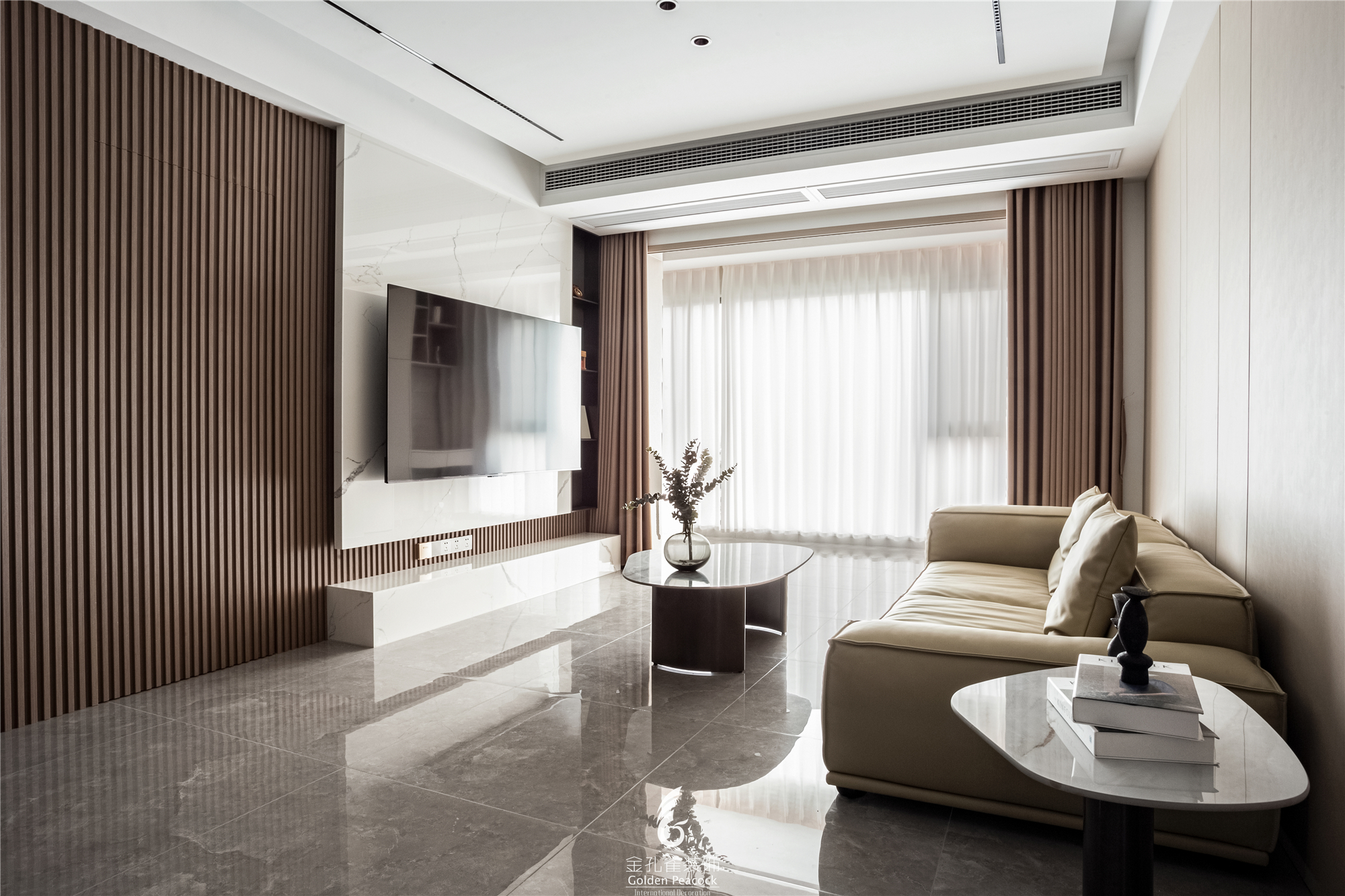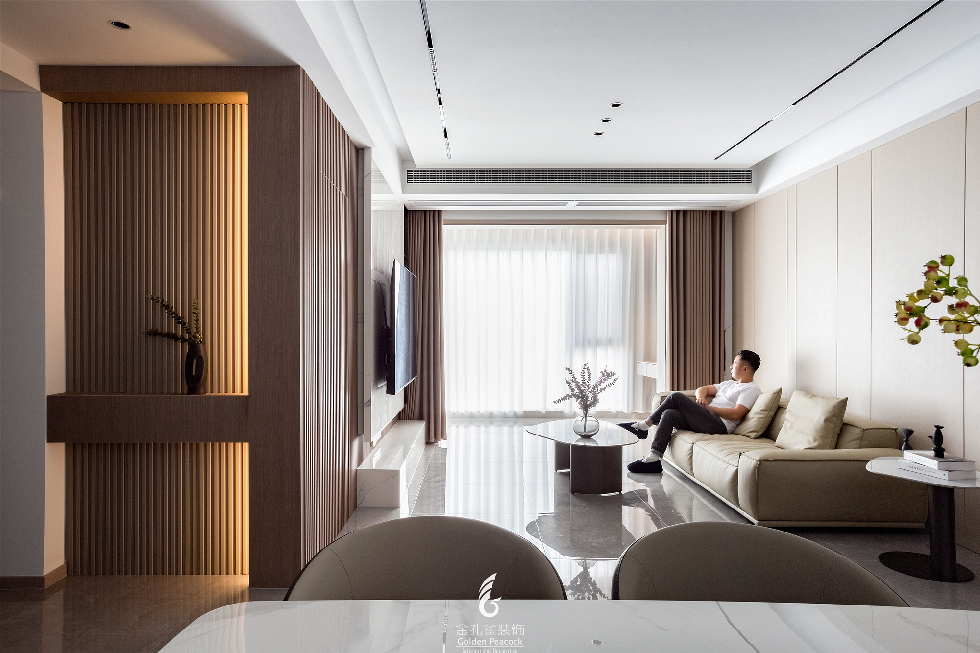 项目定位:客厅,灰白两色为屋主营造简约的空间基调,大理石、木饰面、岩板、玻璃等材质的运用,突出极简现代的品质感。