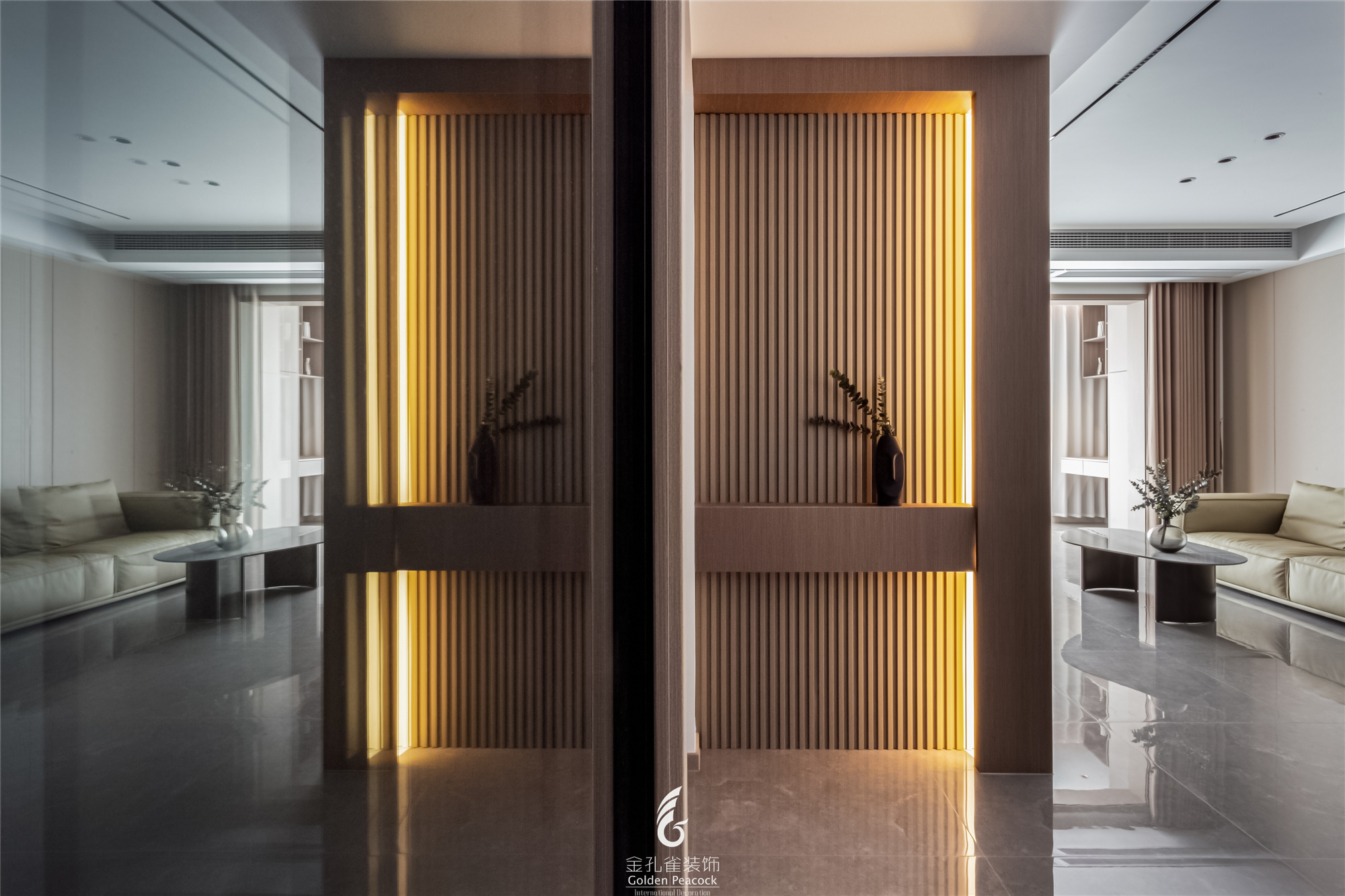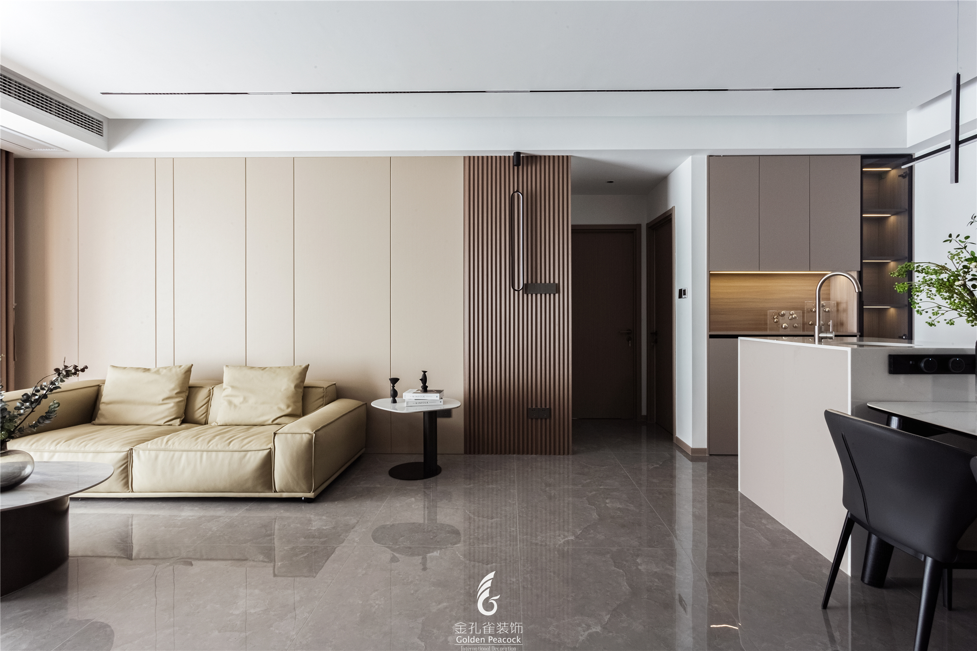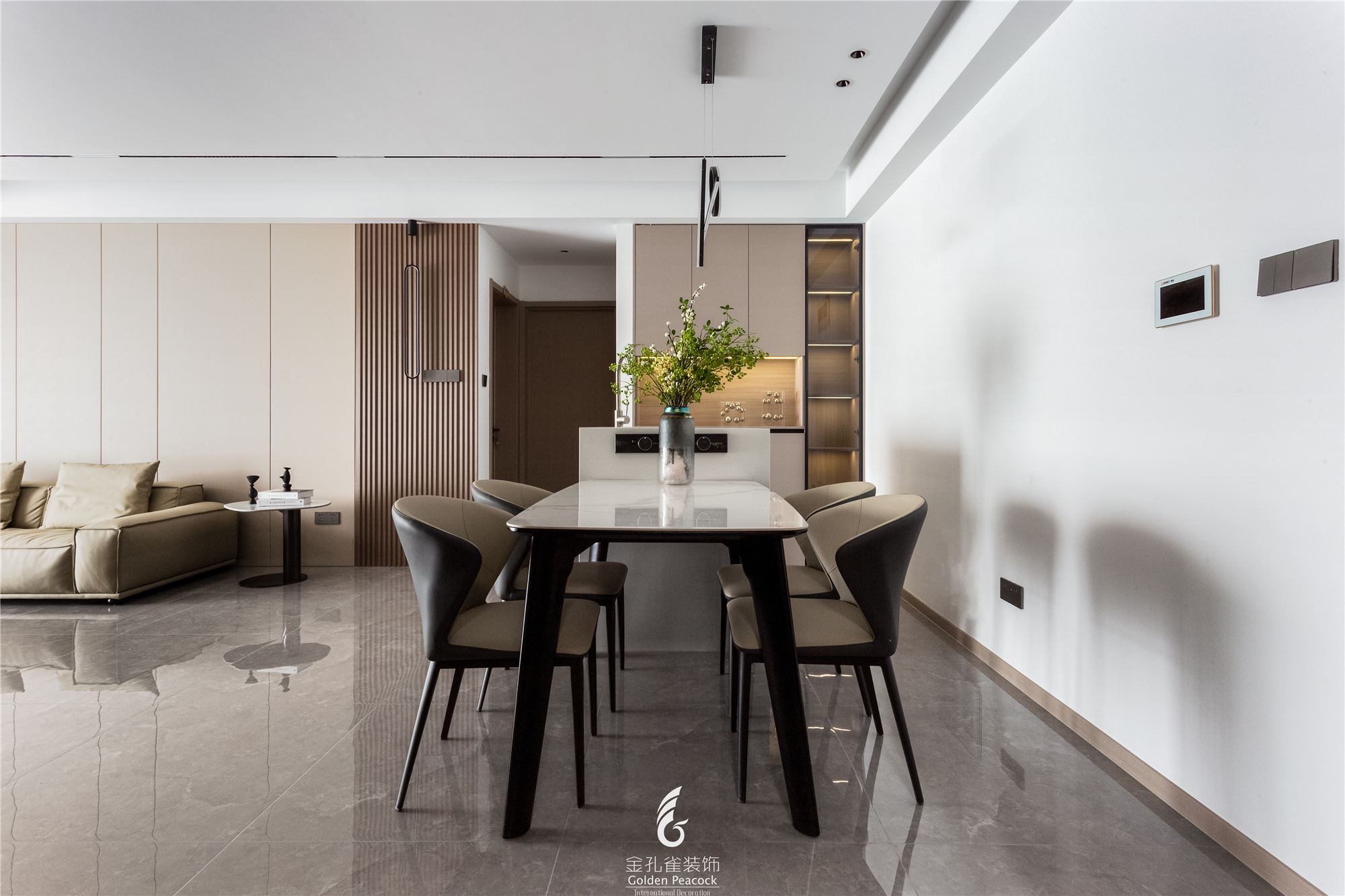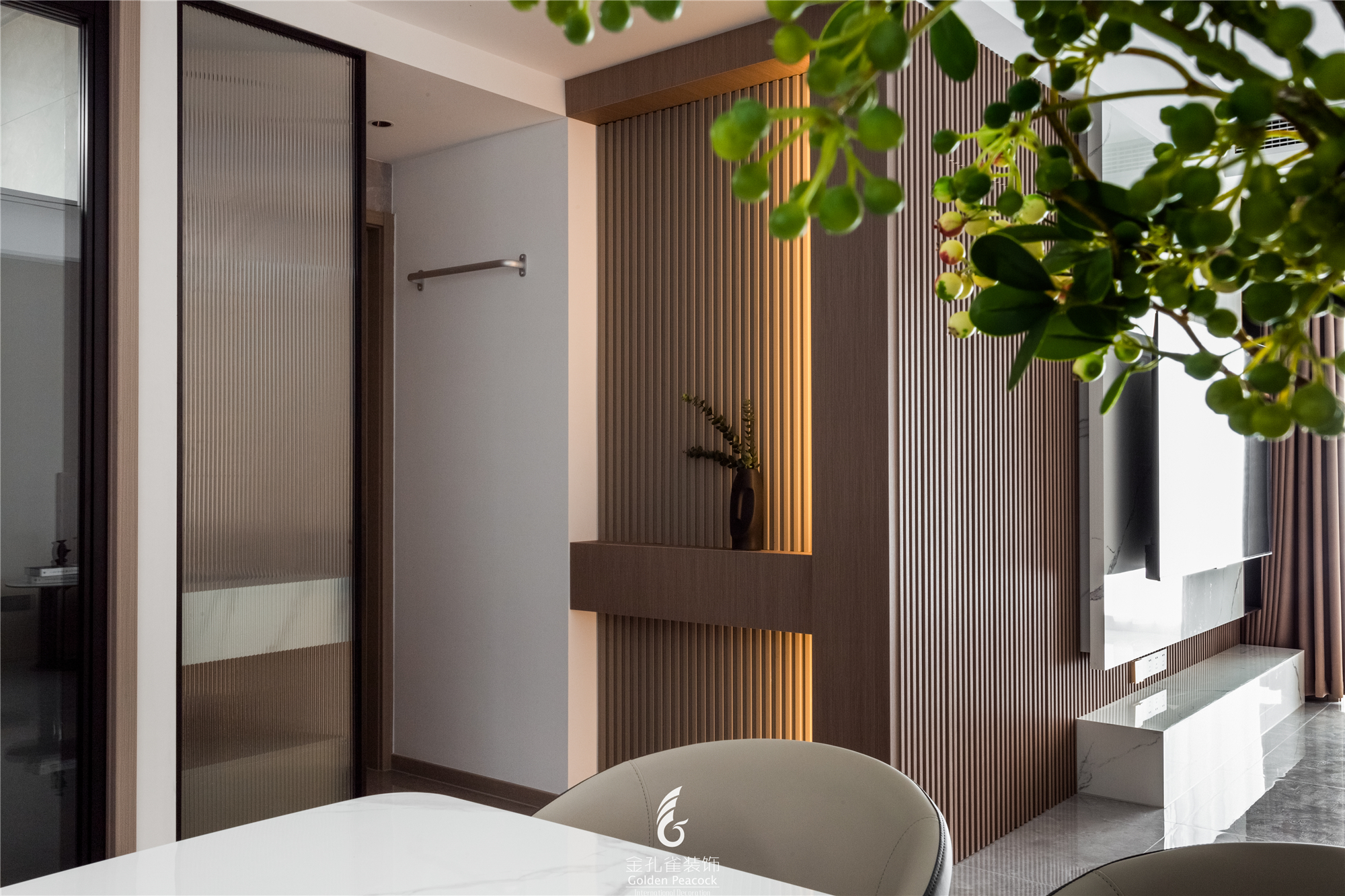 岩板背景墙结合木格栅,让人游走现代的时尚格调中,营造出一个条理有序的生活场景。 -